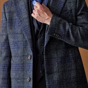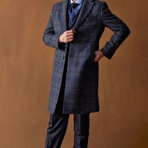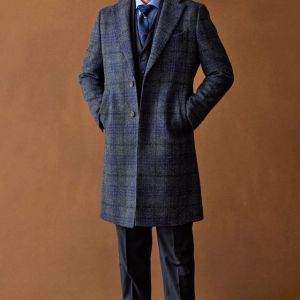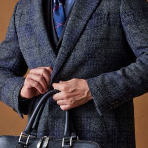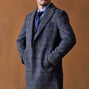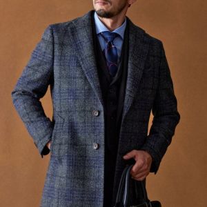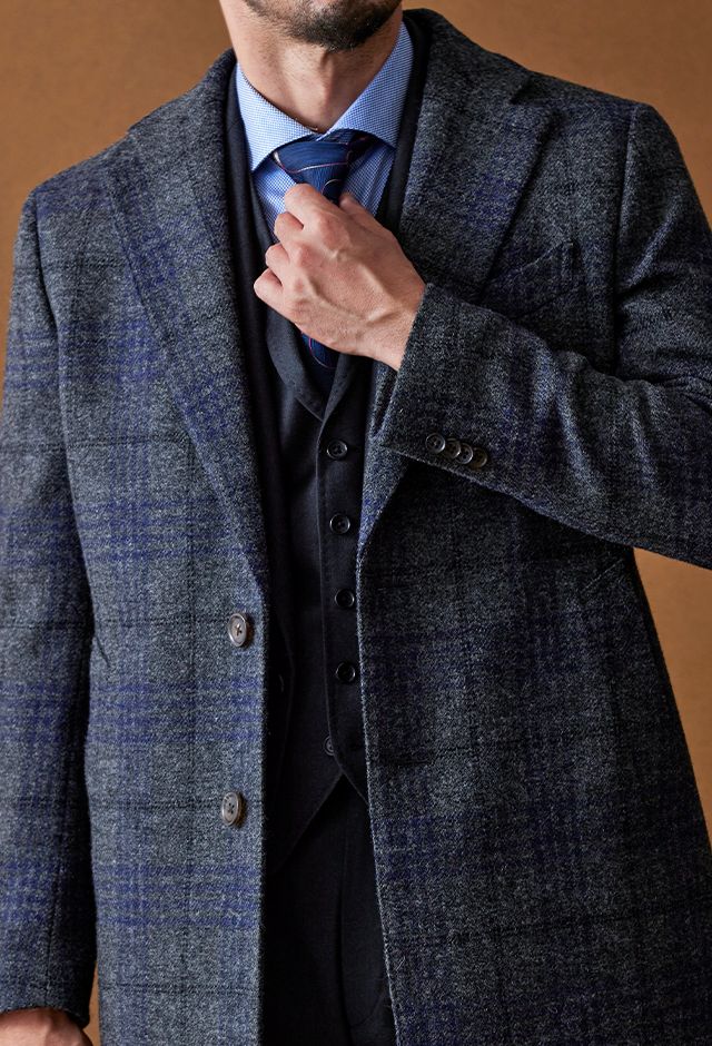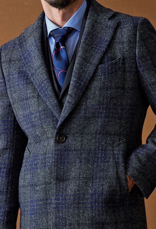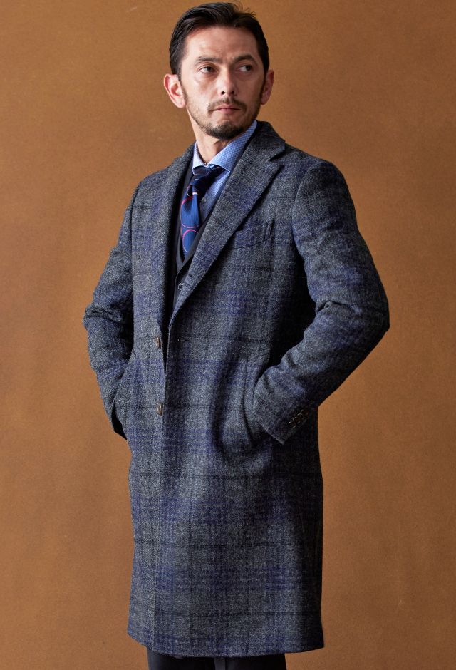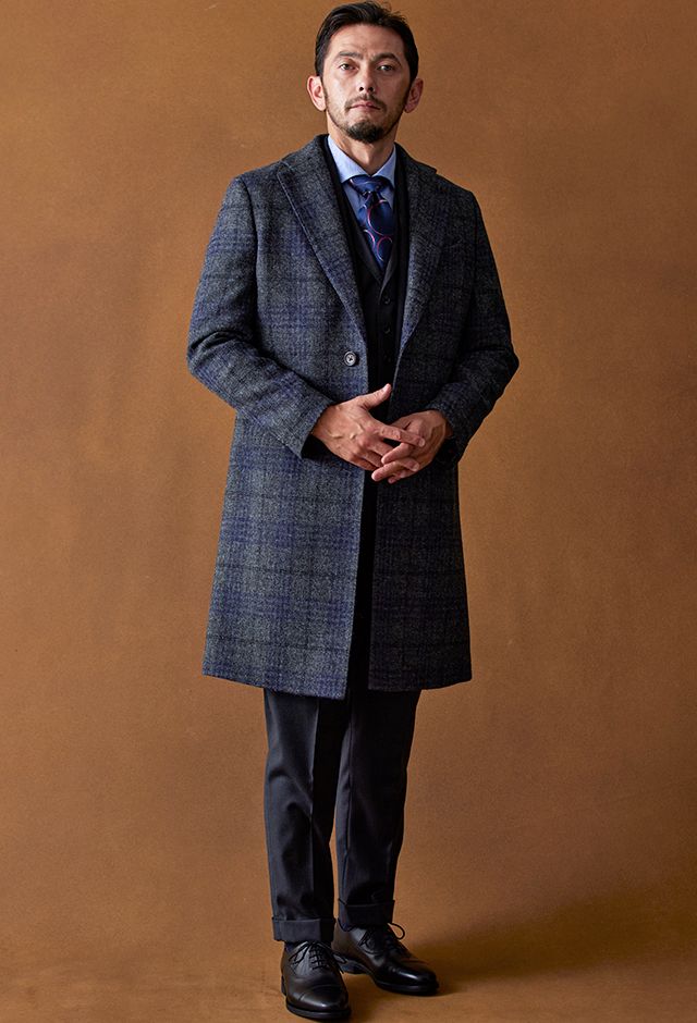 フランネルの創設者として公認されているイギリスの高級ブランド「フォックスブラザーズ」で仕立てたコートです。ビジネスでも華美になりすぎないようなチェックで、上品でありながらカジュアルにも合わせることができる歴史のあるチェスターコートモデルで仕立てました。膝上の使いやすい丈感で、ハコポケットで全体的に扱いやすいスタイルに。ボタンは黒色で引き締め効果を。シャツは同系色のブルー系で統一感を出してます。ブラウン系の革靴とも相性が良いです。