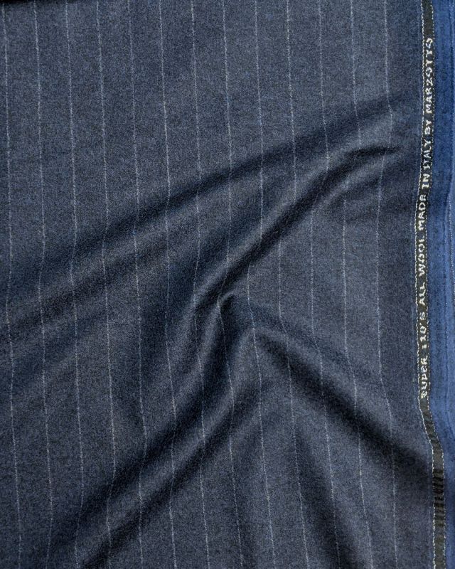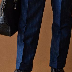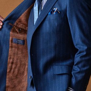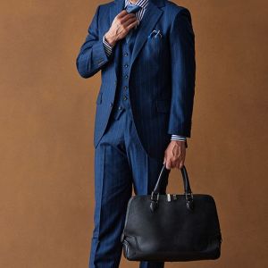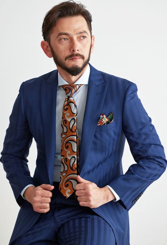 トレンドをふんだんに取り入れたデザイン性が特徴の「マルゾット」で仕立てたスーツです。光沢感のある使いやすいピッチのストライプ柄で、秋冬シーズンの生地になります。クラシックな部分とセクシーさを融合したモダンクラシックモデルで仕立てました。ビジネスにも使いやすいオシャレなブルー系の生地にブラウン系の裏地を合わせて、アズーロ・エ・マローネでお洒落な組み合わせを。ベストを脱いでも様になるスタイルです。ネクタイやシャツなど、全体的にブルー系にすることで統一感を出しております。