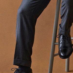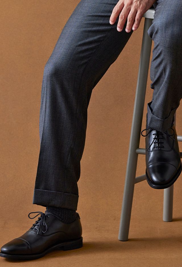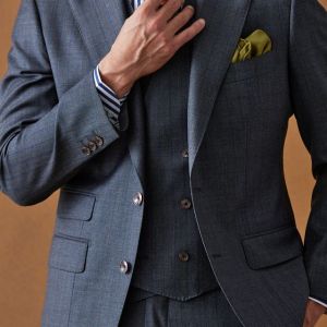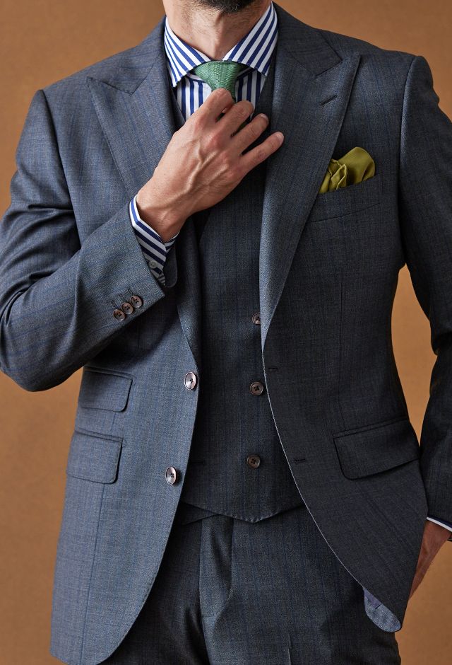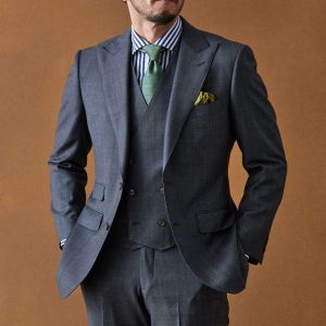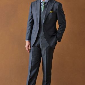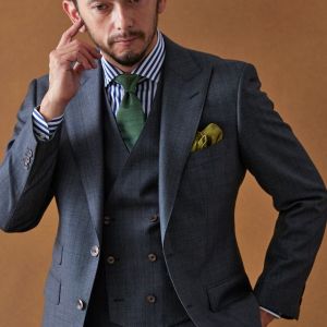 高品質でコストパフォーマンスに優れたイタリアブランド「カノニコ」で仕立てたスーツです。落ち着いたチャコールグレーの生地で、オールシーズンの生地になります。最高峰グレードの「カイザーモデル」で極上の着心地を味わうことが出来ます。スリーピースでクラシカルな雰囲気に加えて、ダブルベストでさらに重厚感を加えています。ダブルのベストは襟なしでカッチリしすぎないようにしているのもポイント。シンプルなグレースーツにネイビーシャツ、グリーンネクタイ、イエローチーフのコントラストが映えるコーデです。