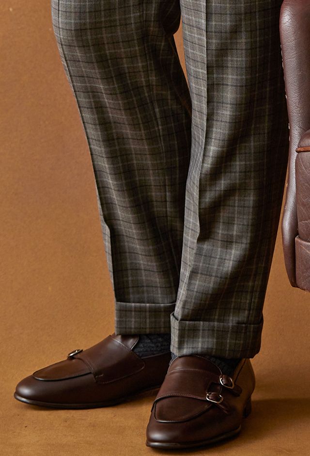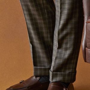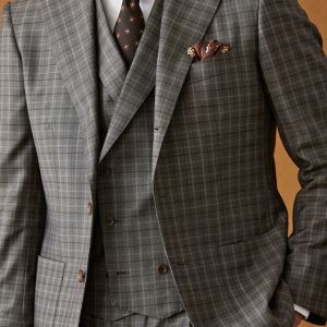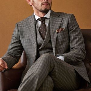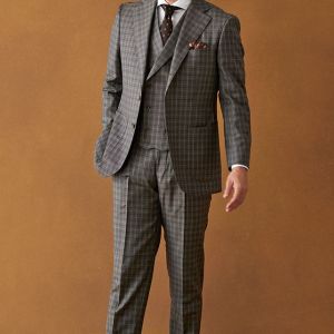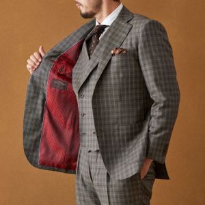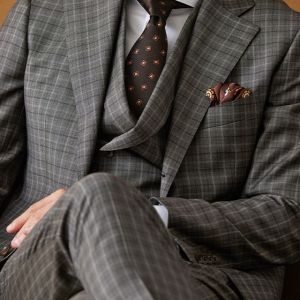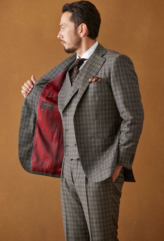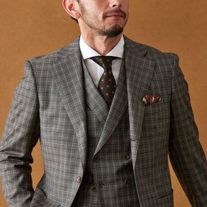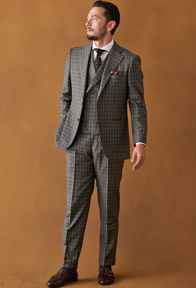 高品質でコストパフォーマンスに優れたイタリアブランド「カノニコ」で仕立てたスーツです。細かいチェックが特徴の生地で、オールシーズンの生地になります。カイザーレジェロモデルで、一度羽織ると手放せなくなる軽い着心地を感じていただけます。スリーピースでクラシカルな雰囲気に加えて、襟付きのダブルベストでさらに重厚感を加えています。アウトポケットでカジュアルさを出しているのもポイント。無地のシャツとの相性が良く、ホワイトやブルーの生地と合わせると組み合わせしやすいです。