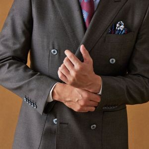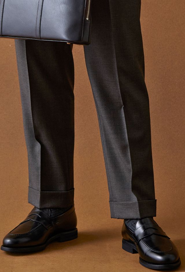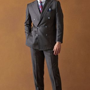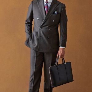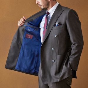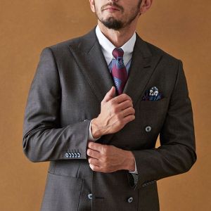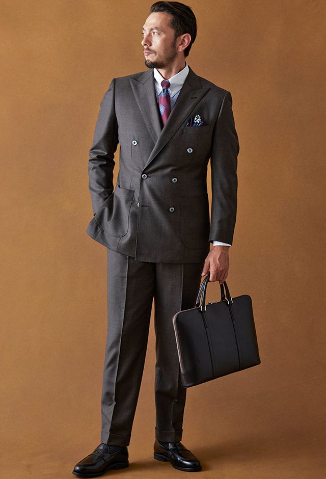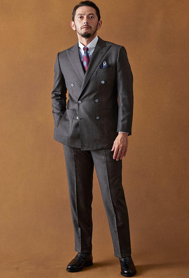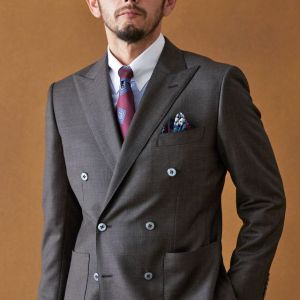 イタリアの高級生地ブランド「クロス エルメネジルド ゼニア」で仕立てたスーツです。艶感が際立つ表情のあるシャークスキンのブラウン無地で、オールシーズンの生地になります。最高峰グレードの「カイザーモデル」で極上の着心地を味わうことが出来ます。重厚感のあるダブルをブラウンで柔らかい印象に。裏地も遊びを入れつつボタンはスーツから外しすぎないようにして着回ししやすい1着に。クレリックシャツで首元に華やかさを加えているのもポイントです。