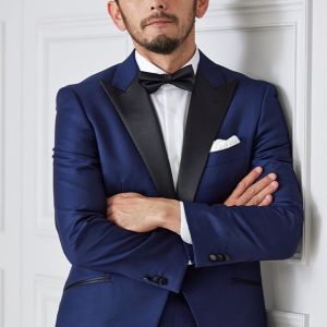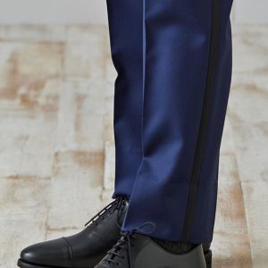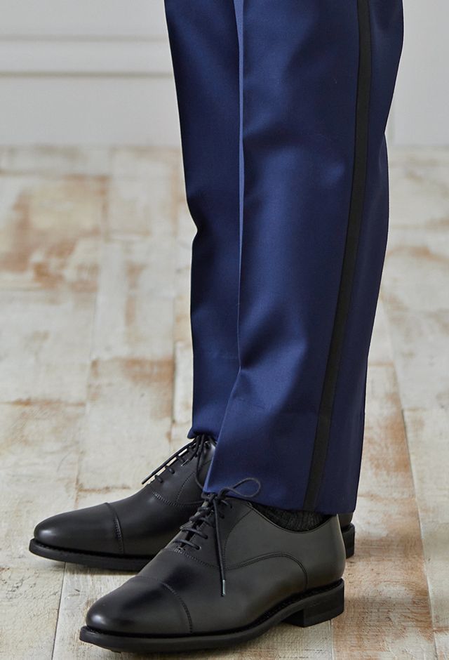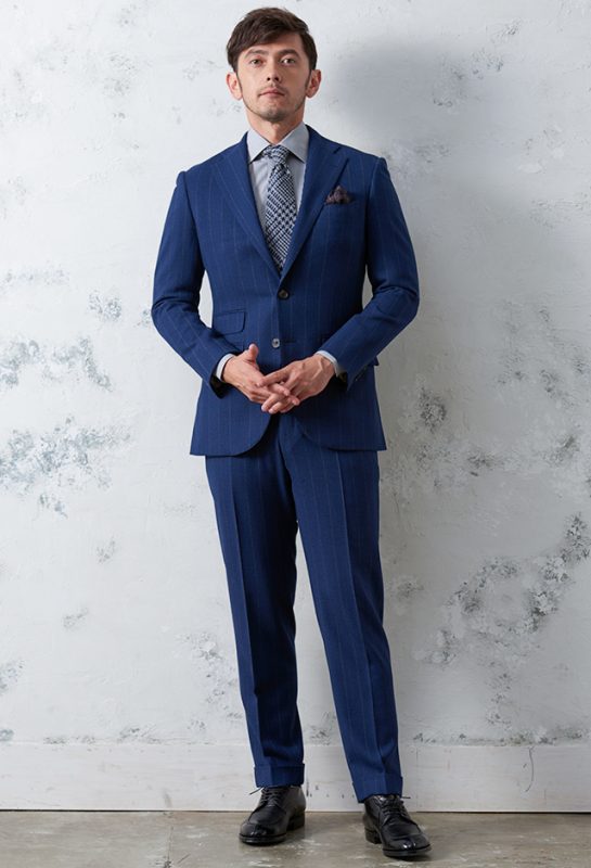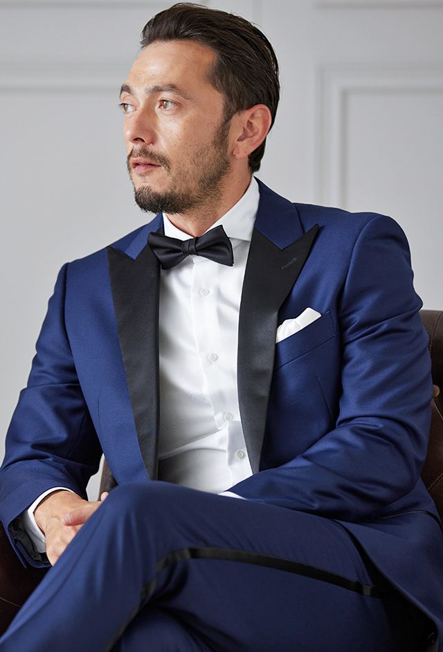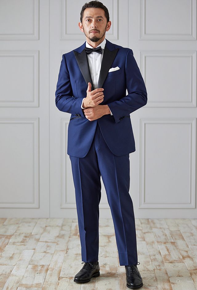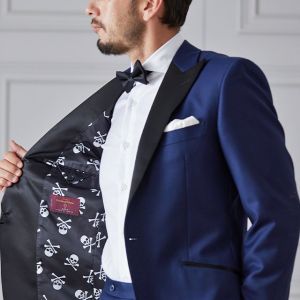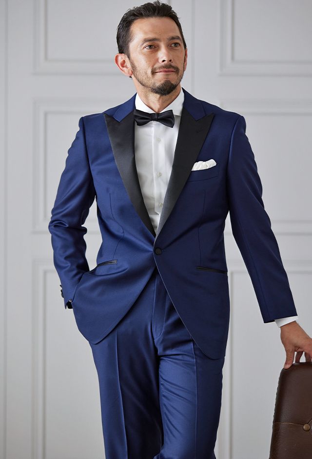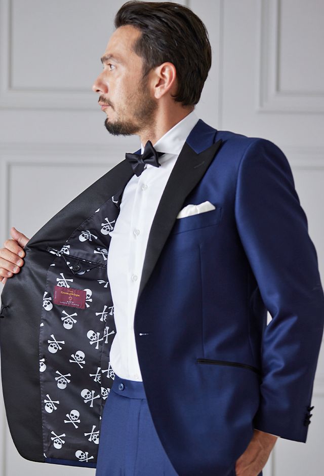 イタリアの高級生地ブランド「クロス エルメネジルド ゼニア」で仕立てたスーツです。明るみのあるブルーを基調とした色味で、オールシーズンの生地になります。結婚式やパーティーなど特別な日をより華やかにするタキシードモデルで仕立てました。遊びのあるタキシードスタイルに。裏地はドクロ(スカル)のオリジナリティーある個性的なデザイン。オーダー感満載の1着に。小物はシンプルにまとめて、フォーマルなシーンでも重宝する仕上がりです。