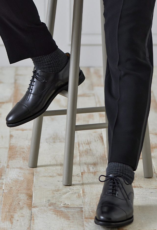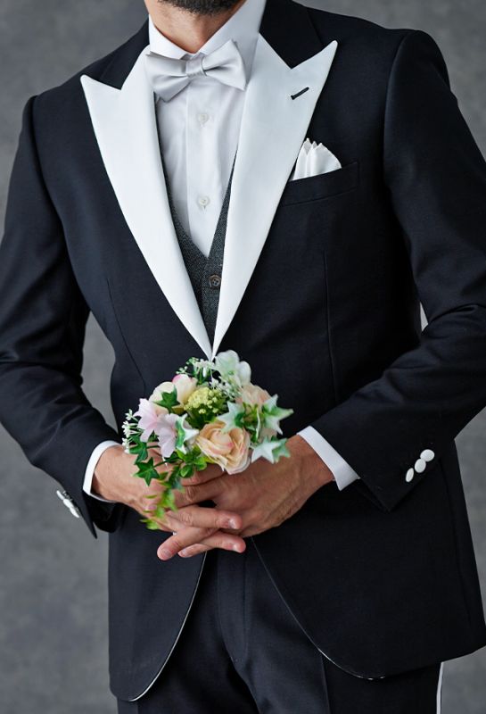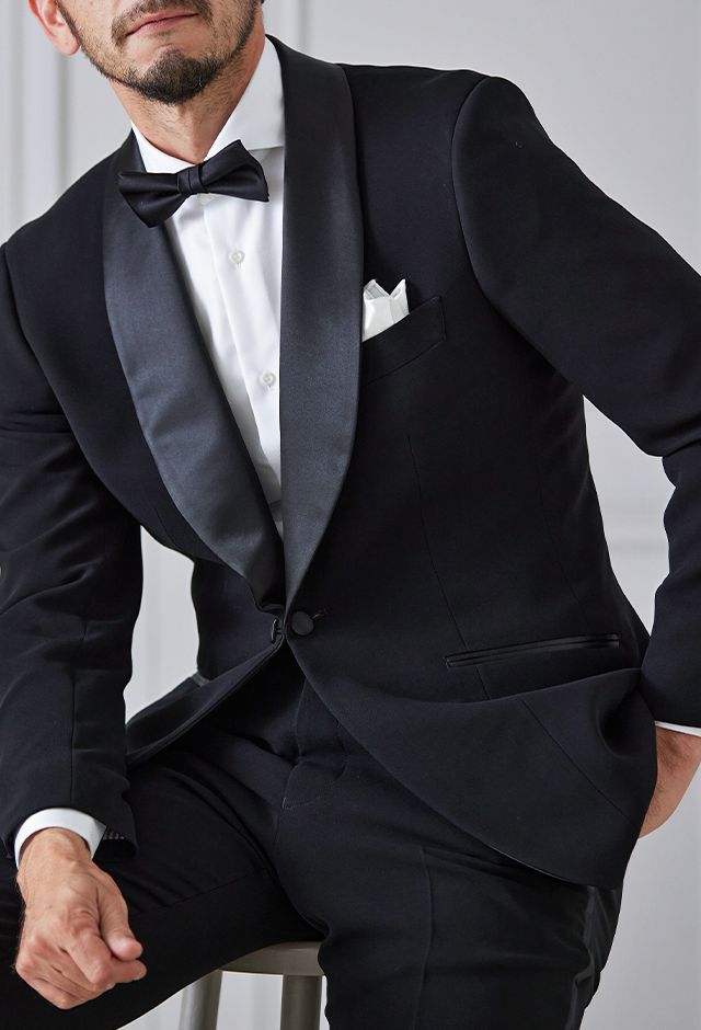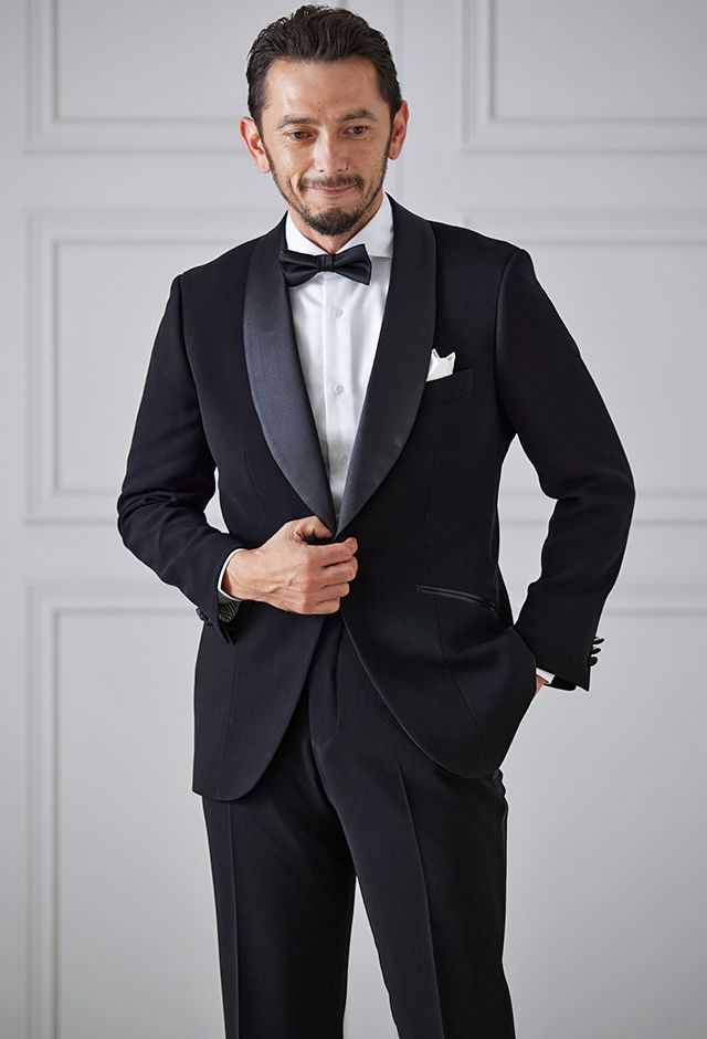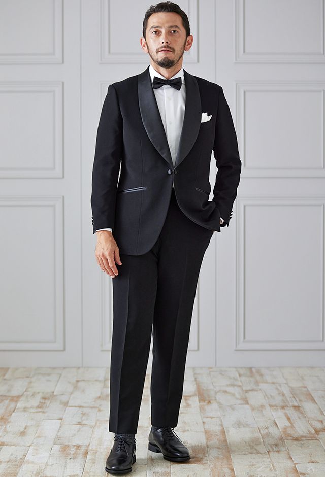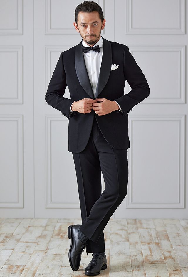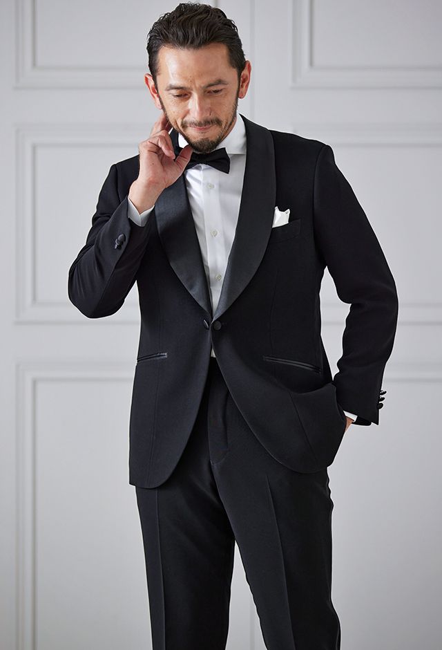 全て国産で作られた品のある生地感が特徴の「THE BLACK」で仕立てたスーツです。シンプルな黒の無地で、オールシーズンの生地になります。結婚式やパーティーなど特別な日をより華やかにするタキシードモデルで仕立てました。タキシードのスタイルに迷ったら選びたい装い。ポケットのフラップも外して、ステッチも入れないフォーマル仕様に。シューズはブラックのストレートチップで合わせることで統一感あるコーデに仕上げました。