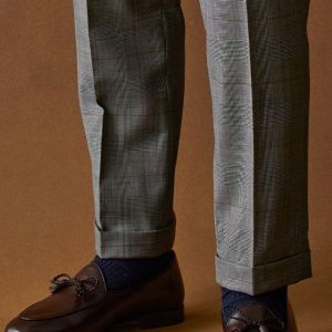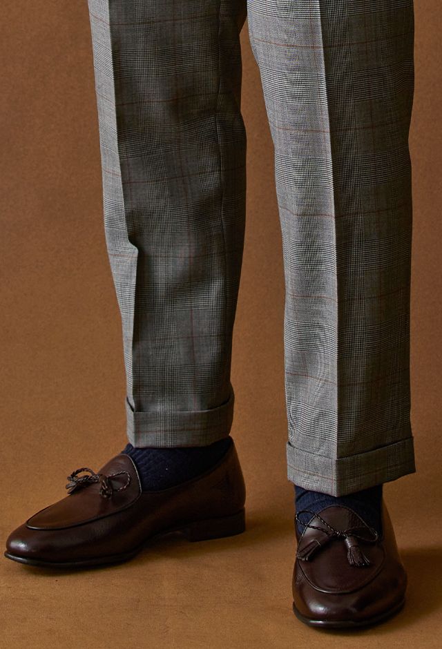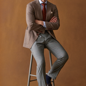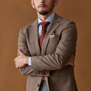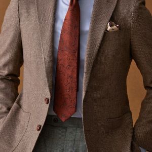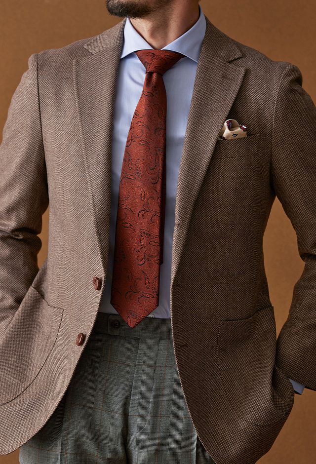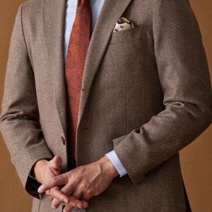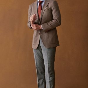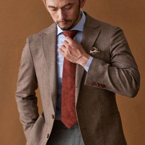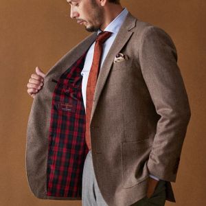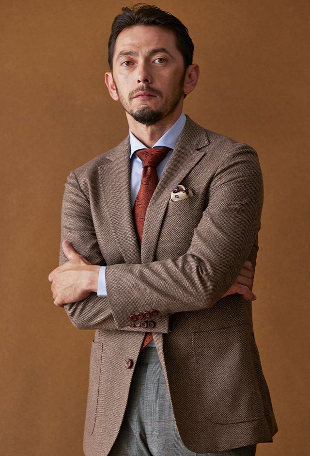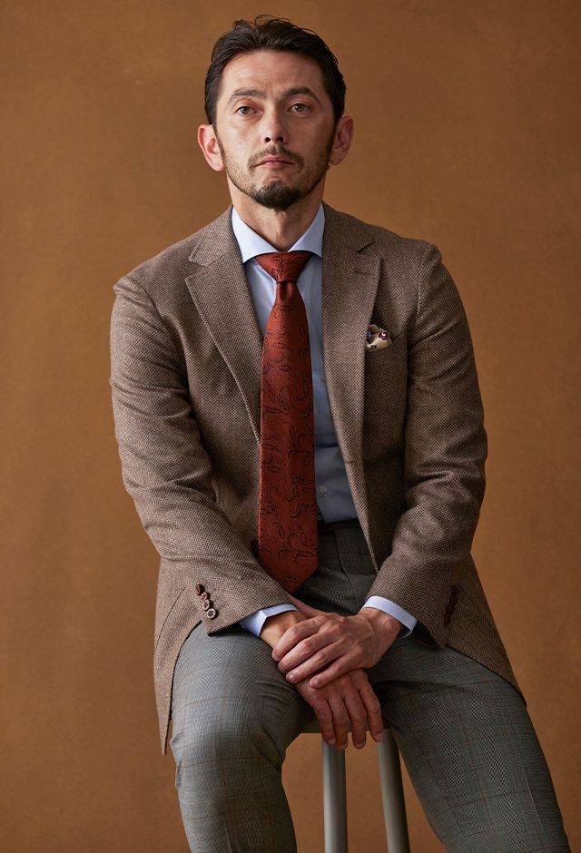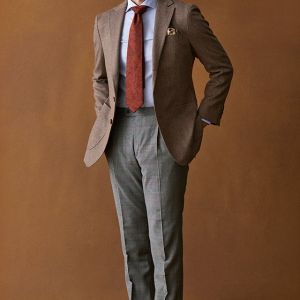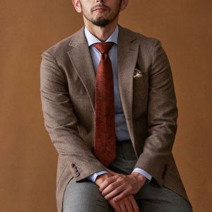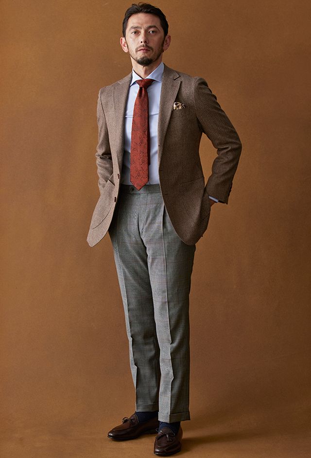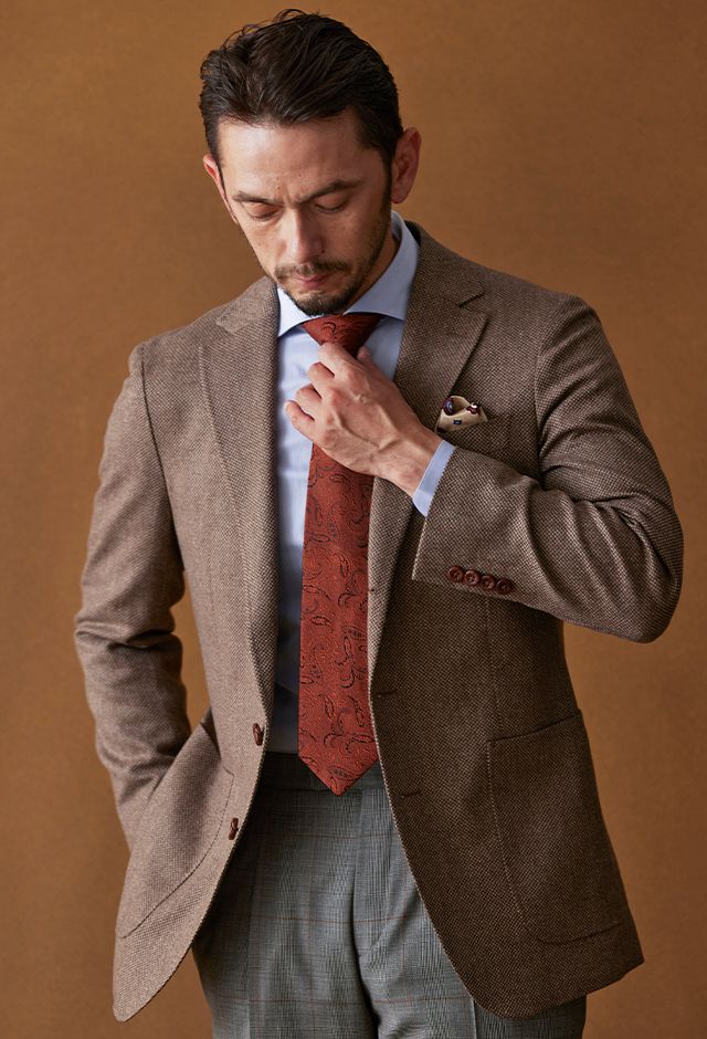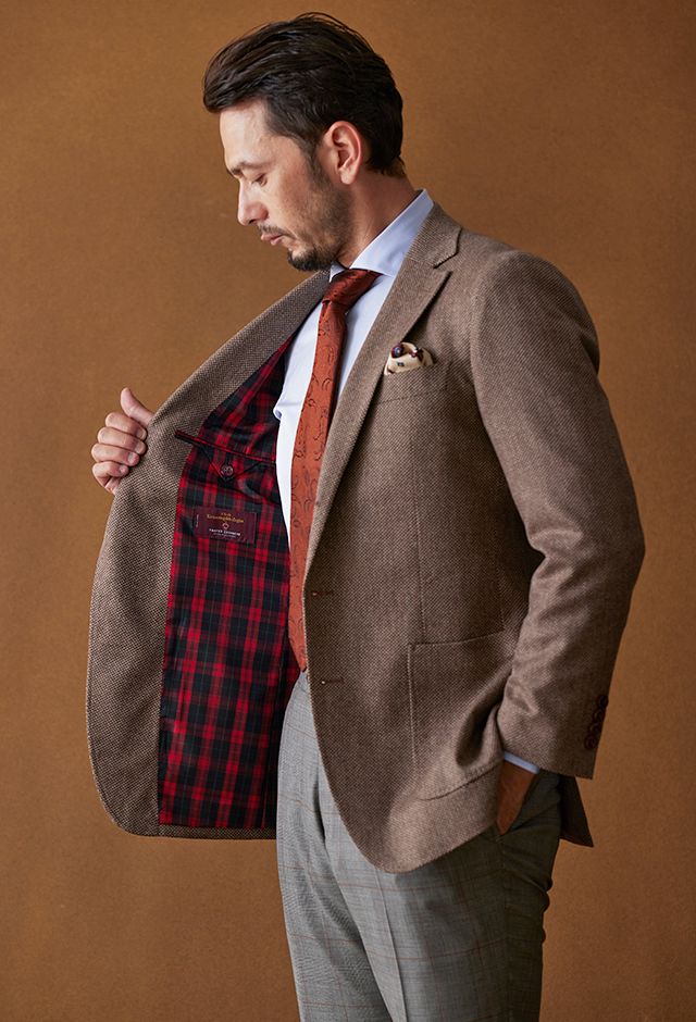 イタリアの高級生地ブランド「クロス エルメネジルド ゼニア」で仕立てたスーツです。カシミア混のカジュアル感のあるブラウン調で、秋冬シーズンの生地になります。肩パットや芯地を極力排したアンコンモデルでジャケットを仕立てました。カジュアルさの中に大人の余裕感とセクシーさを兼ね備えた1着です。裏地はレッドのタータンチェックでオーダー感のある仕様に。カジュアルな皮のボタンで遊び心を。同系色のネクタイで合わせてもノータイでも決まりやすいです。