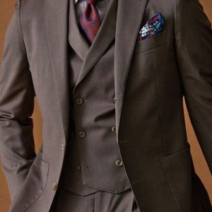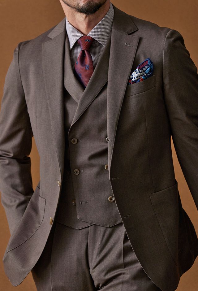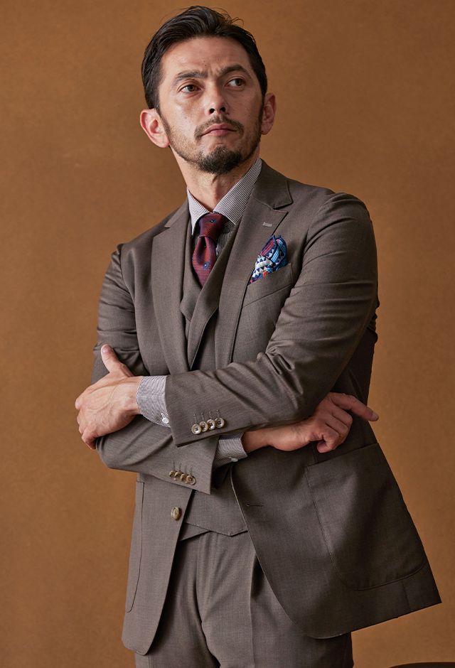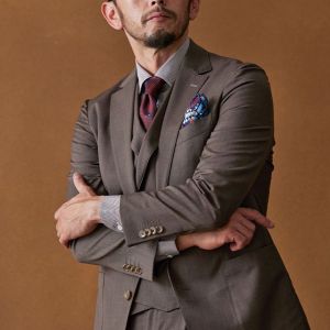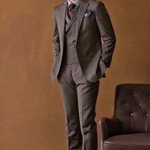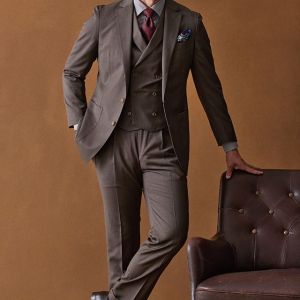 インポートブランドに引けを取らない繊細で柔らかなタッチが印象的なグローバルスタイルオリジナルの「Super 100's」で仕立てたスーツです。明るすぎない落ち着いたブラウン無地のスタイルで、オールシーズン着用していただけます。肩パットや芯地を極力排したアンコンモデルでジャケットを仕立てました。スリーピースのベストには襟付きのラペルドベストをチョイス。アウトポケットを採用し決めすぎない柔らかな印象に。ブラウンと相性の良いレッドのネクタイ・チーフを合わせた落ち着きのある大人のコーデでまとめました。