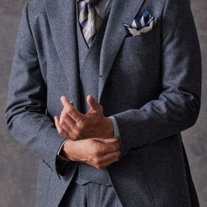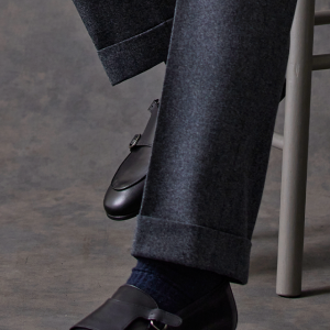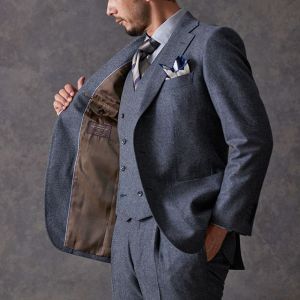 高品質でコストパフォーマンスに優れたイタリアブランド「カノニコ」で仕立てたスーツです。見た目にも暖かい印象の起毛したフランネル×ミディアムグレーのスタイルで、秋冬シーズンの生地になります。カイザーレジェロモデルで、一度羽織ると手放せなくなる軽い着心地を感じていただけます。スリーピースでクラシカルな雰囲気に加えて、ダブルベストでさらに重厚感を加えております。ダブルのベストは襟なしでカッチリしすぎないようにしているのもポイント。グレーのシャツで全体的に大人なモノトーンの雰囲気に仕上げました。