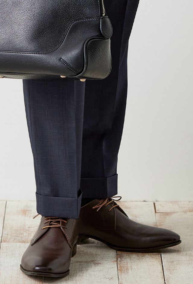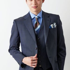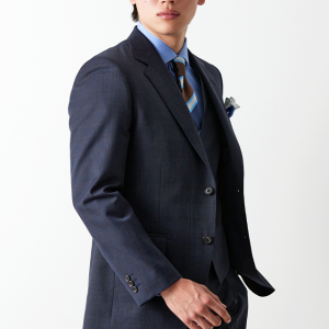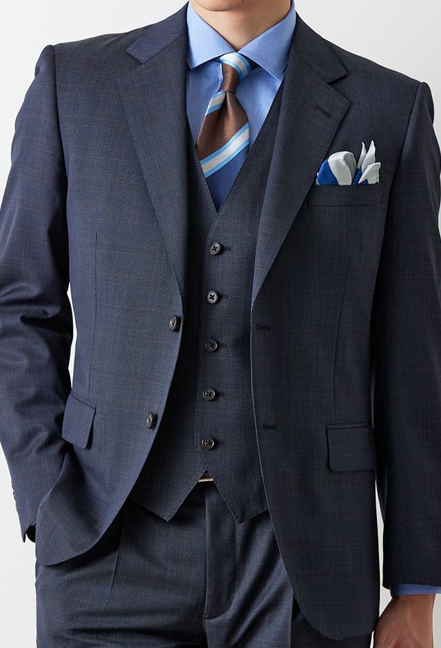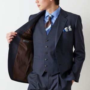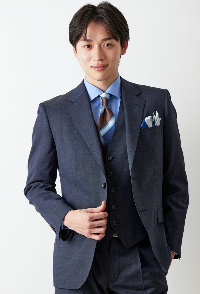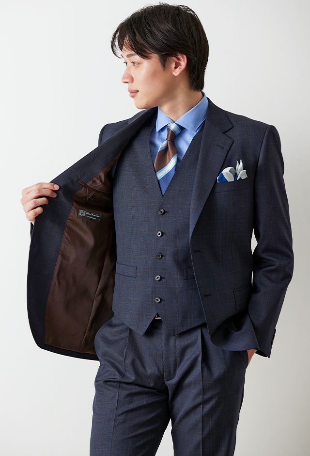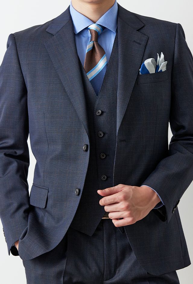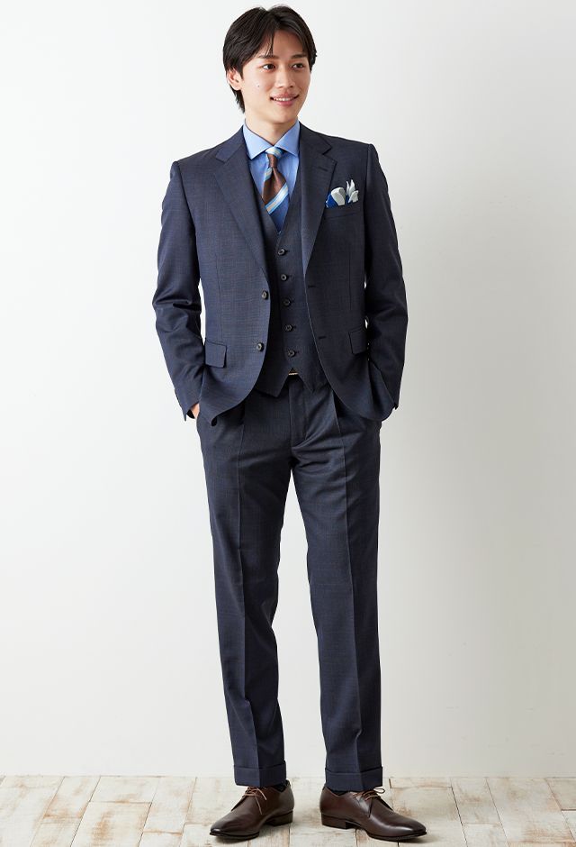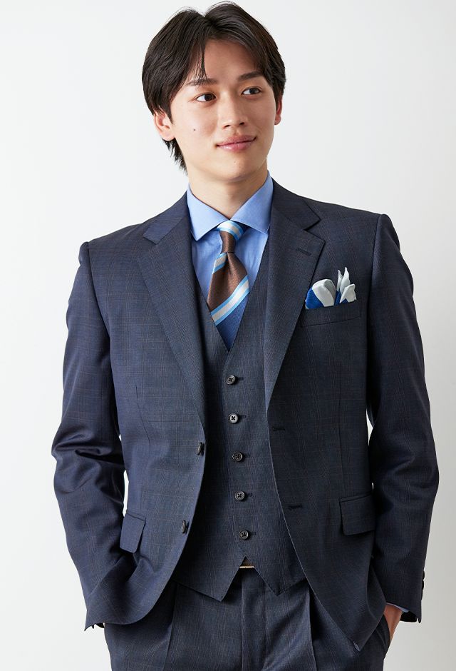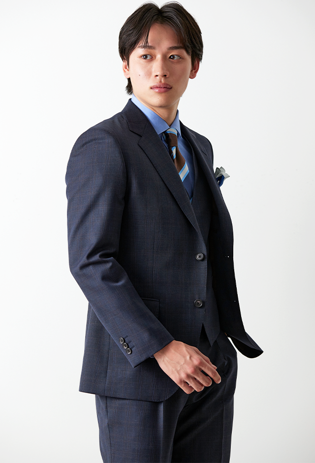 ウールのような上質な風合いを持ち、優れた通気性と耐久性、さらに撥水性を兼ね備えた「マイクロファイバースパン」で仕立てたスーツです。さりげないシャドーチェックの品のある生地で、オールシーズン着用していただけます。人気の英国系モデル・モダンブリティッシュモデルで仕立てました。裏地は表地のチェックと色合いを揃えたブラウンカラーに。パンツの裾口はカジュアルな印象ながらビジネスシーンにも使えるダブルタイプを採用。シャツとネクタイは同系色のブルー系で統一感を持たせています。
