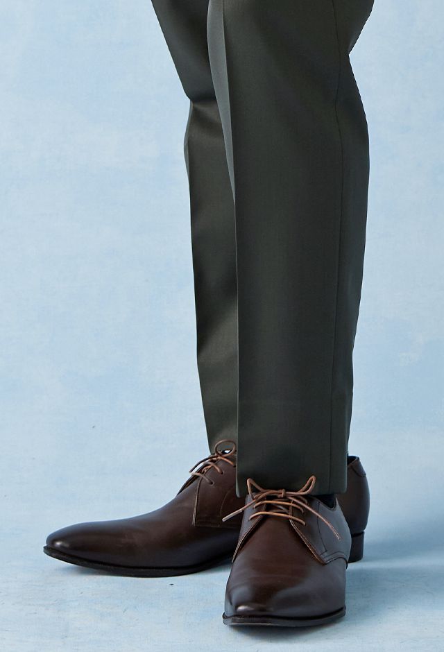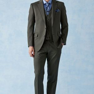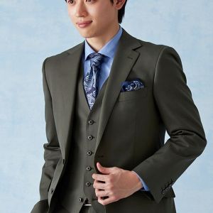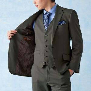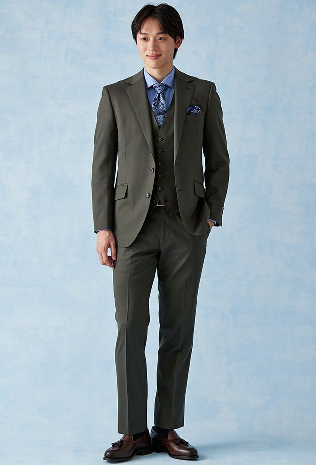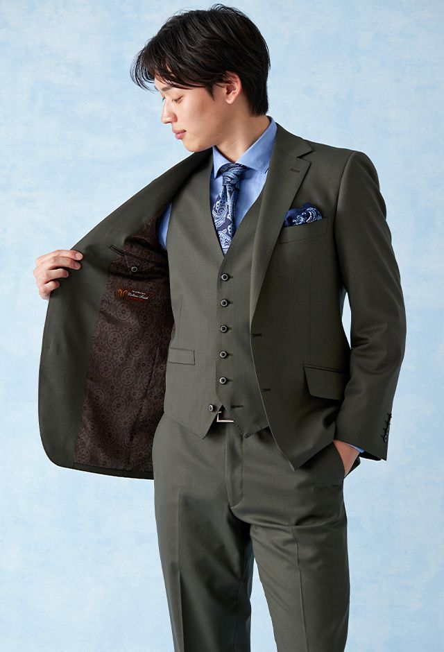 イタリアのノウハウを採用し、コストパフォーマンスに優れた「ビエラフィニッシュ」で仕立てたスーツです。落ち着いたカーキが特徴の生地で、オールシーズン着用していただけます。クラシックな部分とセクシーさを融合したモダンクラシックモデルで仕立てました。シャープなノッチドラペルにスラントポケットを採用。裏地の柄が遊び心を演出し、シンプルながら個性を感じる仕上がり。ブルーシャツとペイズリー柄のネクタイ&チーフで統一感を演出。爽やかさと洗練さを両立したコーデです。