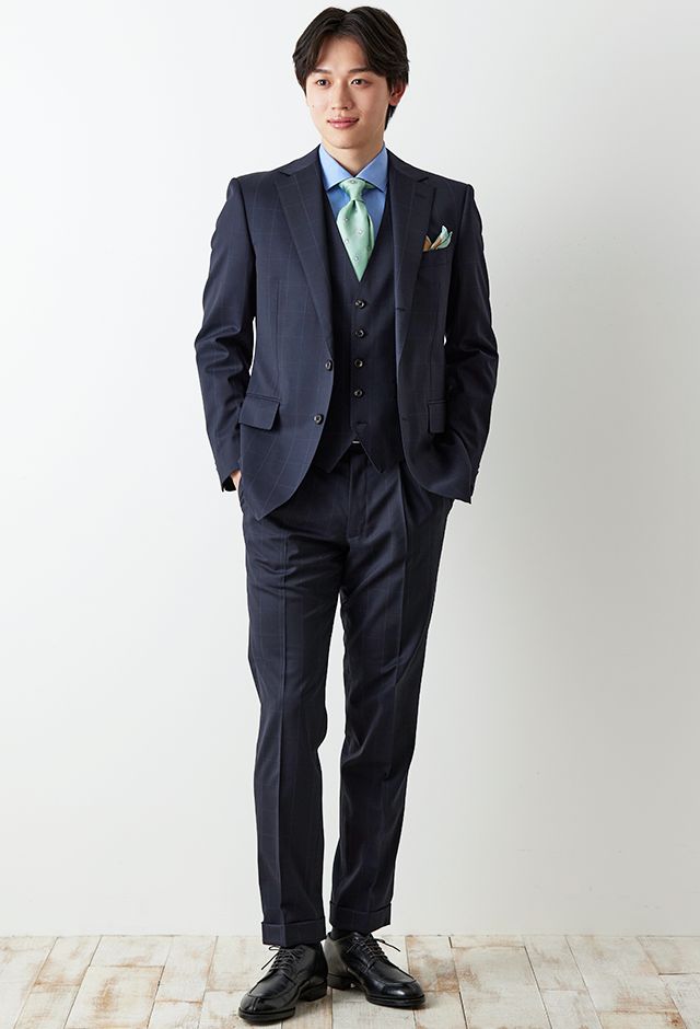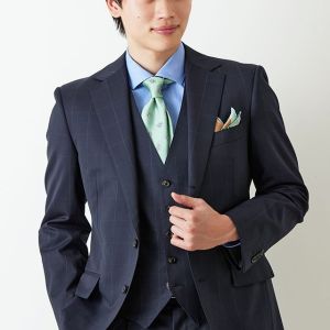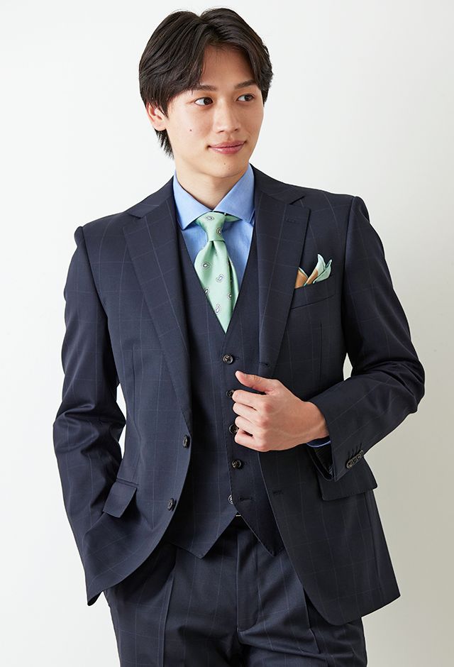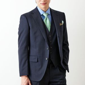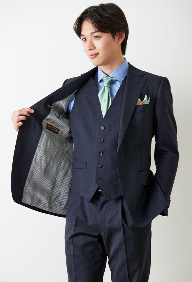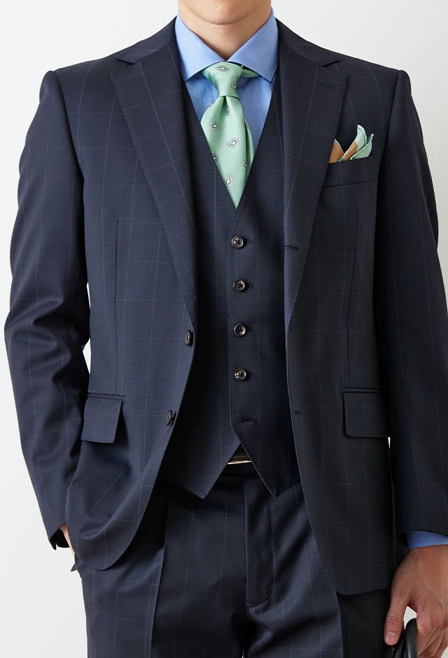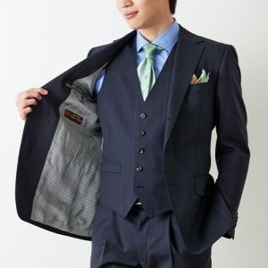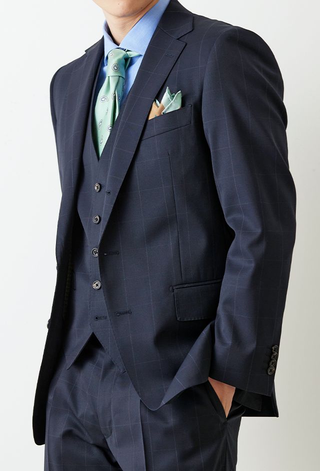 イタリアのノウハウを採用し、コストパフォーマンスに優れた「ビエラフィニッシュ」で仕立てたスーツです。ネイビーカラー×ウィンドウペンチェックの生地で、オールシーズン着用していただけます。クラシックな部分とセクシーさを融合したモダンクラシックモデルで仕立てました。袖は重ねボタンにし、裏地は上品な千鳥格子柄をセレクト。ブルーシャツとグリーンのネクタイ・チーフを組み合わせることで清涼感のあるコーデに仕上げました。