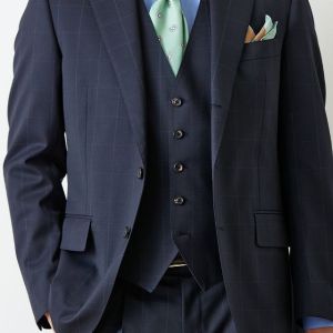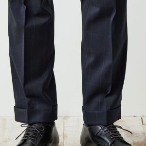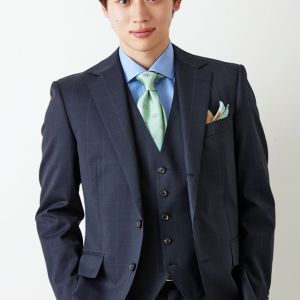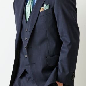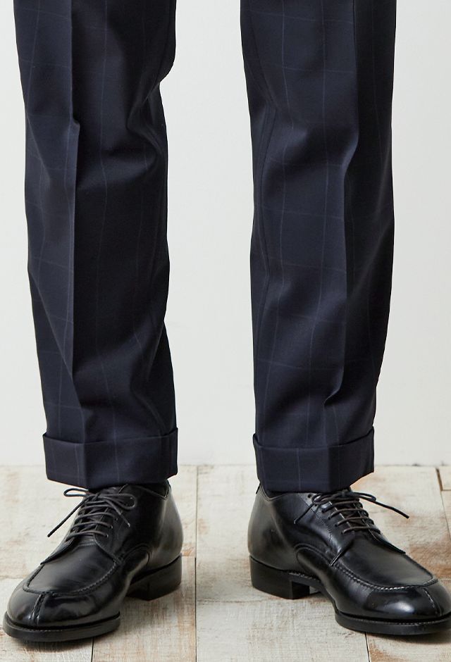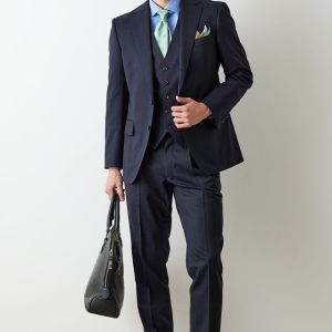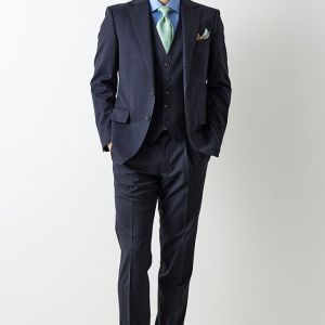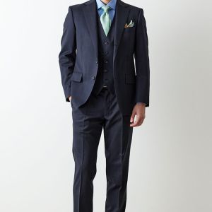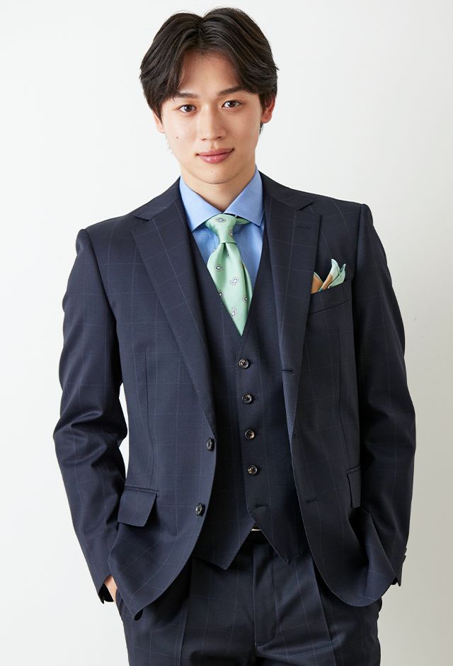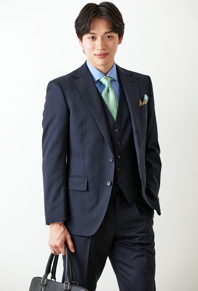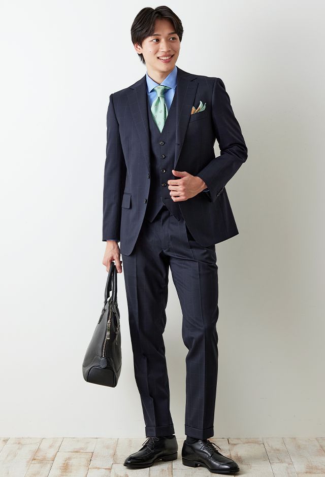 イタリアのノウハウを採用し、コストパフォーマンスに優れた「ビエラフィニッシュ」で仕立てたスーツです。ネイビーカラー×ウィンドウペンチェックの生地で、オールシーズン着用していただけます。クラシックな部分とセクシーさを融合したモダンクラシックモデルで仕立てました。袖は重ねボタンにし、裏地は上品な千鳥格子柄をセレクト。ブルーシャツとグリーンのネクタイ・チーフを組み合わせることで清涼感のあるコーデに仕上げました。