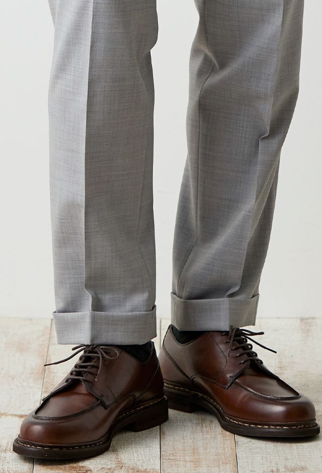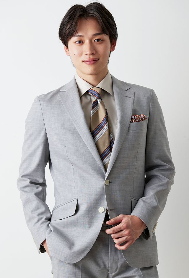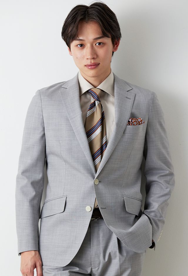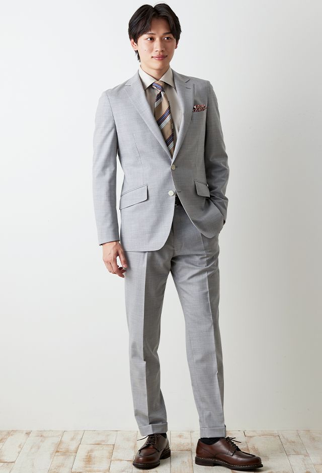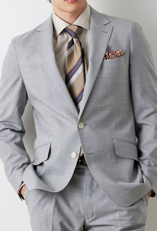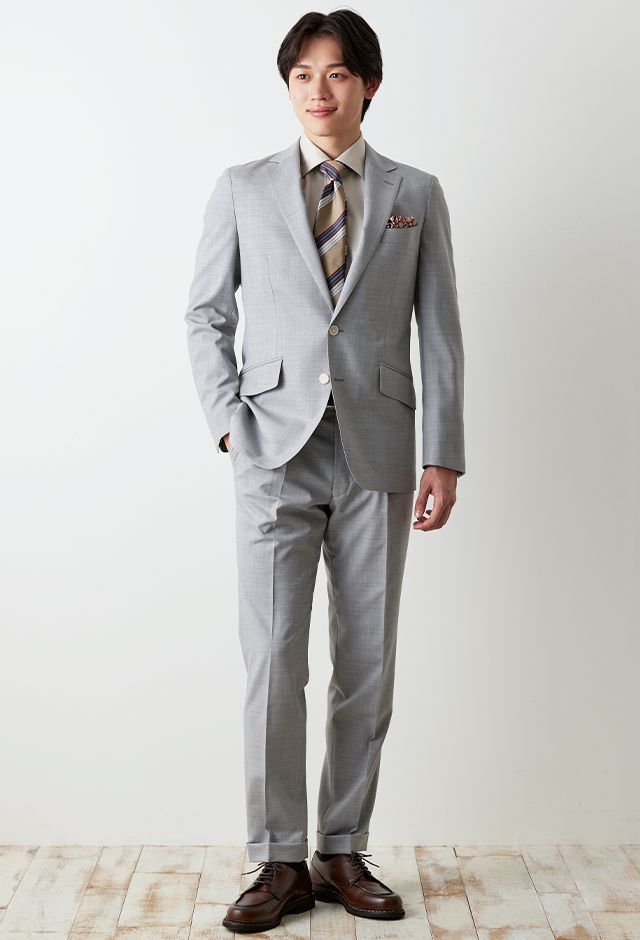 防シワ性やストレッチ性に優れ、出張・外回りの際にも美しいシルエットと着心地を実現できるオリジナルブランド「トラベルウール」で仕立てたスーツです。明るめなライトグレーの生地で、春夏シーズンの生地になります。肩パットや芯地を極力排したアンコンモデルでジャケットを仕立てました。フロントボタンはナチュラルな印象のライトカラーを採用。スーツ全体に軽やかさをプラスし、柔らかな雰囲気を演出します。シャツは落ち着きのあるベージュカラーをセレクト。肌なじみがよく、上品さを引き立てつつ、ネクタイやチーフの柄を際立たせるバランスの良い仕上がりになっています。