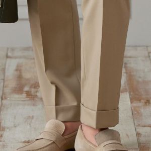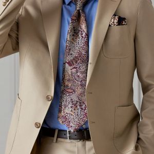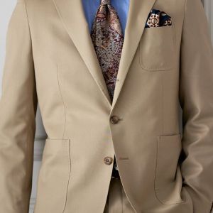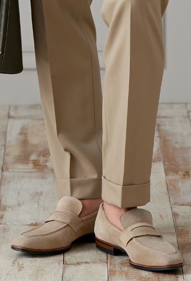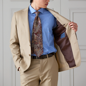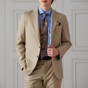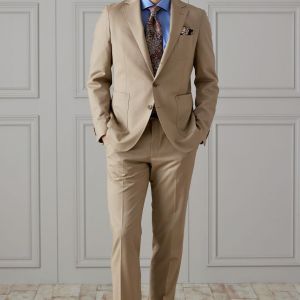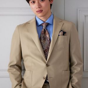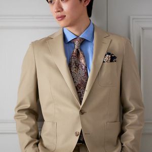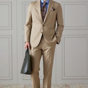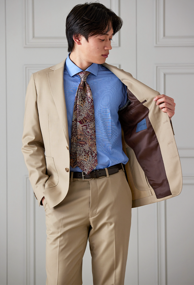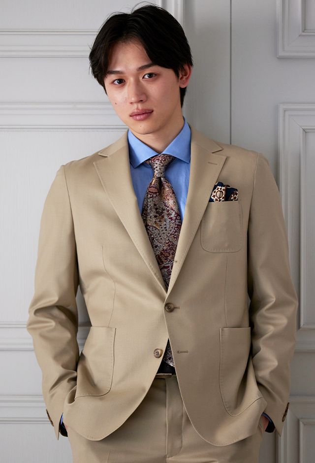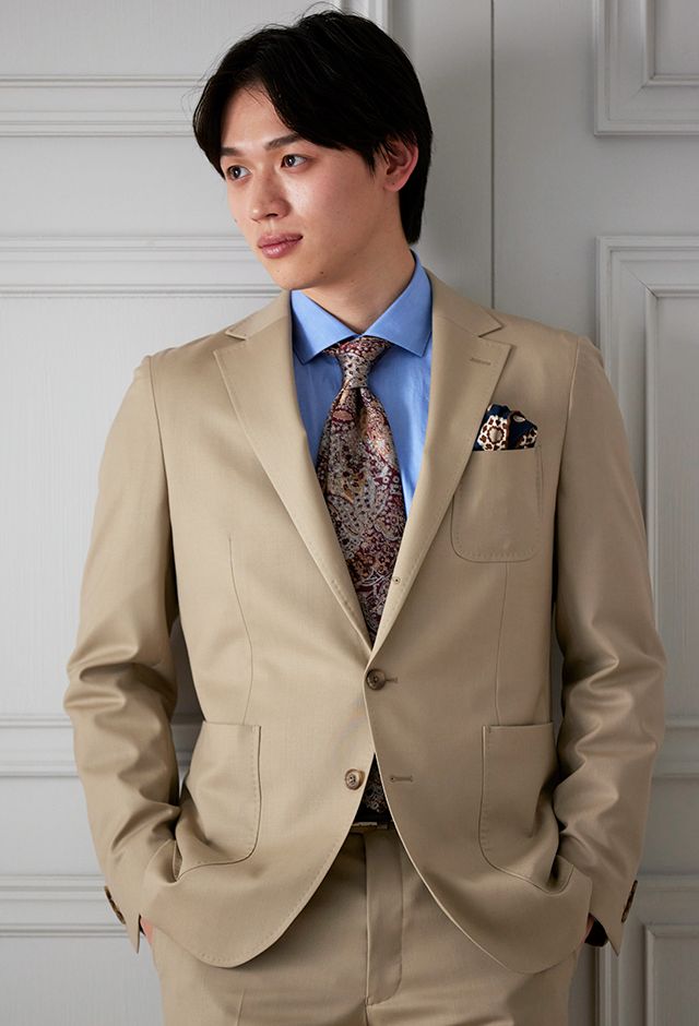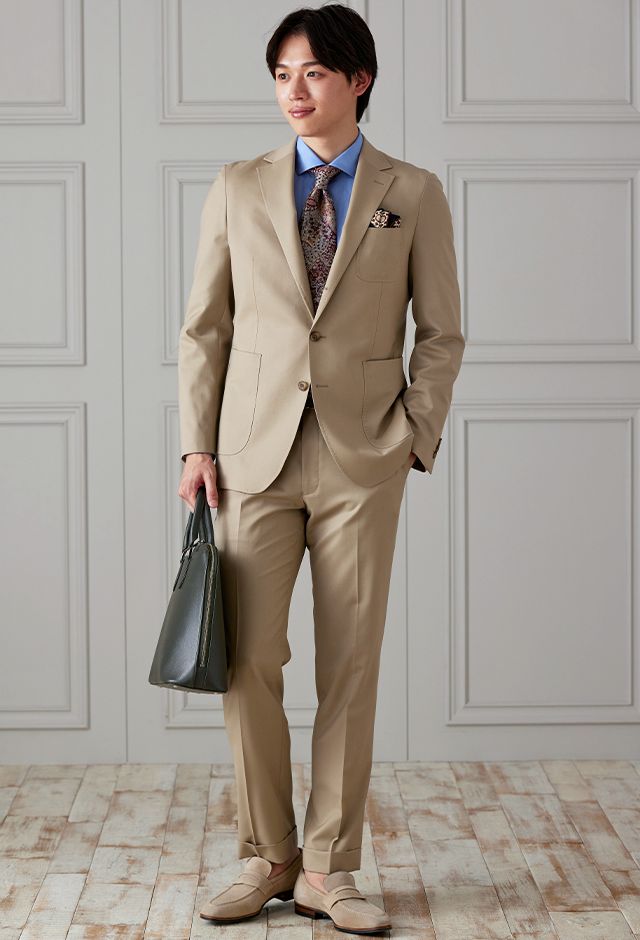 防シワ性やストレッチ性に優れ、出張・外回りの際にも美しいシルエットと着心地を実現できるオリジナルブランド「トラベルウール」で仕立てたスーツです。爽やかなライトベージュの生地で、オールシーズン着用していただけます。肩パットや芯地を極力排したアンコンモデルでジャケットを仕立てました。裏地には表地のベージュと相性の良いブラウンカラーをチョイス。シューズもベージュで揃えることで統一感を出しつつ、ネクタイやチーフを柄ものにすることで洗練されたコーディネートです。