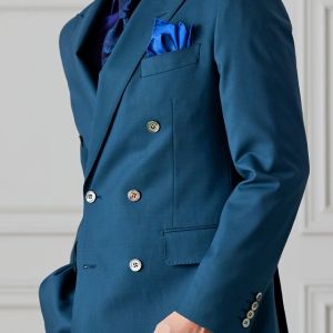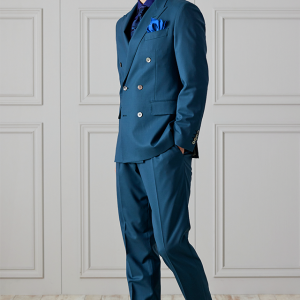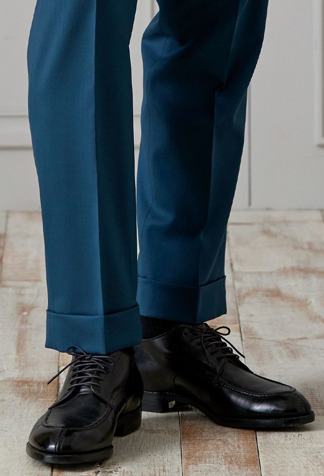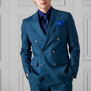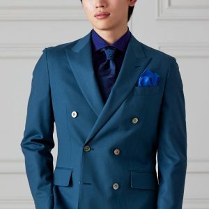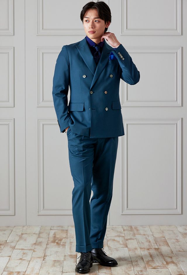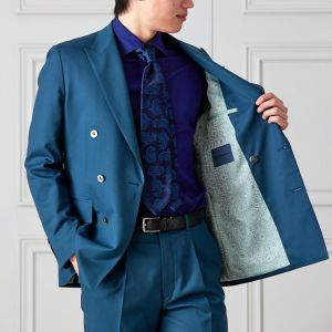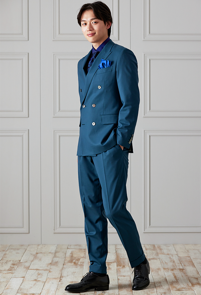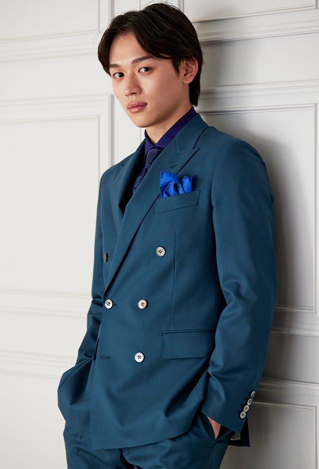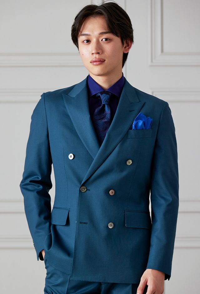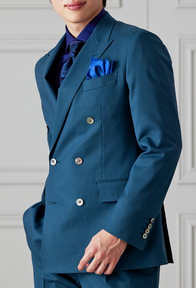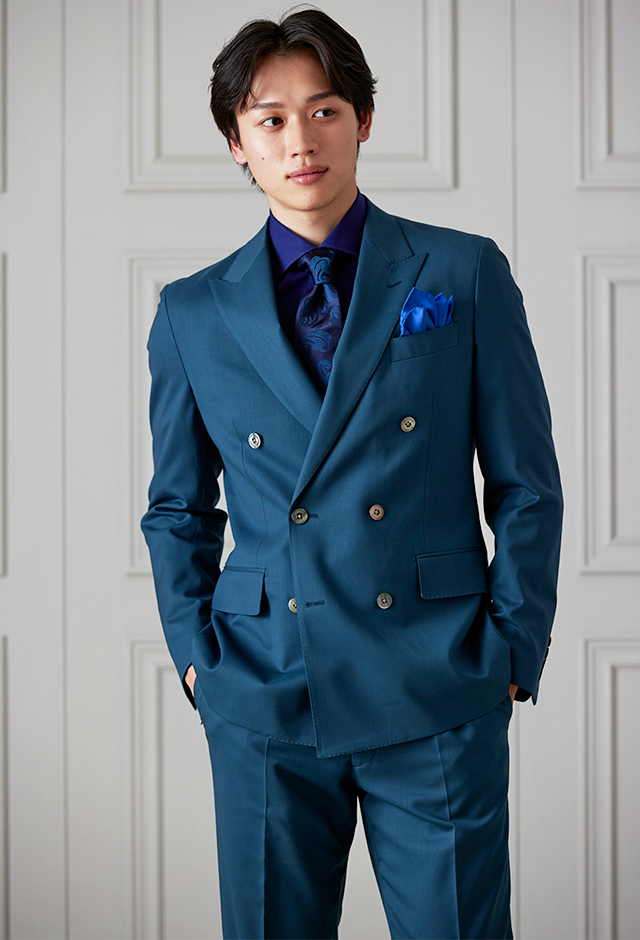 防シワ性やストレッチ性に優れ、出張・外回りの際にも美しいシルエットと着心地を実現できるオリジナルブランド「トラベルウール」で仕立てたスーツです。艶感のあるグリーンの生地で、オールシーズン着用していただけます。空気を纏うような着心地を楽しむアンコンモデル(ダブル)でジャケットを仕立てました。ピークドラペルのダブルブレストスーツがクラシックでありながらモダンな印象を演出。深みのあるグリーンが洗練された雰囲気を強調し、貝ボタンが上品なアクセントに。ネイビーシャツとペイズリーネクタイで統一感を持たせ、シックでスタイリッシュな仕上がりに。鮮やかなブルーのチーフが差し色となり、エレガントさを引き立てています。
