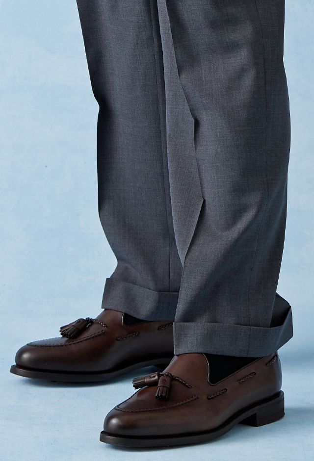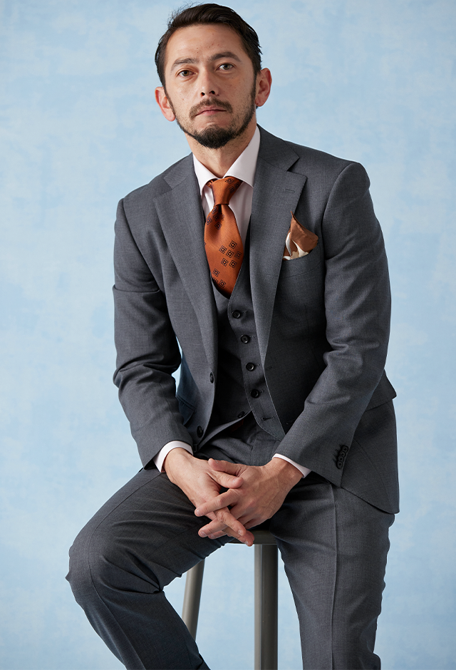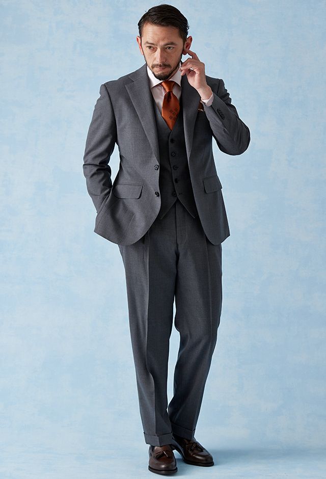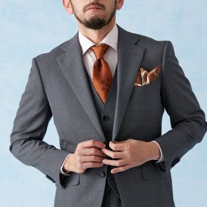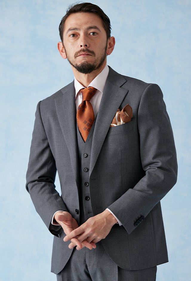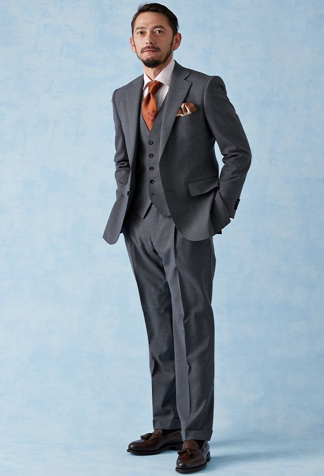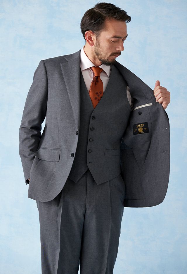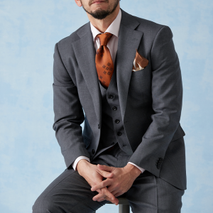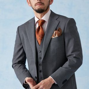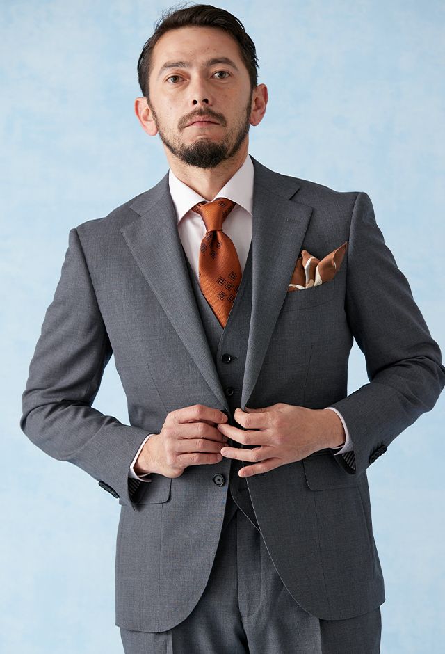 コストパフォーマンスの高さからも人気の高い「トレーニョ」で仕立てたスーツです。上品で落ち着いた印象を与えるグレーのスタイルで、春夏シーズンの生地になります。カイザーレジェロモデルで、一度羽織ると手放せなくなる軽い着心地を感じていただけます。ジャケットのフロントボタンは2つ仕様で、クラシックながらも現代的なバランスを保ったデザインです。オレンジのネクタイがアクセントとなり、落ち着いた色合いのスーツに華やかさをプラス。程よい光沢感があり、品の良い印象を与えてくれます。