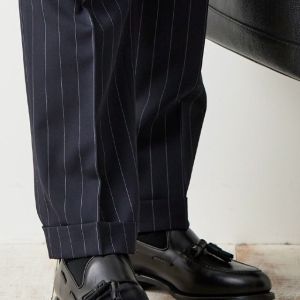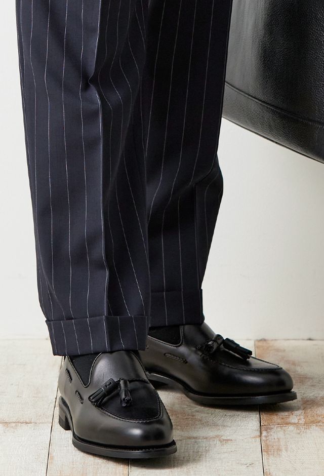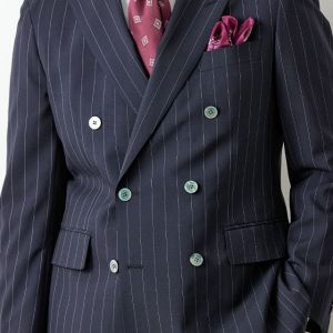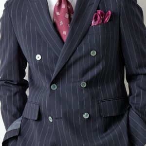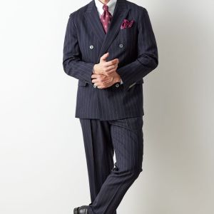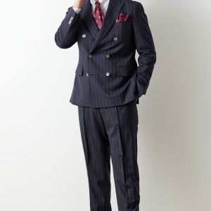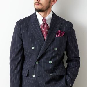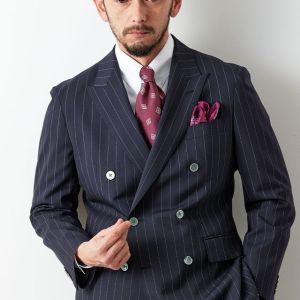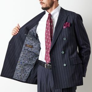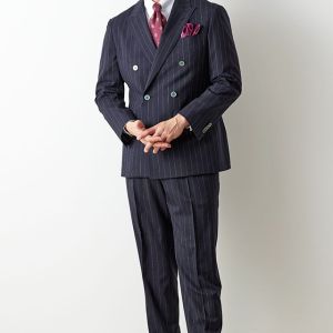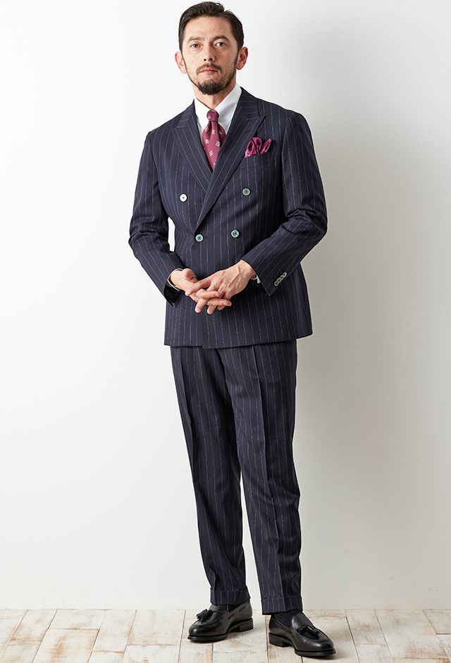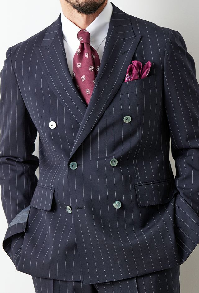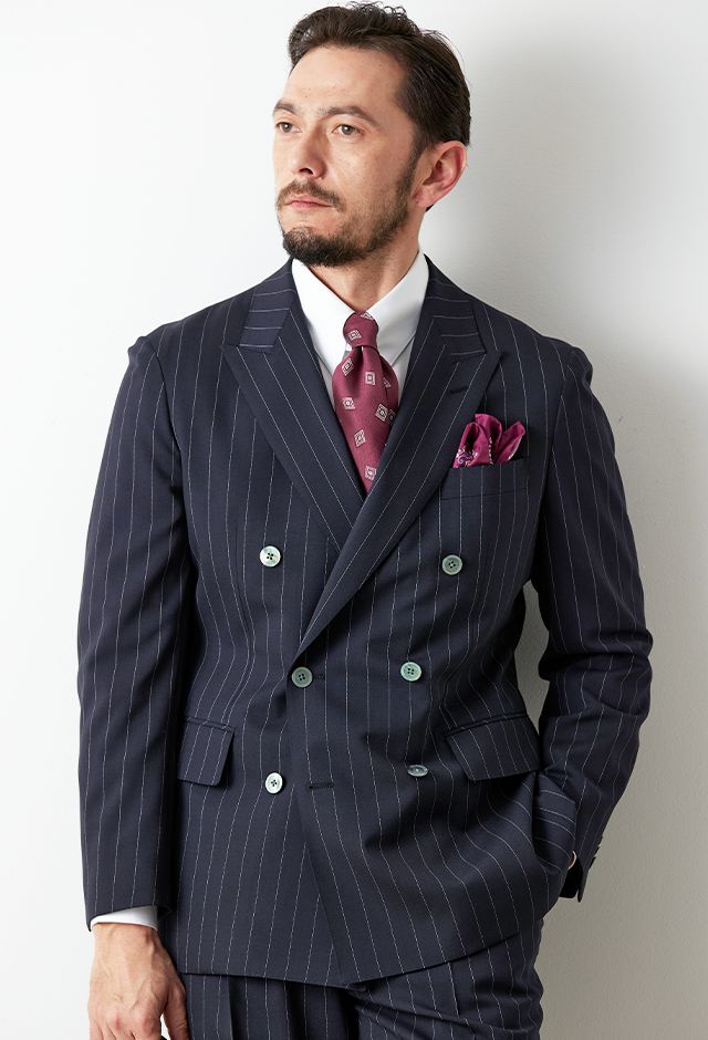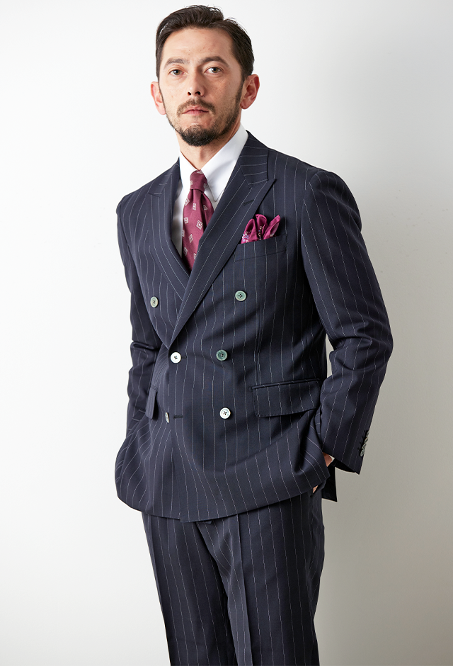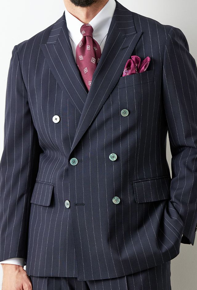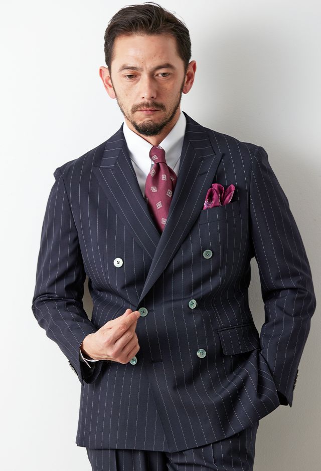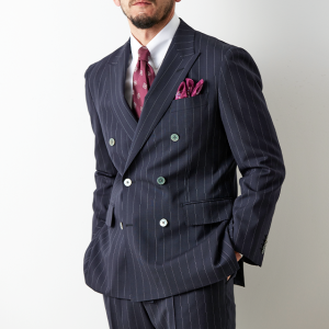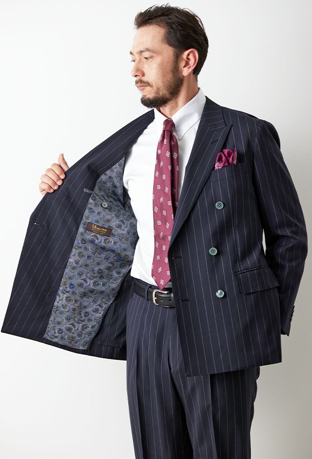 コストパフォーマンスの高さからも人気の高い「トレーニョ」で仕立てたスーツです。クラシック感を感じるダークネイビー×ホワイトストライプのスタイルで、春夏シーズンの生地になります。空気を纏うような着心地を楽しむアンコンモデル(ダブル)でジャケットを仕立てました。裏地には珍しいブルーの薔薇が施され、さりげなく個性を演出。ジャケットを脱いだ際に個性を感じさせるデザインです。深みのあるバーガンディのネクタイを採用し、シンプルなホワイトシャツと合わせることで、落ち着いた印象に仕上げています。