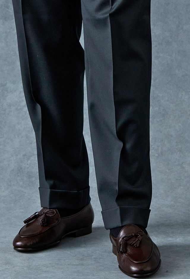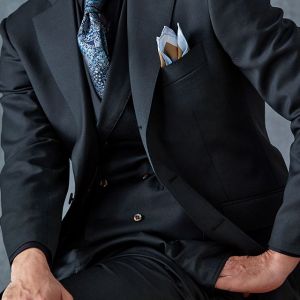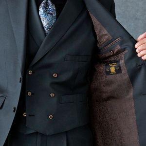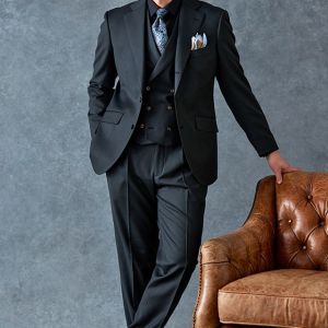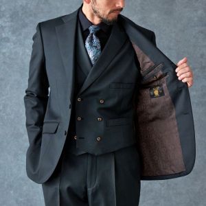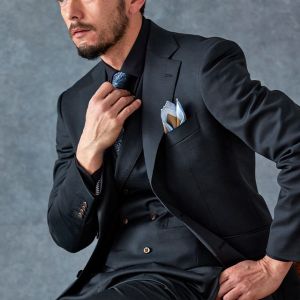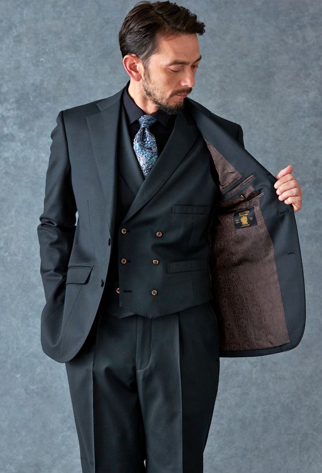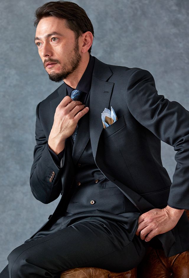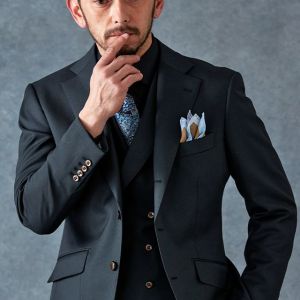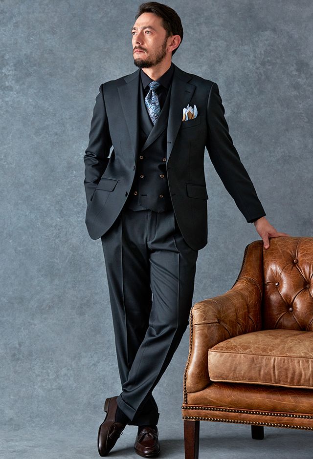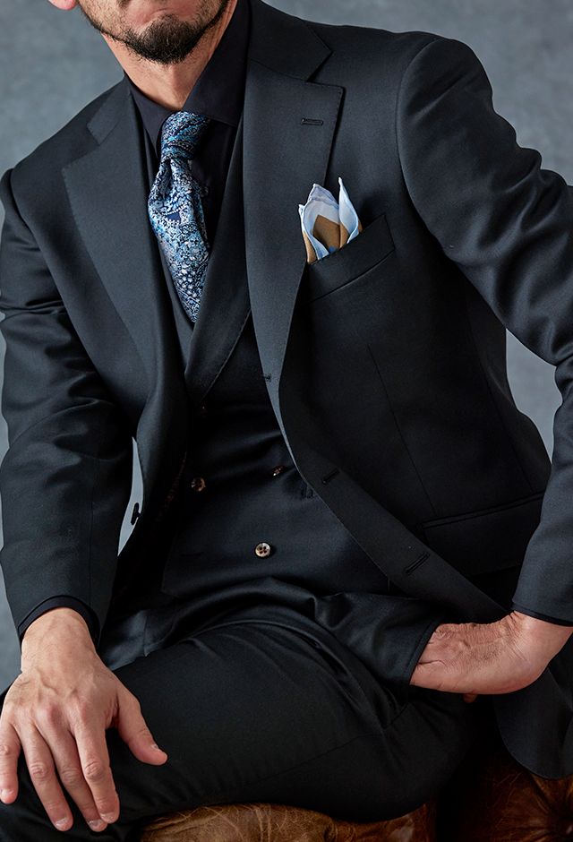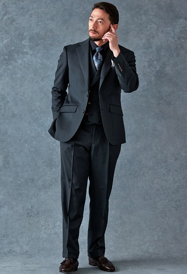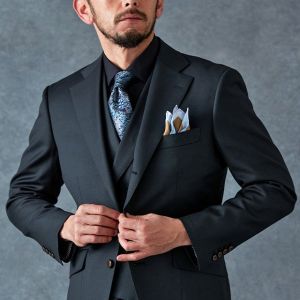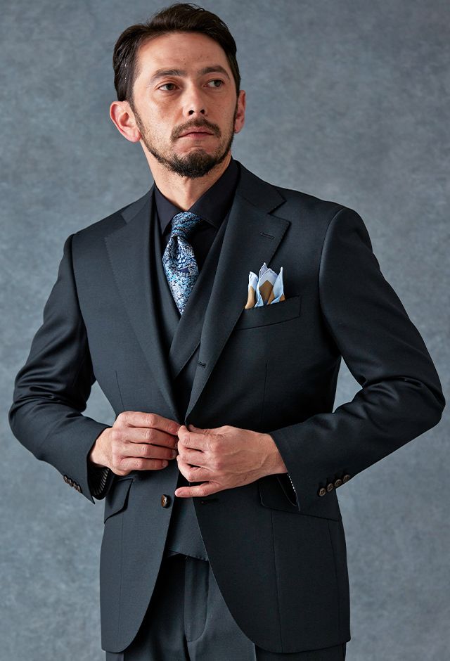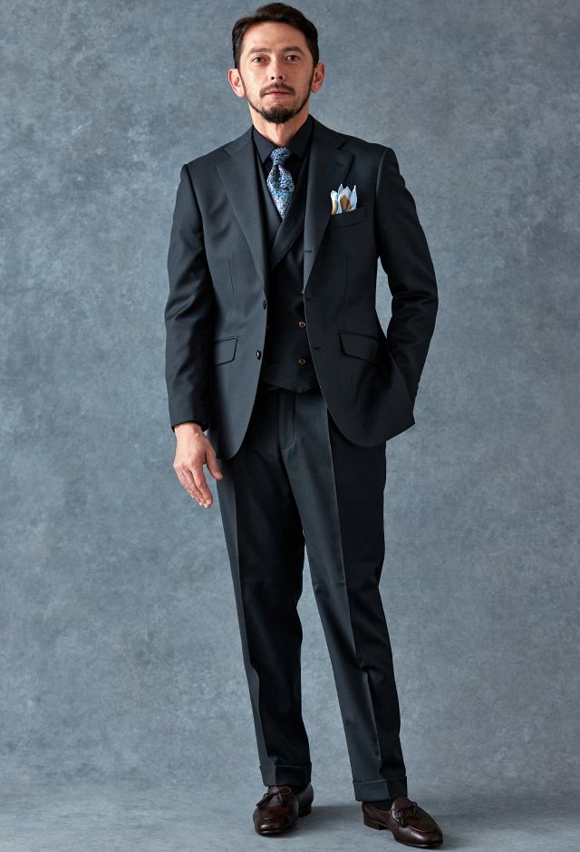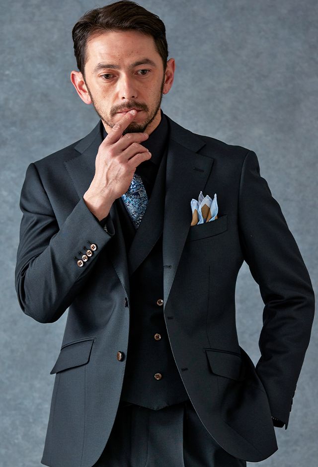 高品質でコストパフォーマンスに優れたイタリアブランド「カノニコ」で仕立てたスーツです。落ち着きがあるグレーがかったダークグリーンのスタイルで、オールシーズン着用していただけます。最高峰グレードの「カイザーモデル」で極上の着心地を味わうことが出来ます。ベストはダブル仕様で、クラシックな雰囲気を演出。フロントの6つボタンが程よい重厚感を引き立てています。シャツとネクタイをブラック×ブルーでまとめることで、モノトーンの中に奥行きをプラス。ポケットチーフは柄を効かせたアクセントとなり、シックな中にも華やかさを添えています。