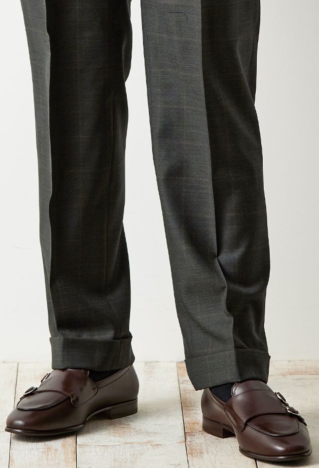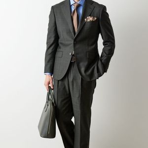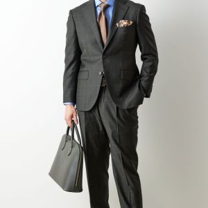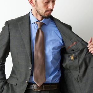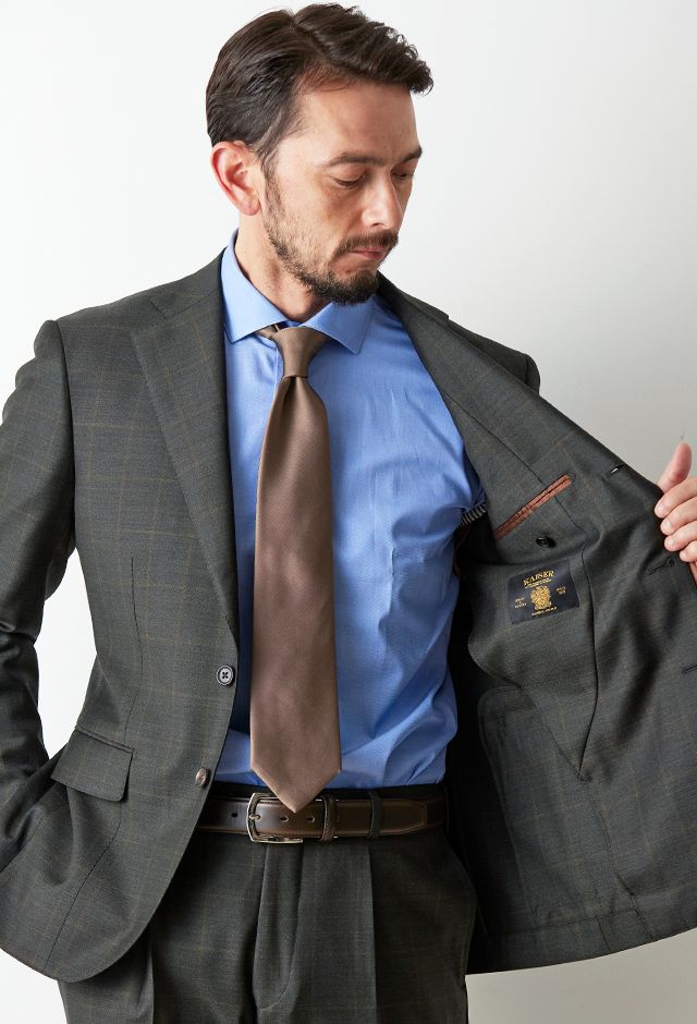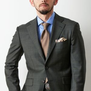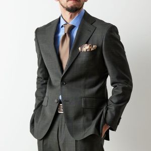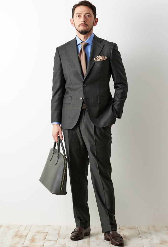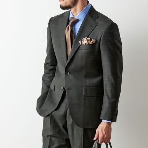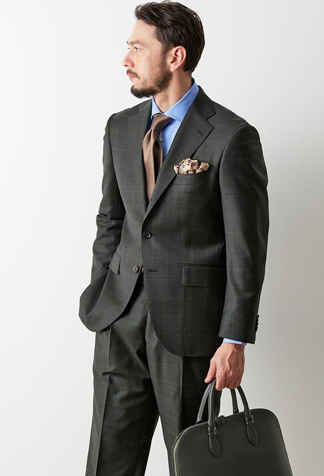 高品質でコストパフォーマンスに優れたイタリアブランド「カノニコ」で仕立てたスーツです。明るすぎない落ち着いたカーキにウィンドウペンチェックのスタイルで、オールシーズン着用していただけます。カイザーレジェロモデルで、一度羽織ると手放せなくなる軽い着心地を感じていただけます。ジャケットは見返しに表地を用いた贅沢な大見返し仕様を採用。ネクタイとチーフをブラウン系で統一し、落ち着いた印象に。ブルーシャツとのコントラストが絶妙で、品格のある大人のコーディネートに仕上げています。
