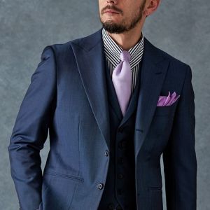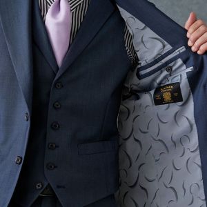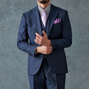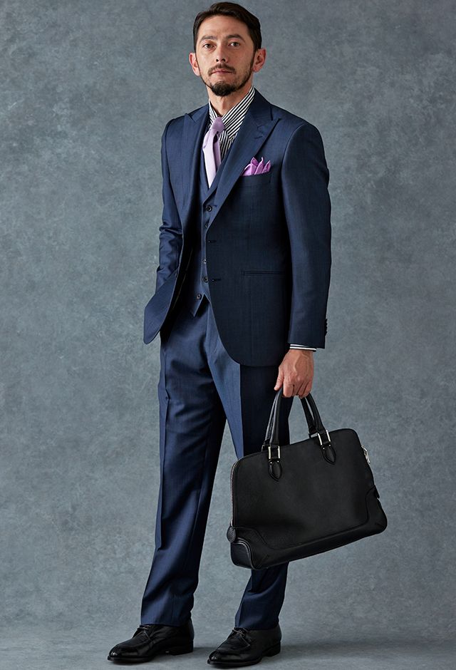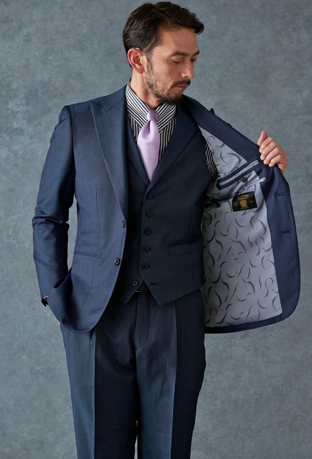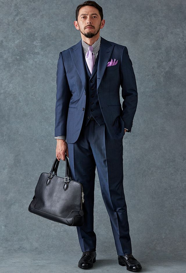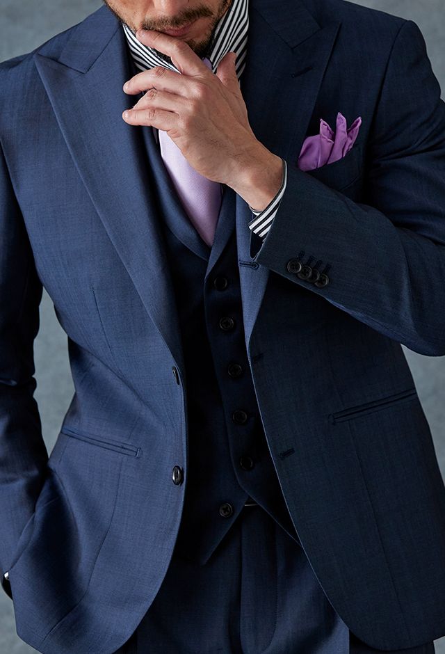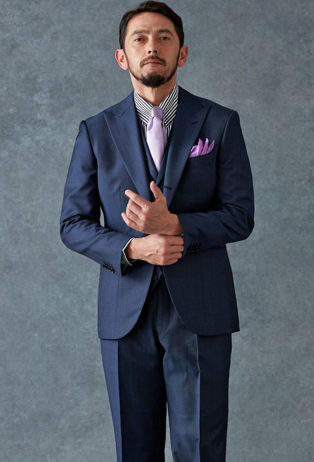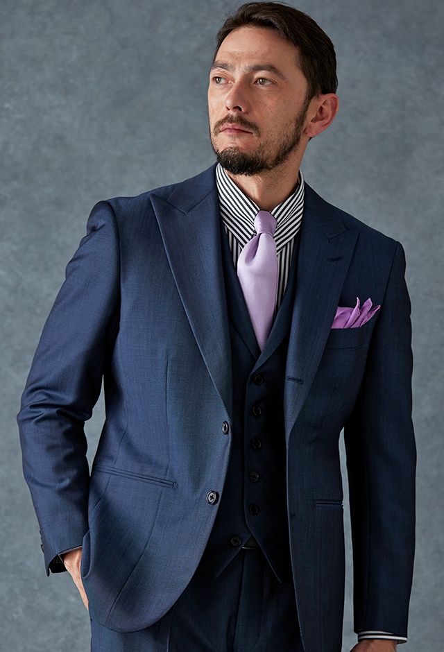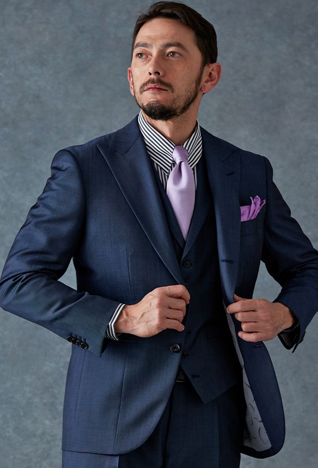 高品質でコストパフォーマンスに優れたイタリアブランド「カノニコ」で仕立てたスーツです。オーダー感のある鮮やかなブルーグレーが特徴の生地で、春夏シーズンの生地になります。最高峰グレードの「カイザーモデル」で極上の着心地を味わうことが出来ます。裏地にはさりげなく柄を取り入れ、シンプルながらも遊び心のあるデザインに。動いたときにさりげなく見えるアクセントが、上品な印象を与えます。淡いパープルのネクタイを合わせることで、ストライプシャツのモダンな雰囲気を引き立て、柔らかさと品格を兼ね備えたスタイルに仕上げました。