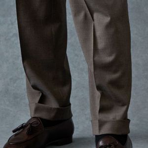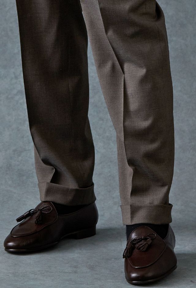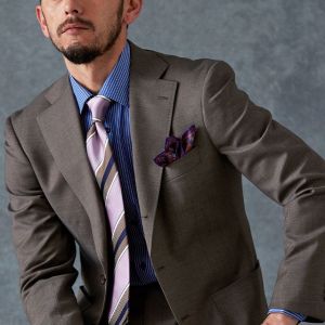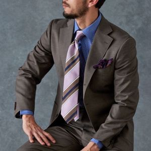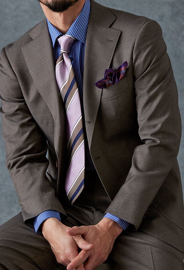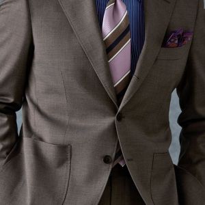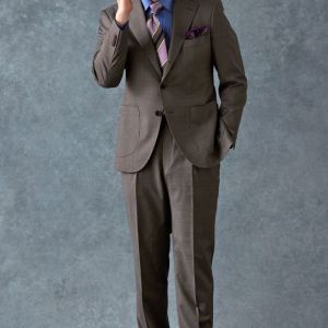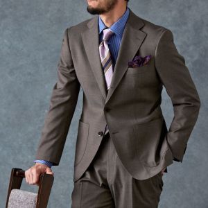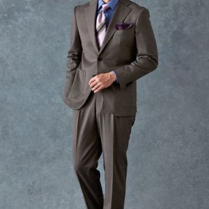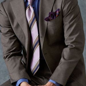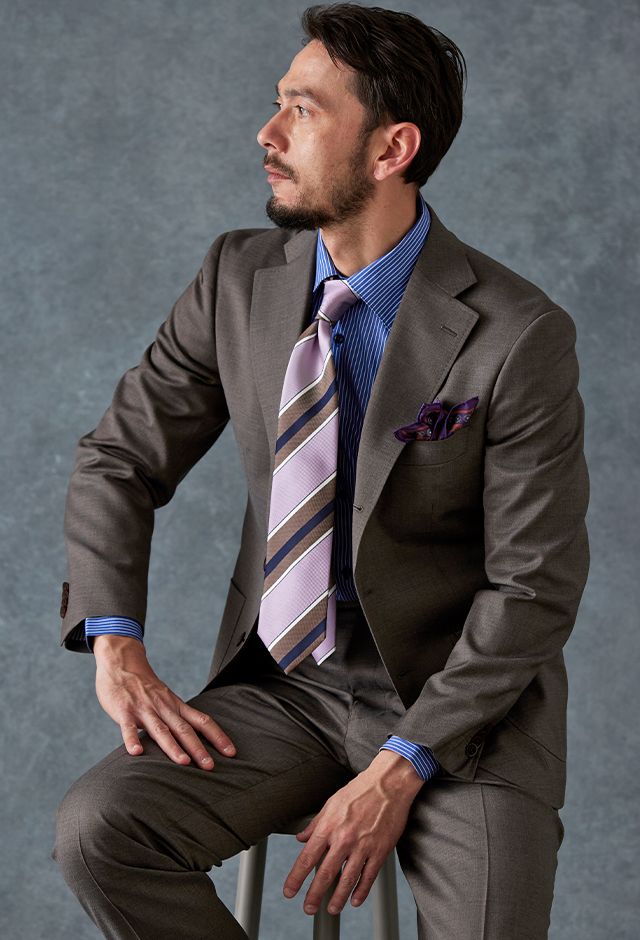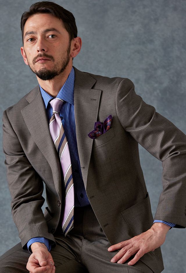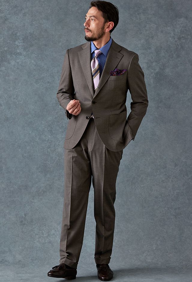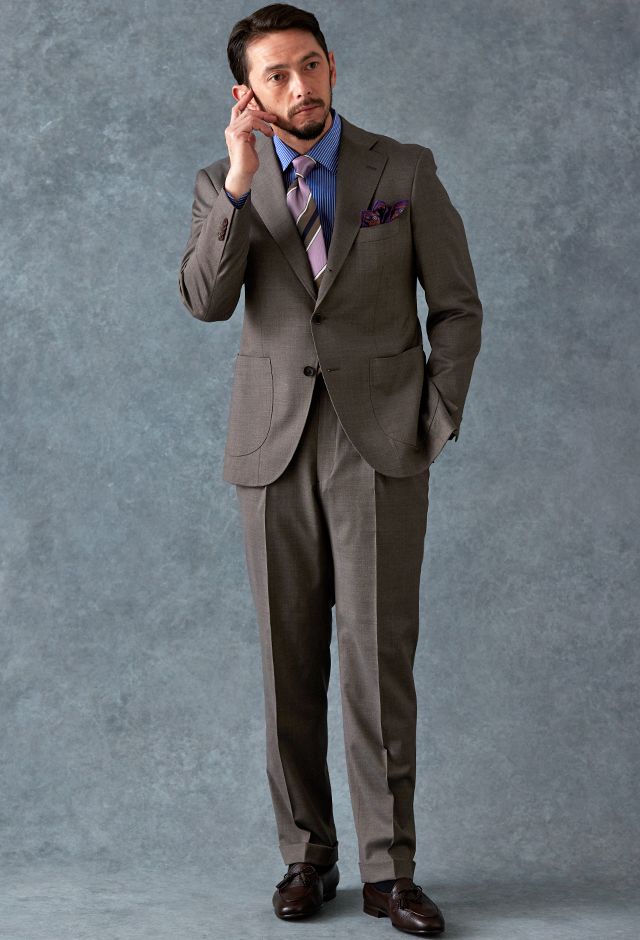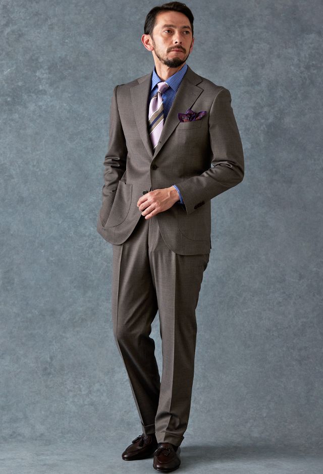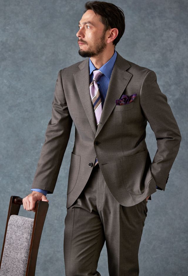 クラシカルからファンシーなデザインまで幅広く生み出すイタリアブランド「レダ」で仕立てたスーツです。明るすぎない落ち着いたブラウン無地のスタイルで、オールシーズン着用していただけます。カイザーレジェロモデルで、一度羽織ると手放せなくなる軽い着心地を感じていただけます。袖口のボタンは4つ並べて配置し、クラシックな印象に仕上げています。 控えめなデザインながら、さりげないこだわりを感じさせる仕様です。パープル系のネクタイとチーフを取り入れることで、落ち着いたスーツに華やかさをプラスしています。
