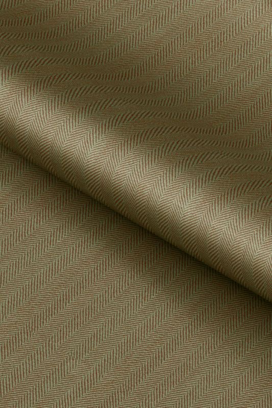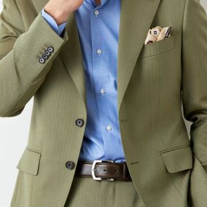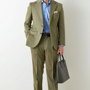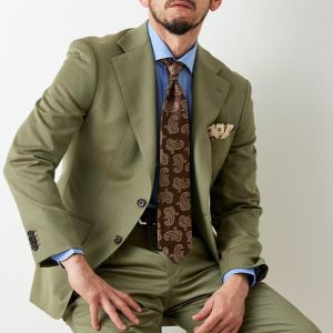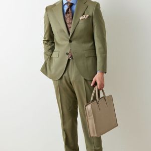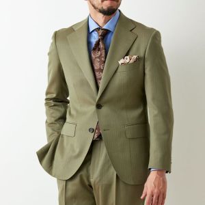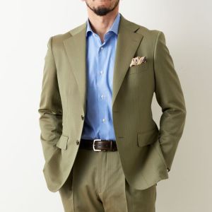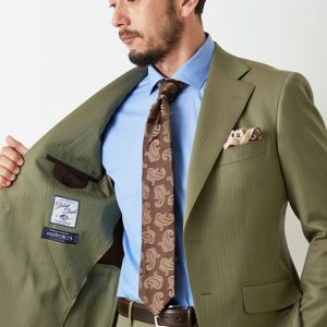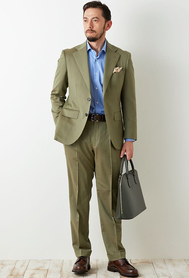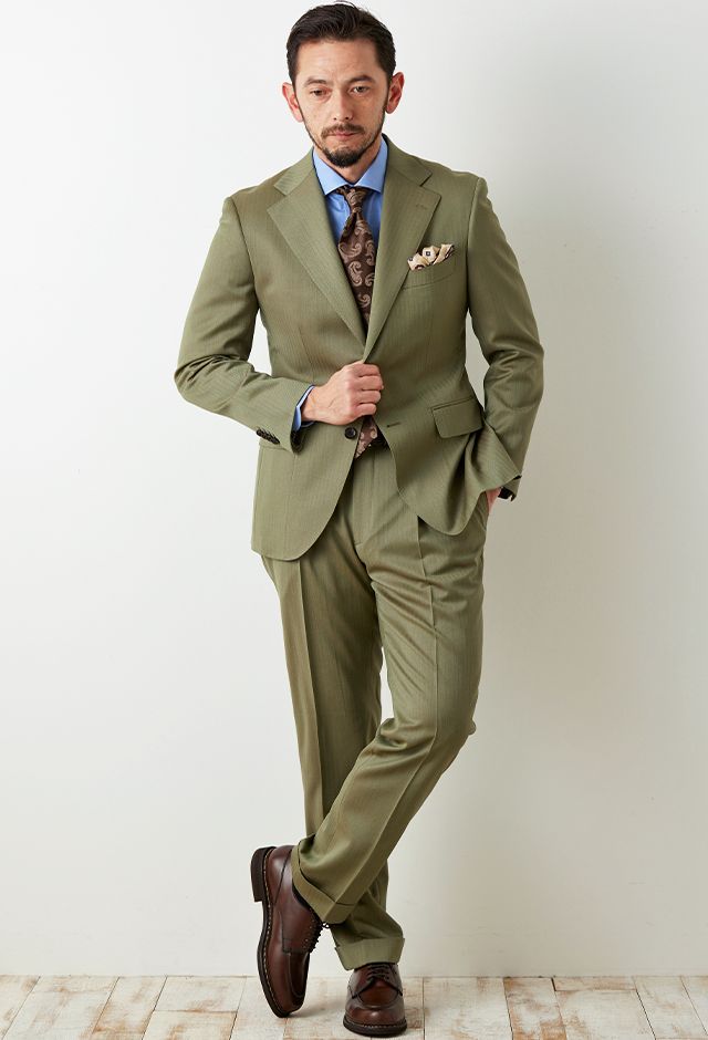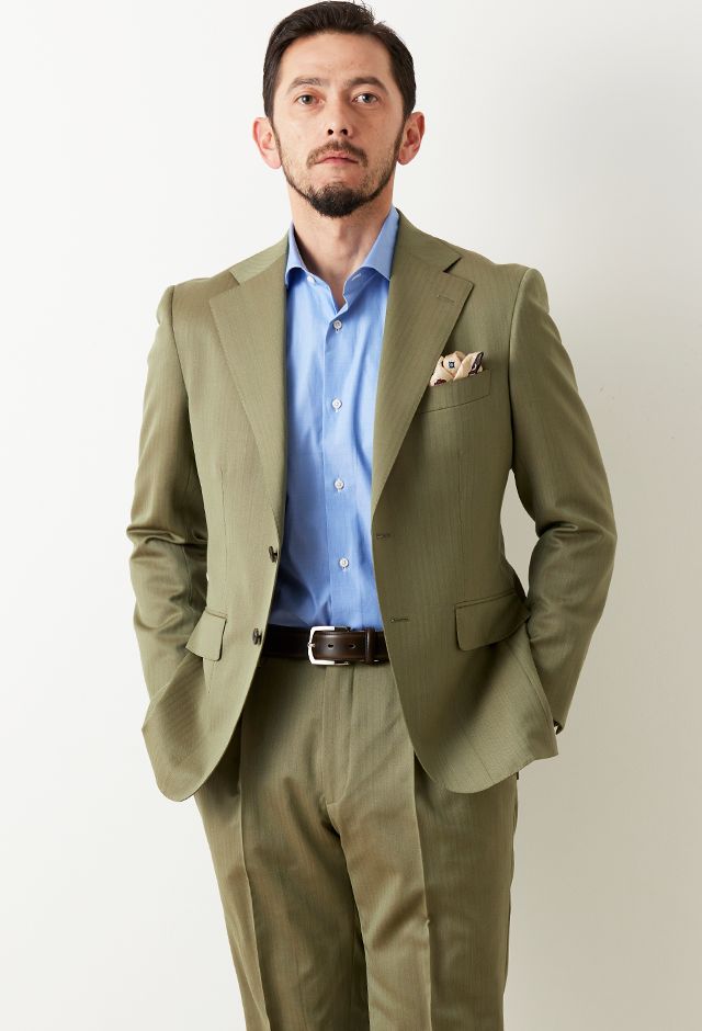 ストレッチ性の高い生地が大好評のイタリアブランド「トラバルド・トーニャ」で仕立てたスーツです。抹茶のようなカーキカラーにヘリンボーンストライプ柄の入ったスタイルで、オールシーズン着用していただけます。カイザーレジェロモデルで、一度羽織ると手放せなくなる軽い着心地を感じていただけます。ラペルの幅は程よい太さで、クラシックな雰囲気を演出。ブルーシャツ、ブラウンの小物でまとめたナチュラルな雰囲気の3色コーデです。