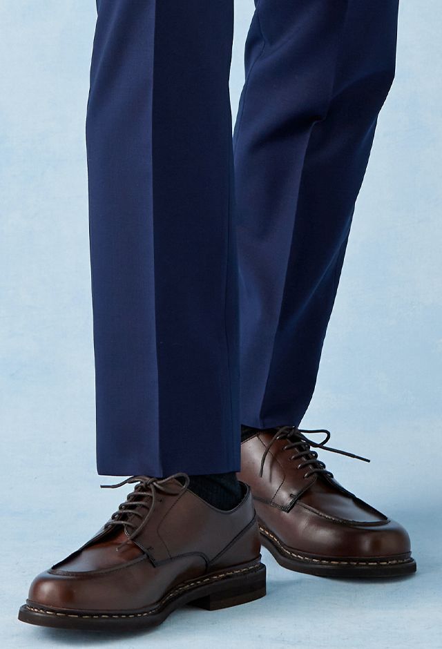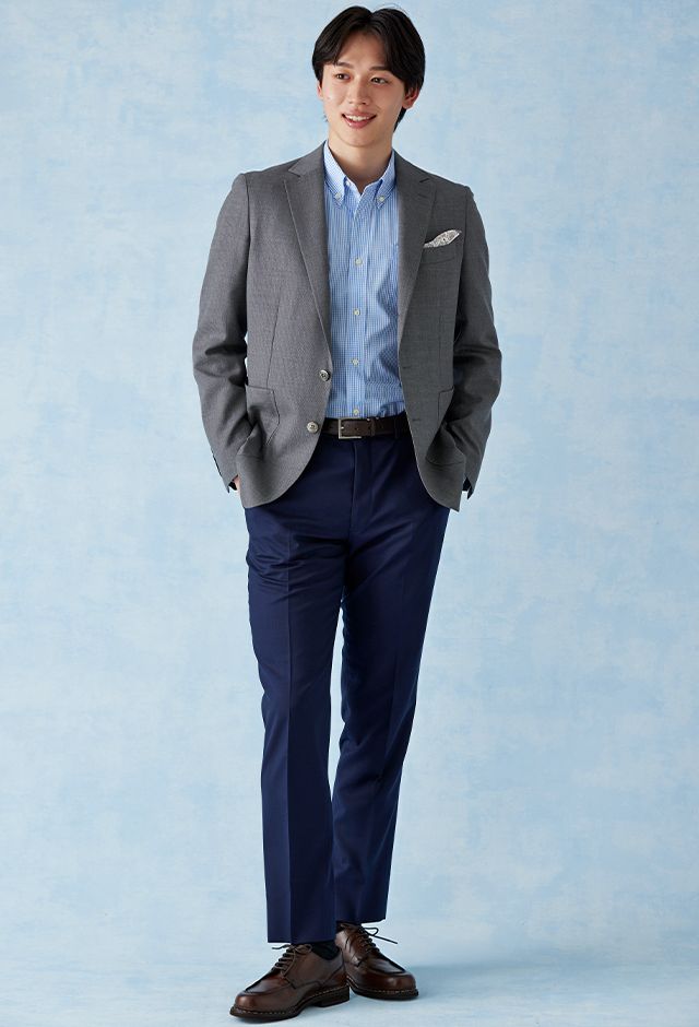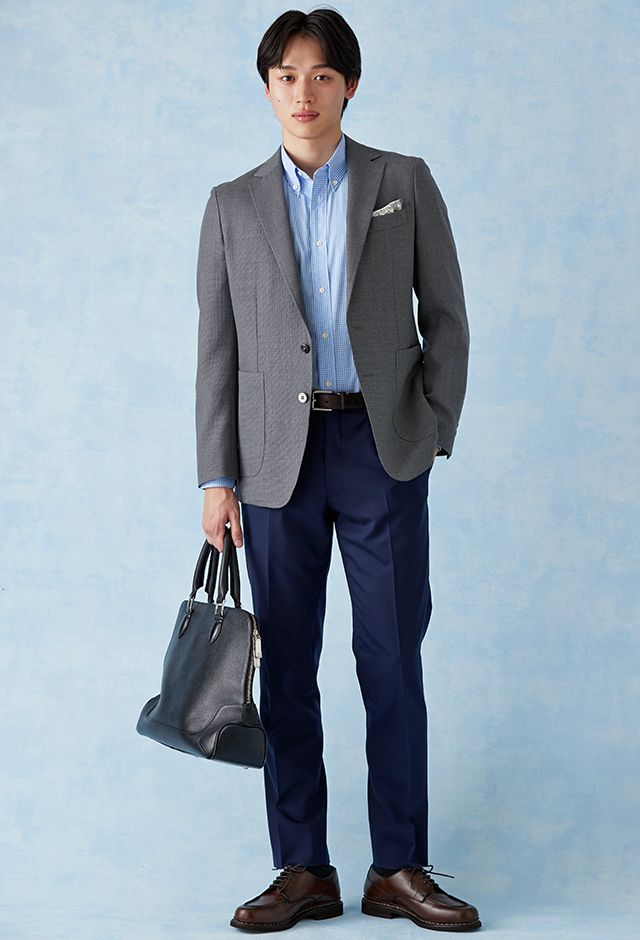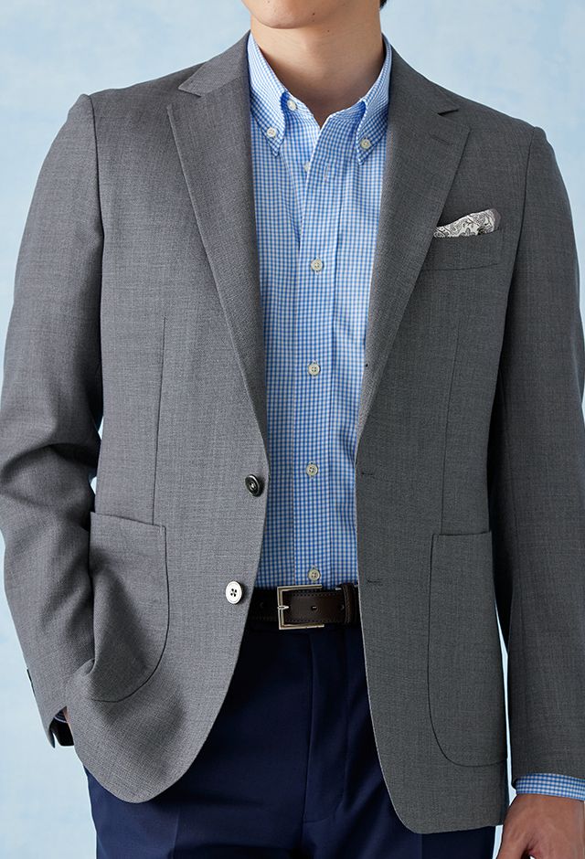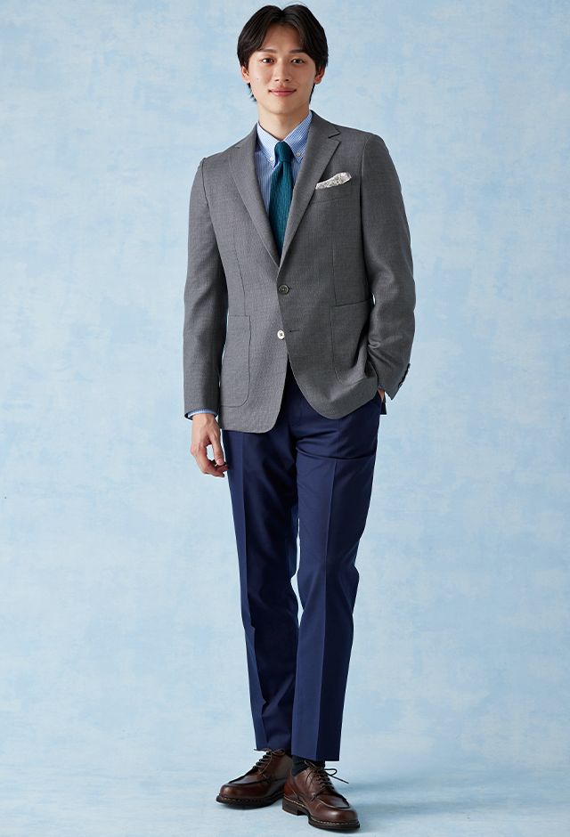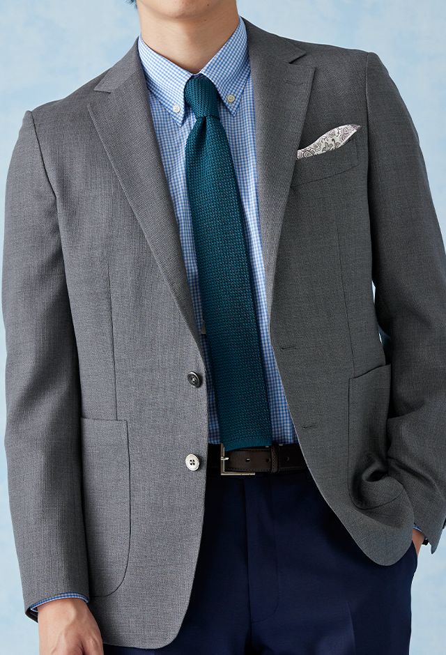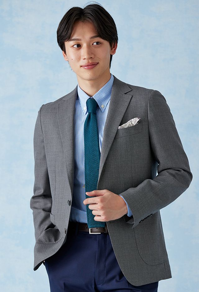 イタリアのノウハウを採用し、コストパフォーマンスに優れた「ビエラフィニッシュ」で仕立てたスーツです。落ち着いたグレー無地のジャケットで、春夏シーズンの生地になります。肩パットや芯地を極力排したアンコンモデルでジャケットを仕立てました。ジャケットはスタンダードなノッチドラペルを採用し、ビジネスシーンにも適した端正なデザインに。ネクタイの落ち着いたグリーンが全体に統一感を与えるコーディネートでまとめています。