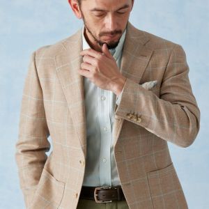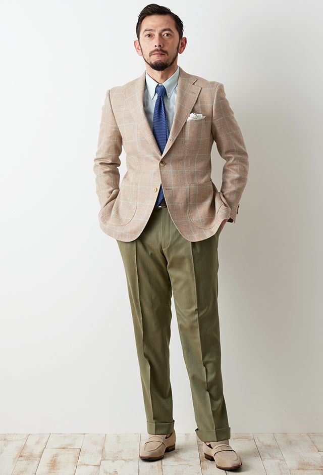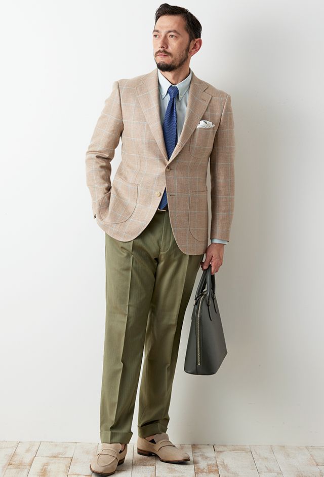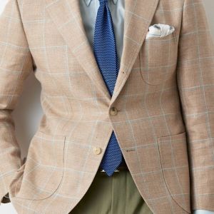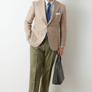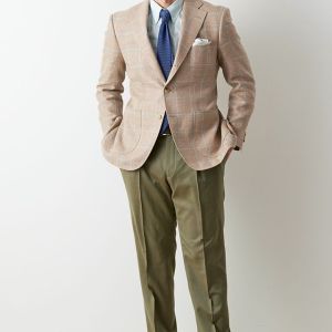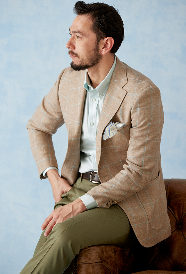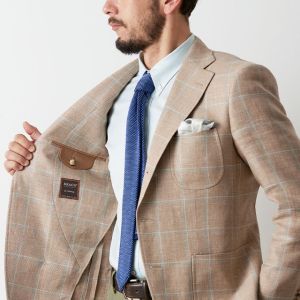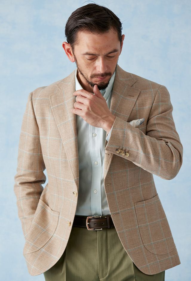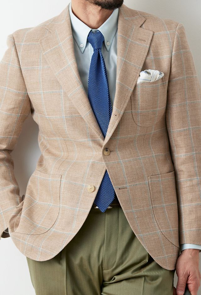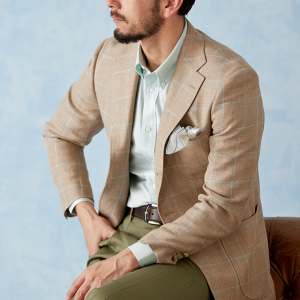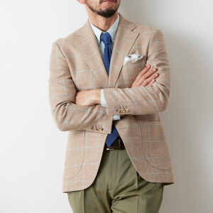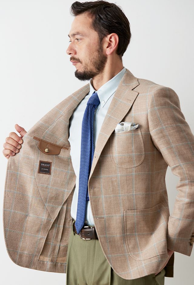 雨が多く多湿な気候を有する市場においても絶大な評価を獲得している「ドラゴ」で仕立てたスーツです。柔らかい雰囲気を持つ色使いが特徴のベージュ×ウィンドウペンチェック柄のスタイルで、オールシーズン着用していただけます。カイザーレジェロモデルで、一度羽織ると手放せなくなる軽い着心地を感じていただけます。ジャケットは見返しに表地を用いた贅沢な見返し仕様を採用。ブルーのボタンダウンシャツとネクタイを合わせることで、カジュアルながらも品のある雰囲気にしています。