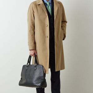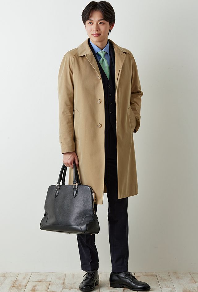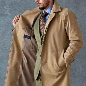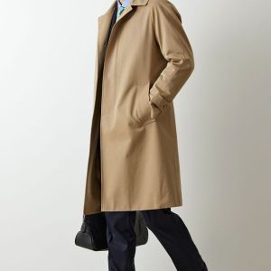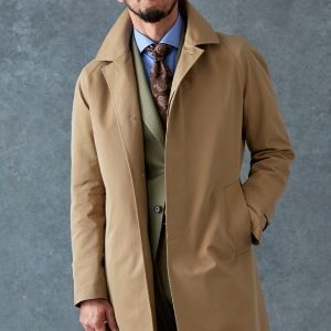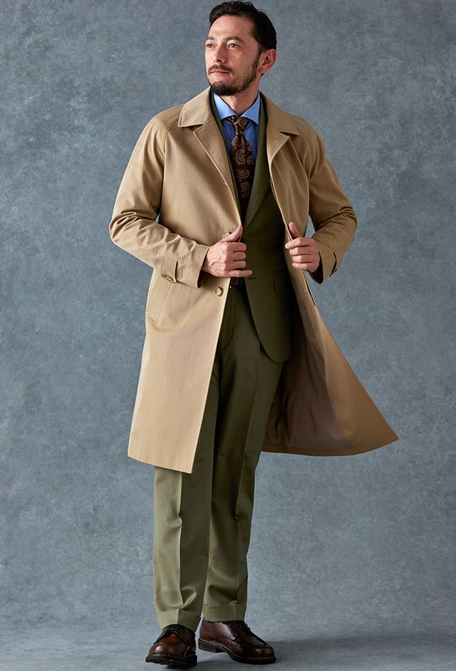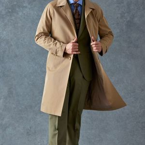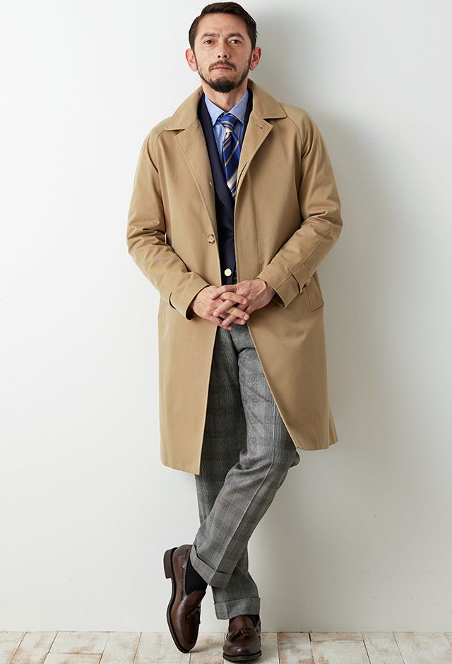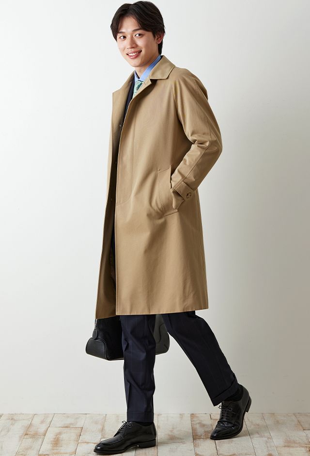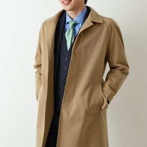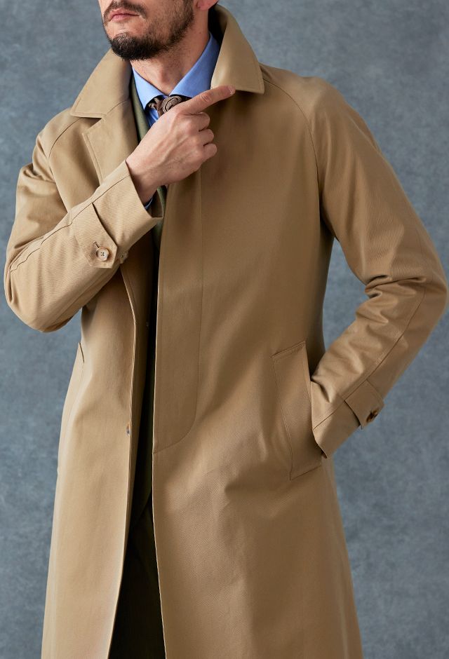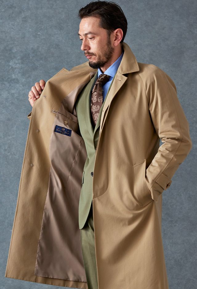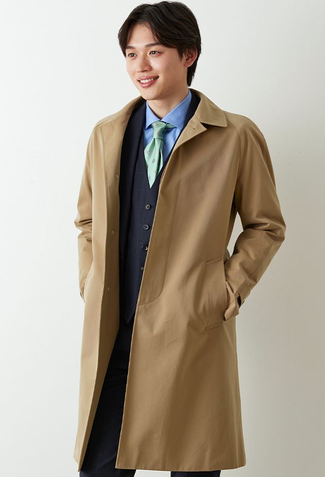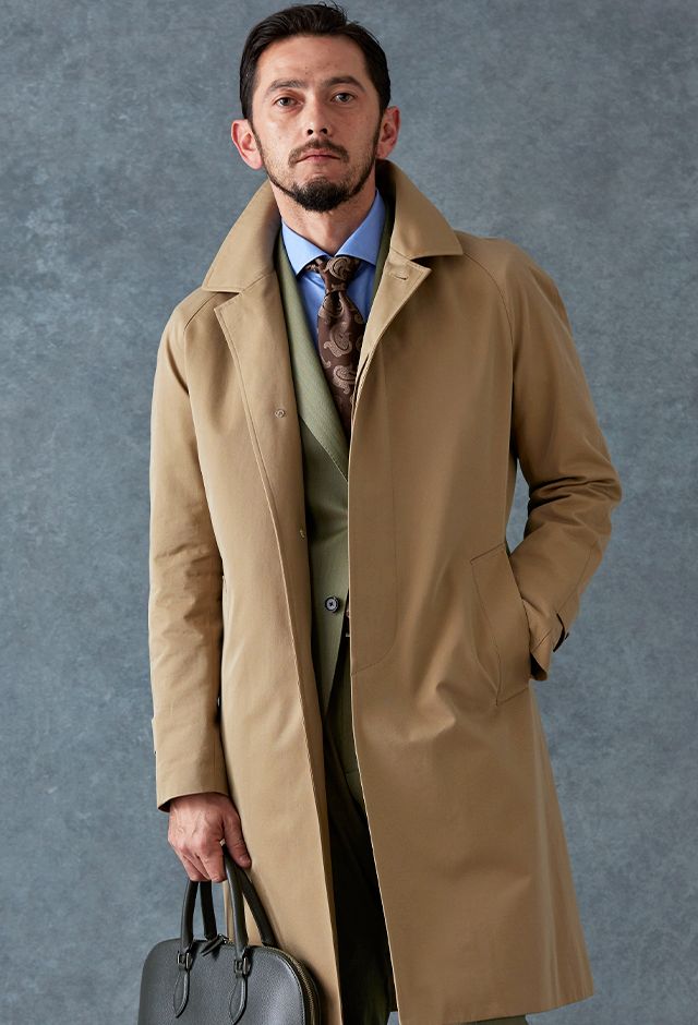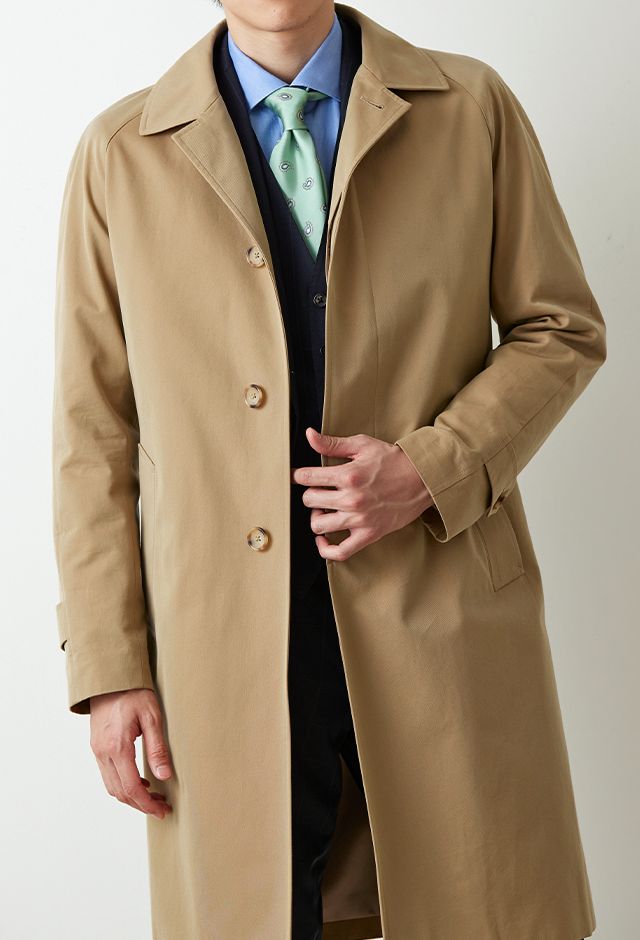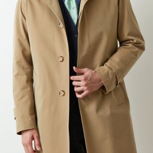 耐水・防風性に優れた高機能素材を持つ生地「オルメテックス」で仕立てたコートです。カジュアルなベージュ色の無地柄で、オールシーズン着用していただけます。トレンドに左右されにくく、長く愛用できるトラディショナルなステンカラーコートに仕立てました。膝上の使いやすい丈感と、ハコポケットで全体的に扱いやすいスタイルに。ボタンは表地のベージュとも調和する落ち着いたブラウンをチョイス。王道のネイビースーツからカジュアルなジャケパンまで、幅広いシーンに重宝します。