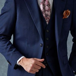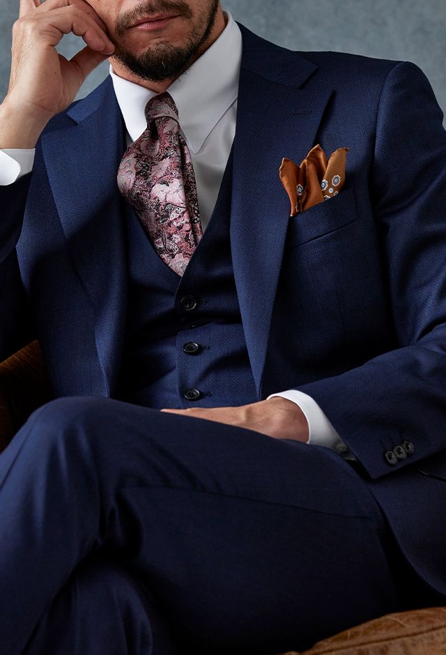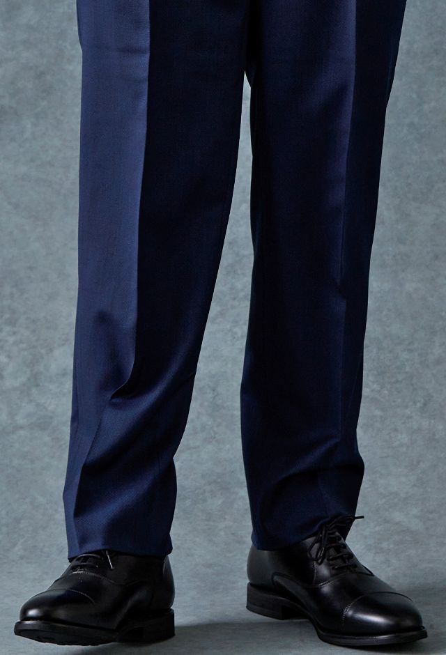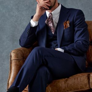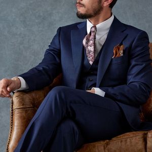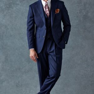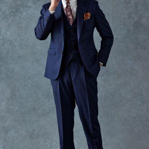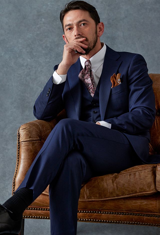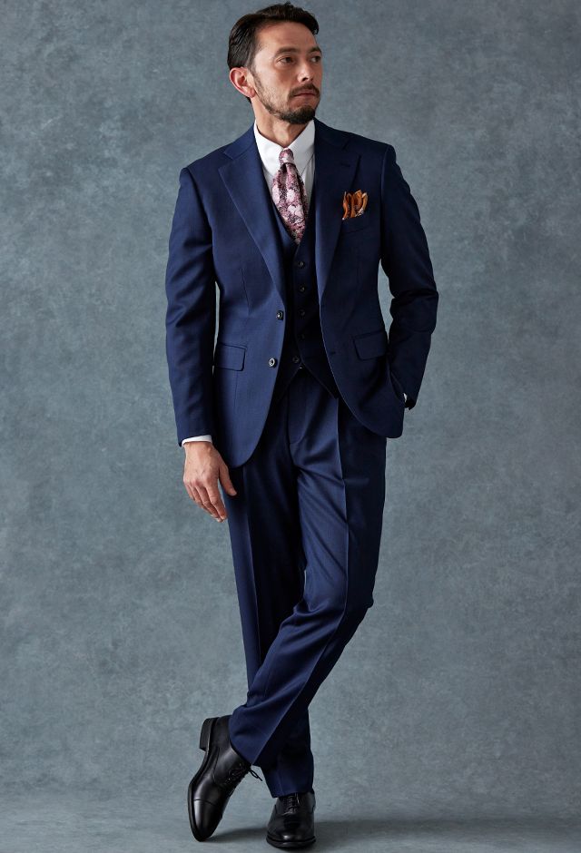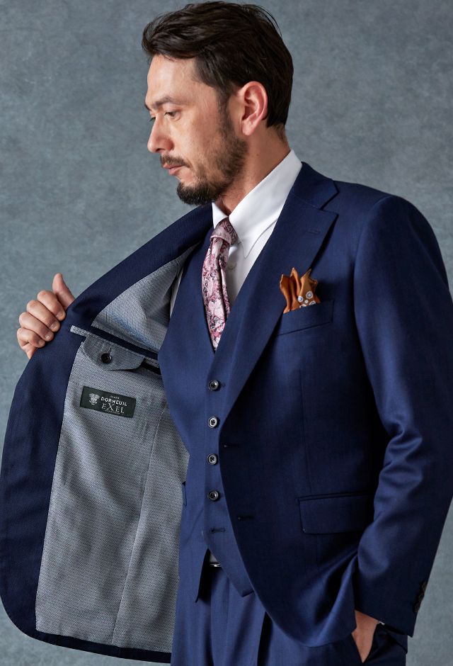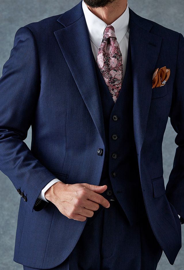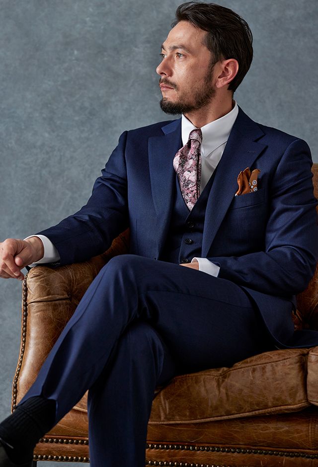80ケ国以上にファンを持つ世界的なイギリスブランド「ドーメル」で仕立てたスーツです。ダークネイビーに、ピンヘッドに似た組織柄がさり気なく入ったスタイルで、オールシーズン着用していただけます。最高峰グレードの「カイザーモデル」で極上の着心地を味わうことが出来ます。裏地には上品なシルバーのダイヤ柄を採用。パンツの裾口もスッキリとしたシングルタイプに。ピンクの桜模様のネクタイをアクセントにした、セレモニーシーンでも重宝するコーデです。