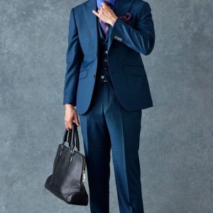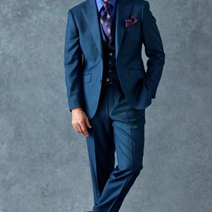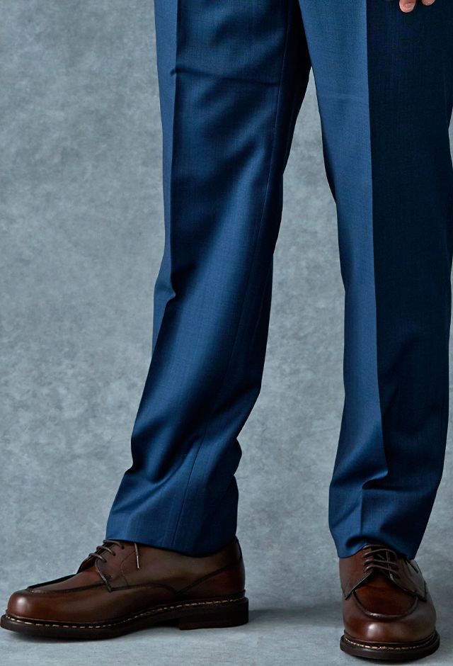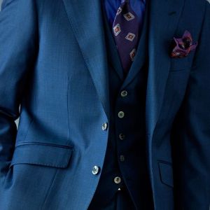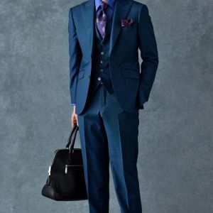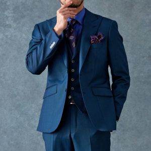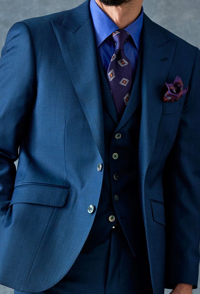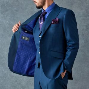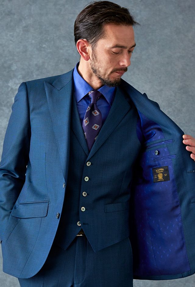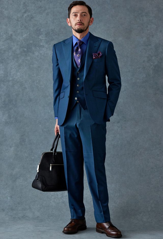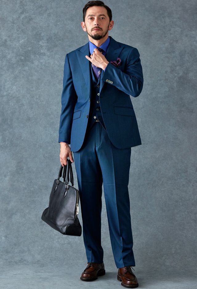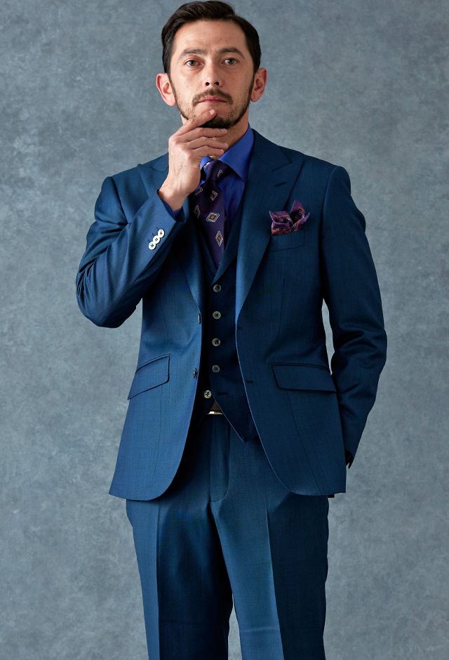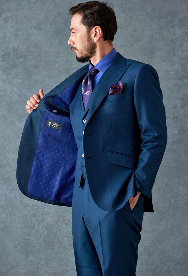 80ケ国以上にファンを持つ世界的なイギリスブランド「ドーメル」で仕立てたスーツです。艶感が際立つ表情のあるシャークスキンに、少し青味がかったブルーグリーンの組み合わせで、オールシーズン着用していただけます。最高峰グレードの「カイザーモデル」で極上の着心地を味わうことが出来ます。裏地には深みのシックなブルーカラー、ジャケットの襟はピークドラペルをチョイス。パープルのネクタイとチーフを合わせることでお洒落と色気を両立したコーデに仕上げました。