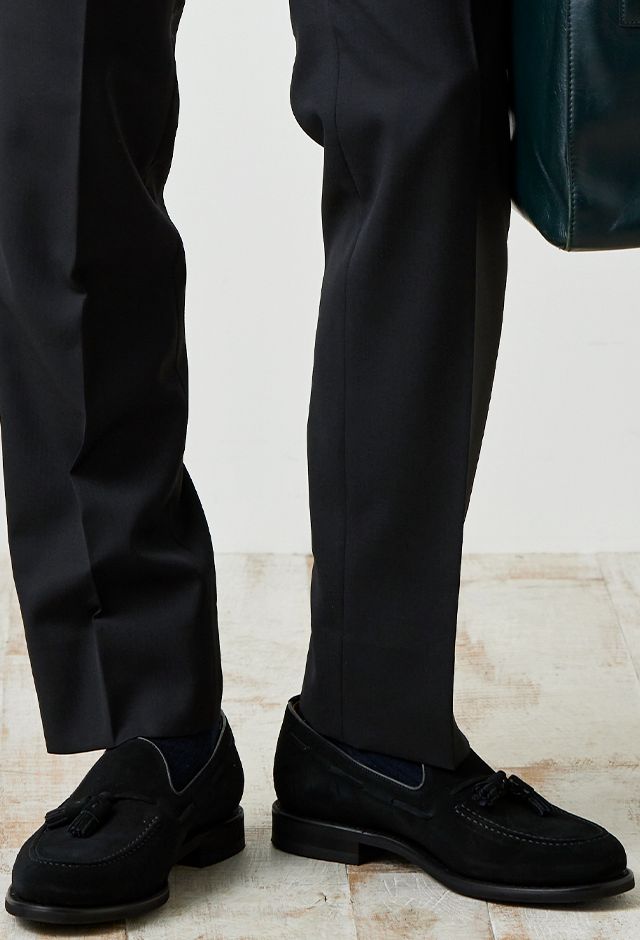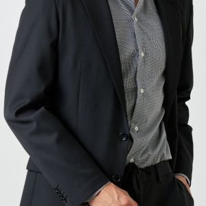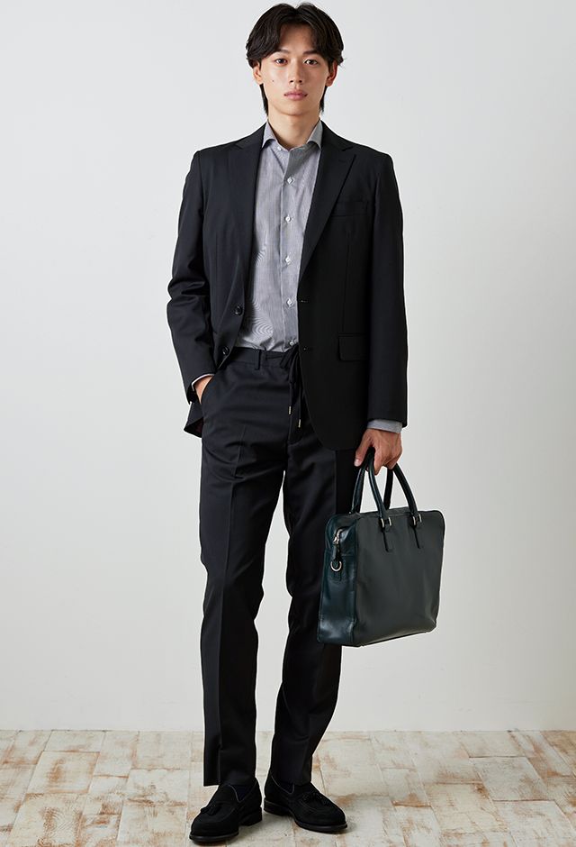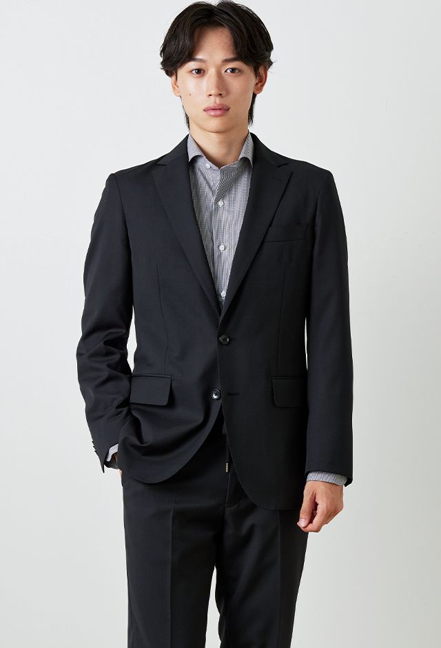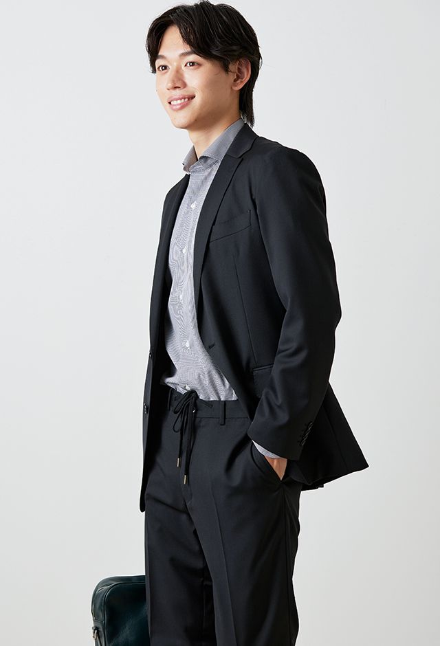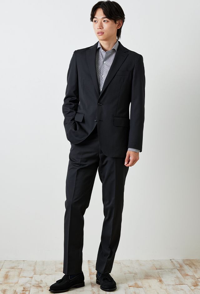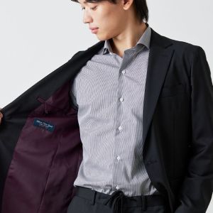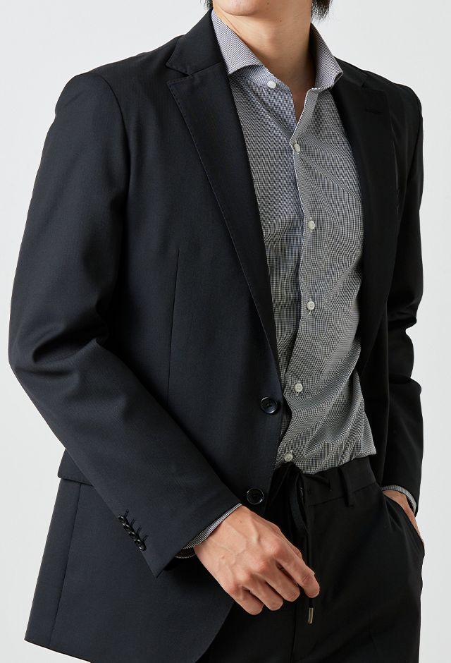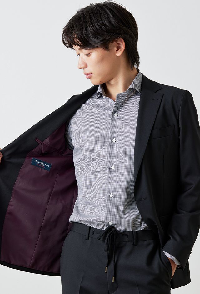 ウールのような上質な風合いを持ち、優れた通気性と耐久性、さらに撥水性を兼ね備えた「マイクロファイバースパン」で仕立てたスーツです。洗練されたシンプルな無地のブラックで、オールシーズン着用していただけます。空気を纏うような着心地を楽しむアンコンモデルでジャケットを仕立てました。裏地には深みのあるえんじ色を選択。熟成された大人の印象を高めてくれます。控えめなギンガムチェックのシャツと合わせて、ビジネスカジュアルでも使いやすくフレッシュ感もあるスタイルに仕上げました。※生地在庫、生地入荷時期などは変動いたしますのでご了承くださいませ。