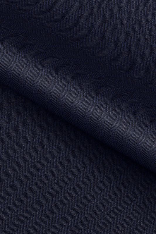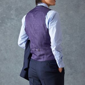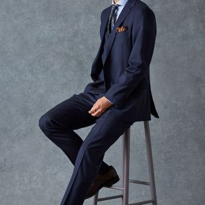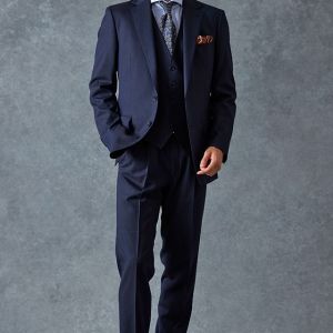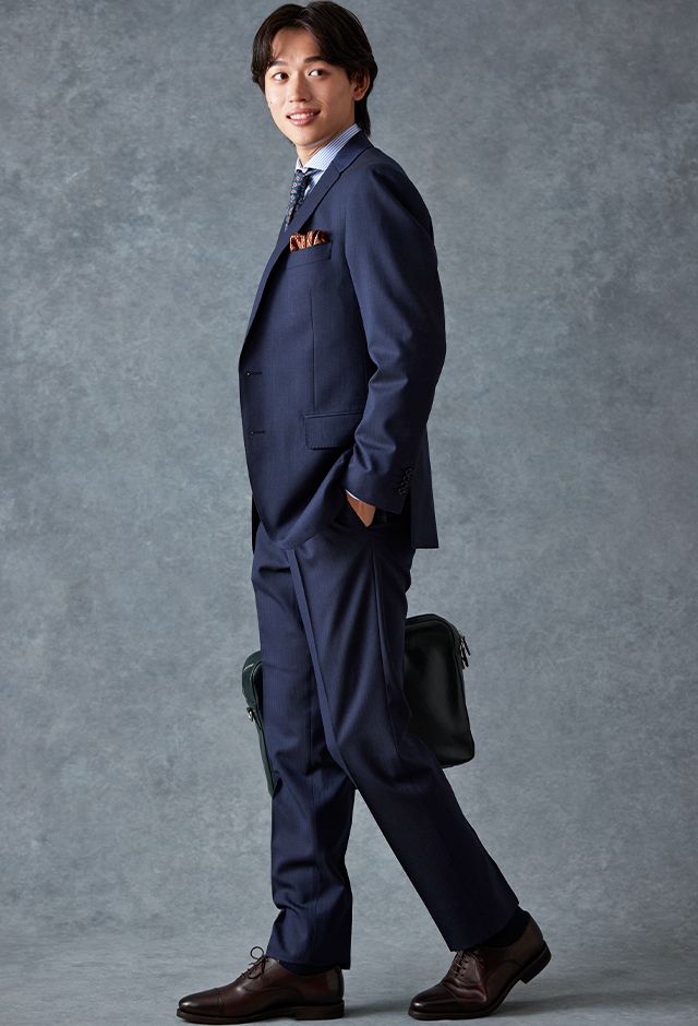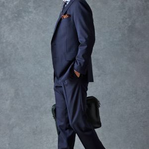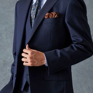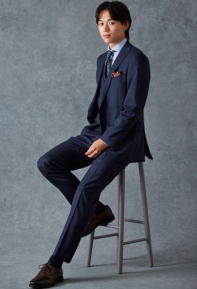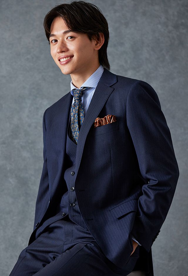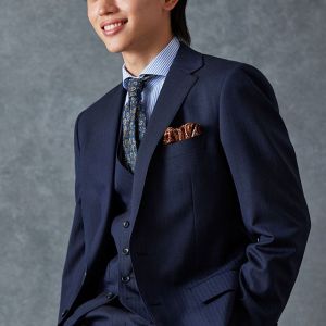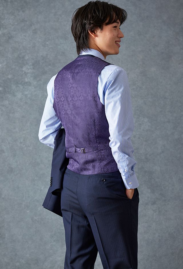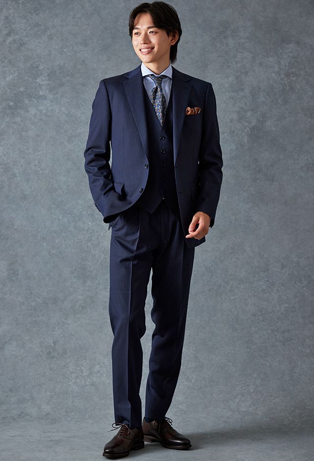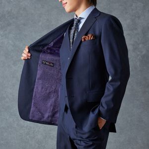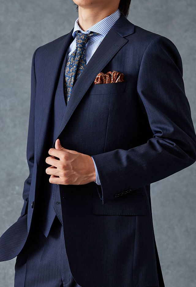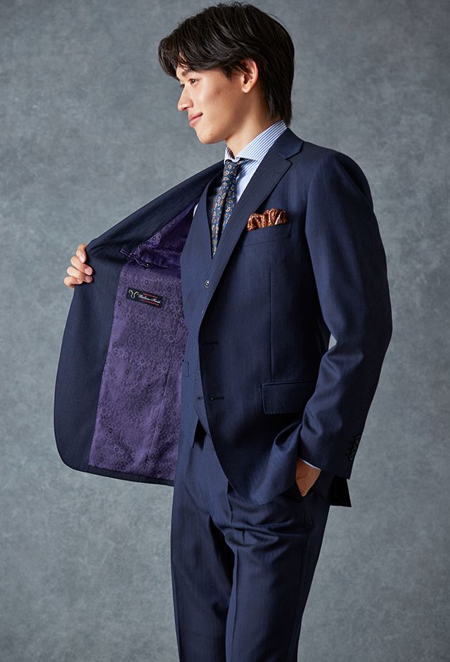 イタリアのノウハウを採用し、コストパフォーマンスに優れた「ビエラーノフィニッシュ」で仕立てたスーツです。うっすらとストライプの入った王道なネイビーで、オールシーズン着用していただけます。クラシックな部分とセクシーさを融合したモダンクラシックモデルで仕立てました。大人の色気を忍ばせる、鮮やかな紫の裏地が着用者の魅力をより一層引き立てます。ブルーストライプのシャツにペイズリー柄をちりばめたネクタイを組み合わせて、爽やかさと華やかさを演出。セレモニーのシーンでも着用できるコーディネートに。※生地在庫、生地入荷時期などは変動いたしますのでご了承くださいませ。