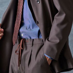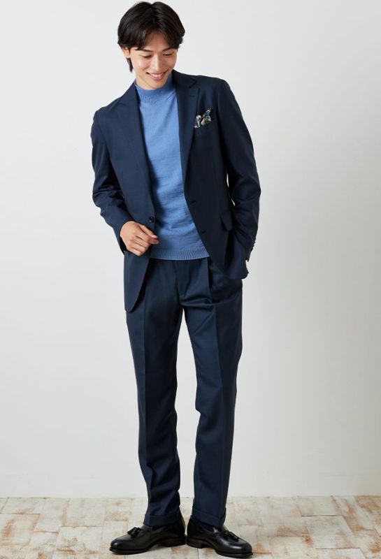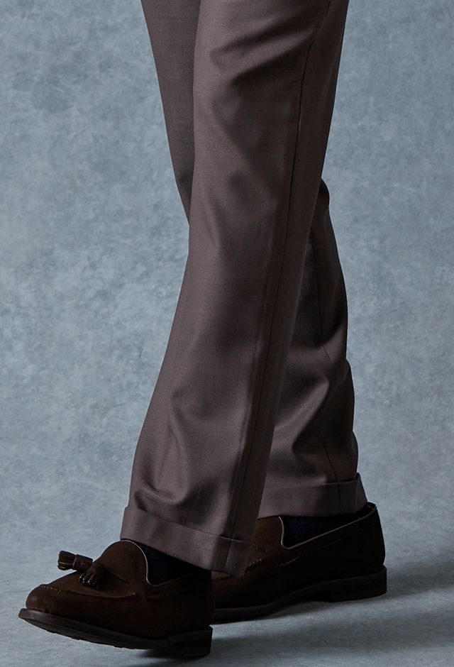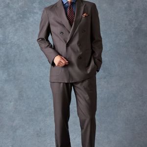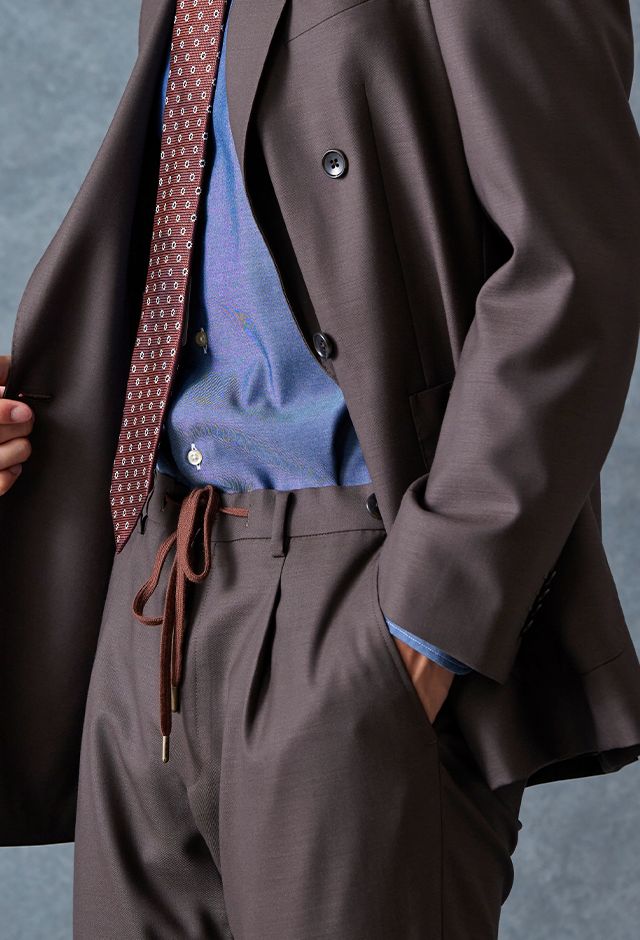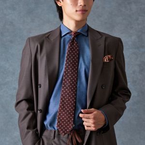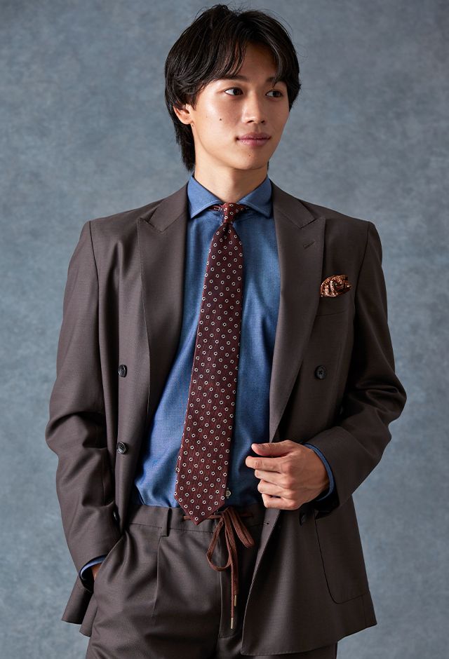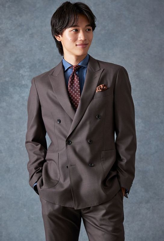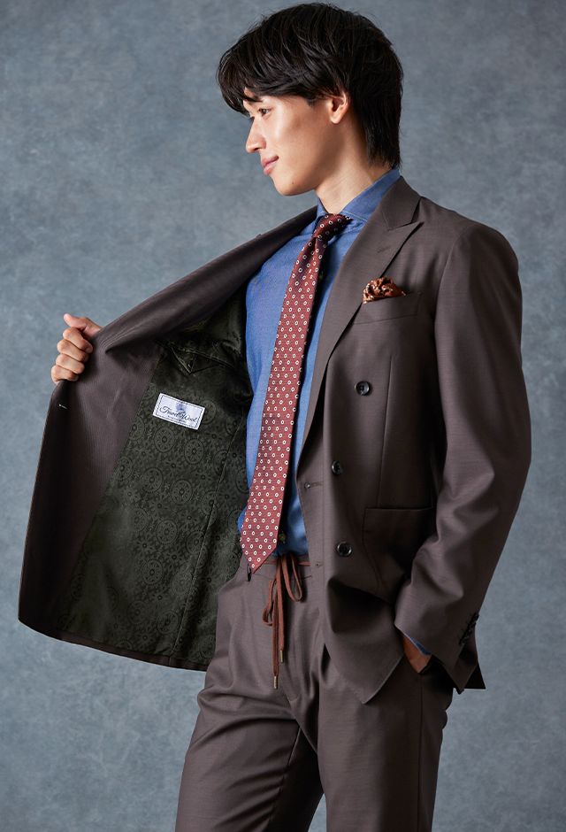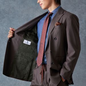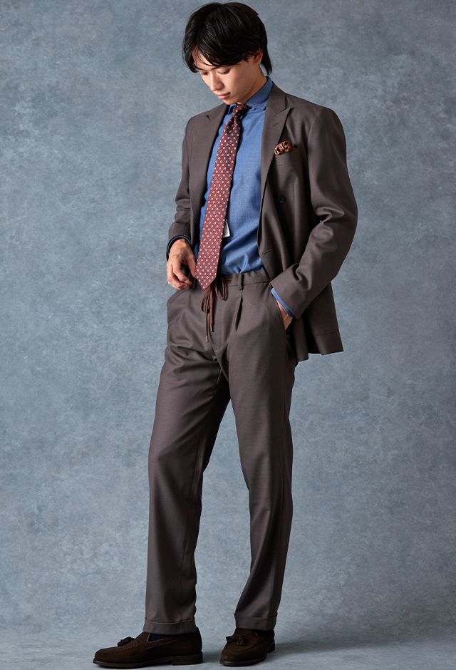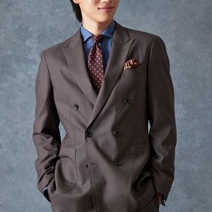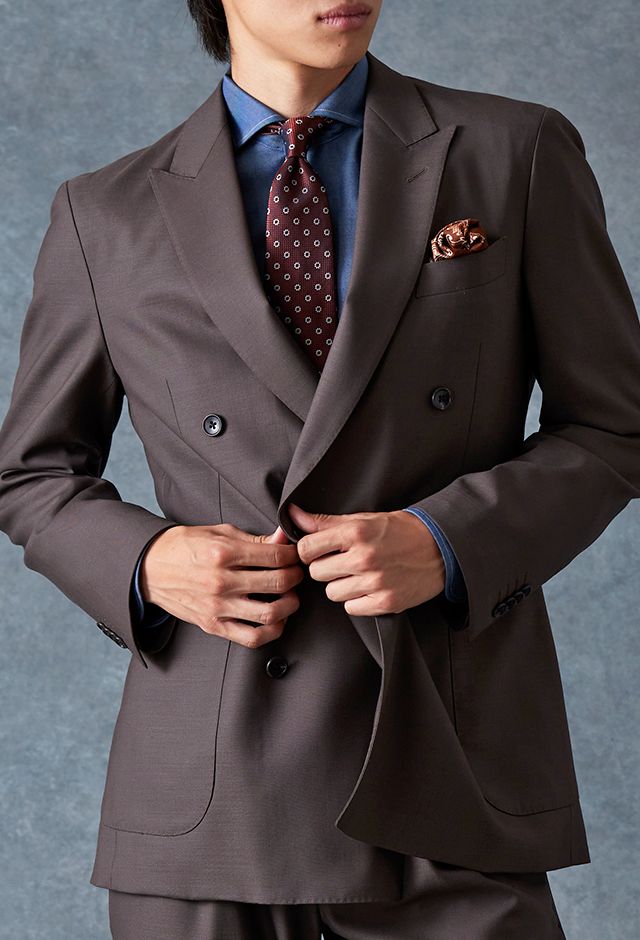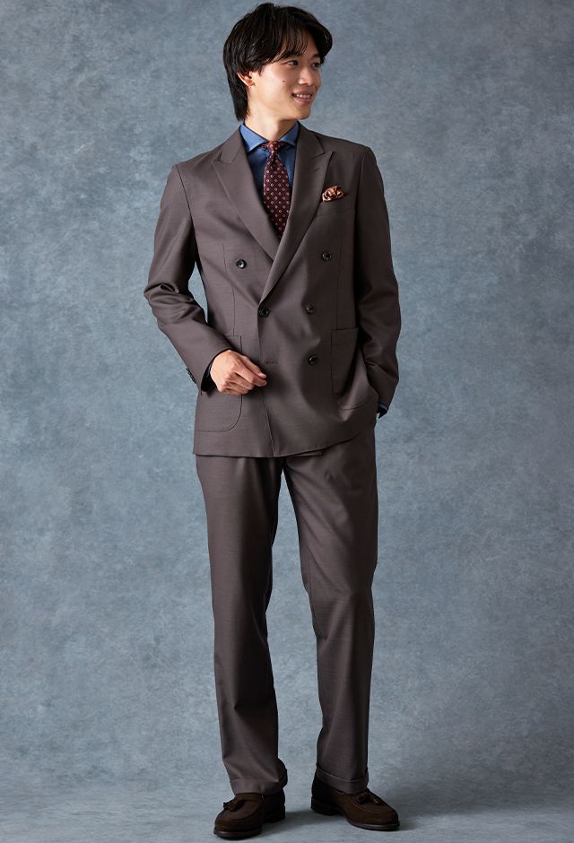 防シワ性やストレッチ性に優れ、出張・外回りの際にも美しいシルエットと着心地を実現できるオリジナルブランド「トラベルウール」で仕立てたスーツです。大人の雰囲気が漂うグレージュで、オールシーズン着用していただけます。空気を纏うような着心地を楽しむアンコンモデル(ダブル)でジャケットを仕立てました。ジャケットにはピークドラペルを採用し、裏地にはモスグリーンで落ち着きを表現。ブルー無地のシャツで清潔感を取り込みつつ、ジャケットの色味に合わせたチーフを組み合わせることで一体感を感じる雰囲気に仕上げました。※生地在庫、生地入荷時期などは変動いたしますのでご了承くださいませ。