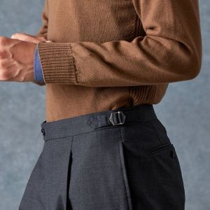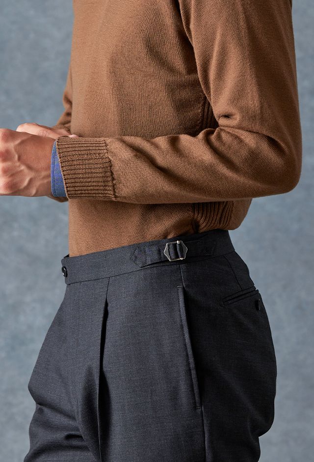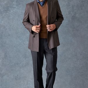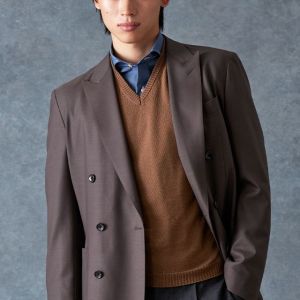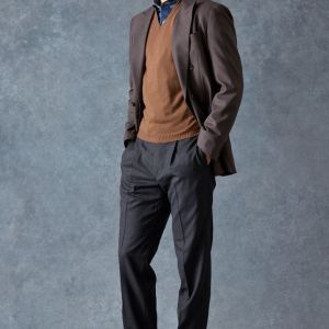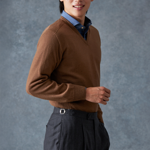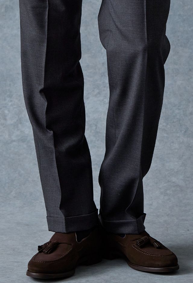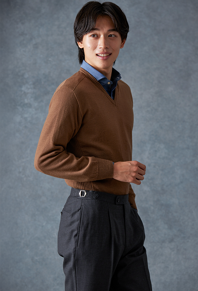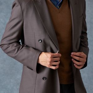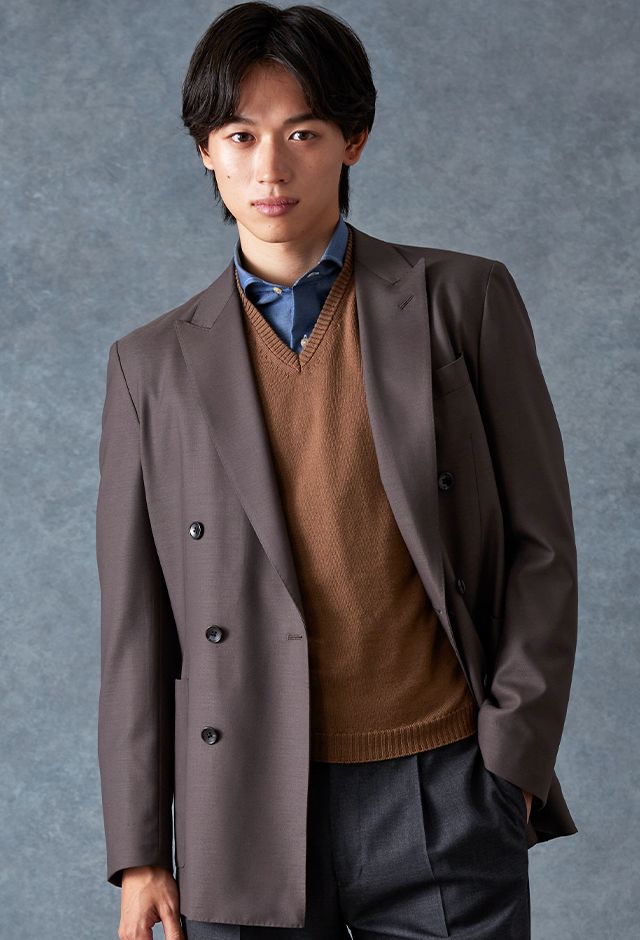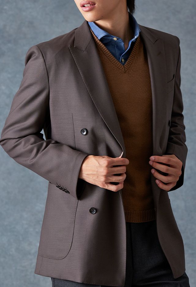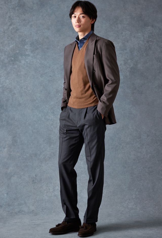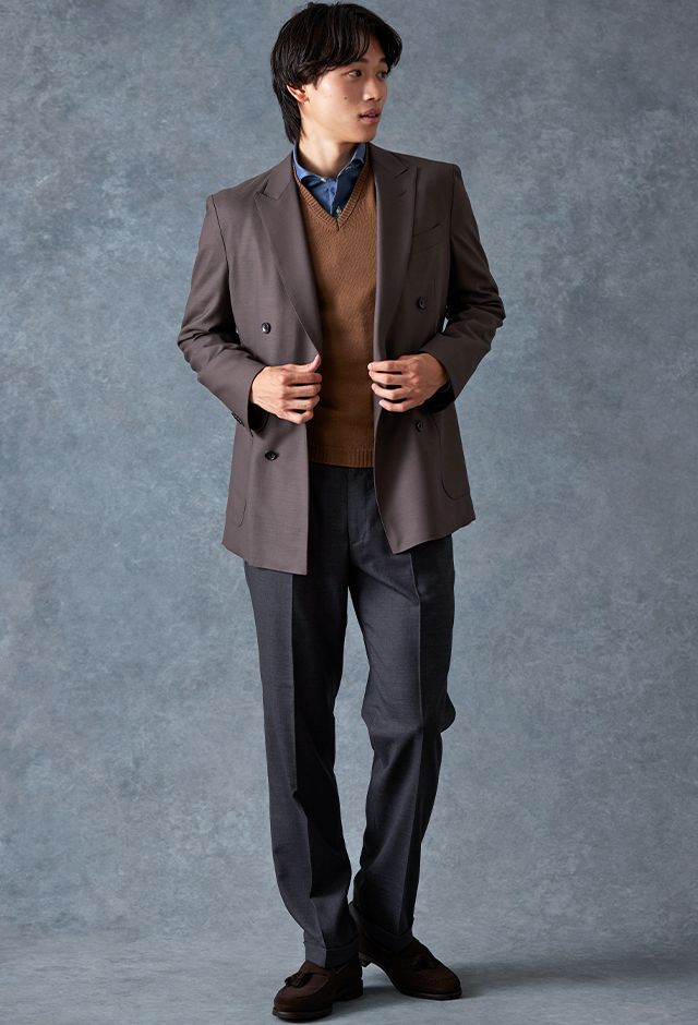 防シワ性やストレッチ性に優れ、出張・外回りの際にも美しいシルエットと着心地を実現できるオリジナルブランド「トラベルウール」で仕立てたスーツです。オーセンティックな印象のあるグレージュで、オールシーズン着用していただけます。とても軽い着心地を楽しむアンコンモデル(ダブル)でジャケットを仕立てました。アウトポケットにすることでカジュアルさも併せ持つ、様々なシーンで着用できるいいとこどりのスタイルに。ブルー無地シャツにブラウンのVネックニットを組み合わせ、秋冬の装いらしいコーディネートに仕上げました。