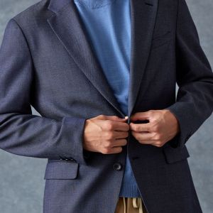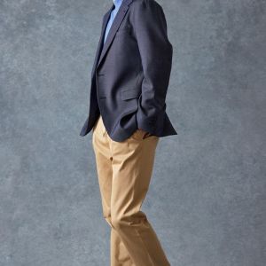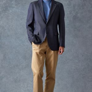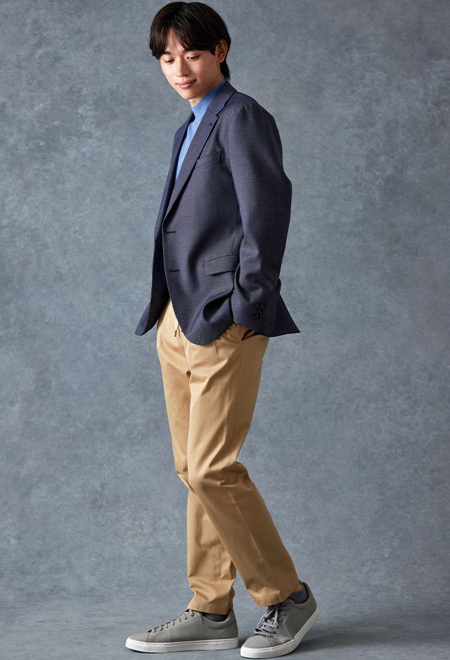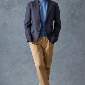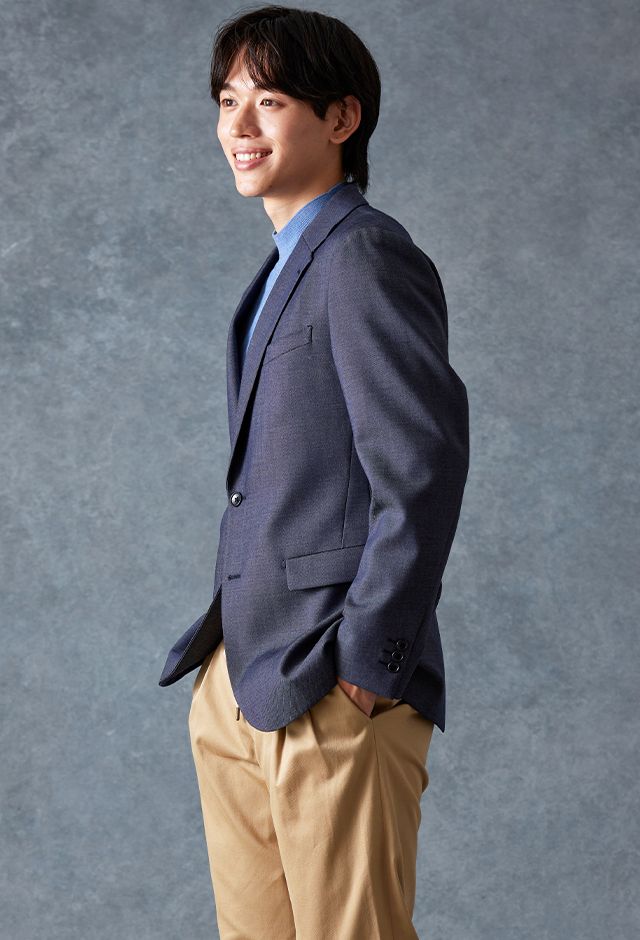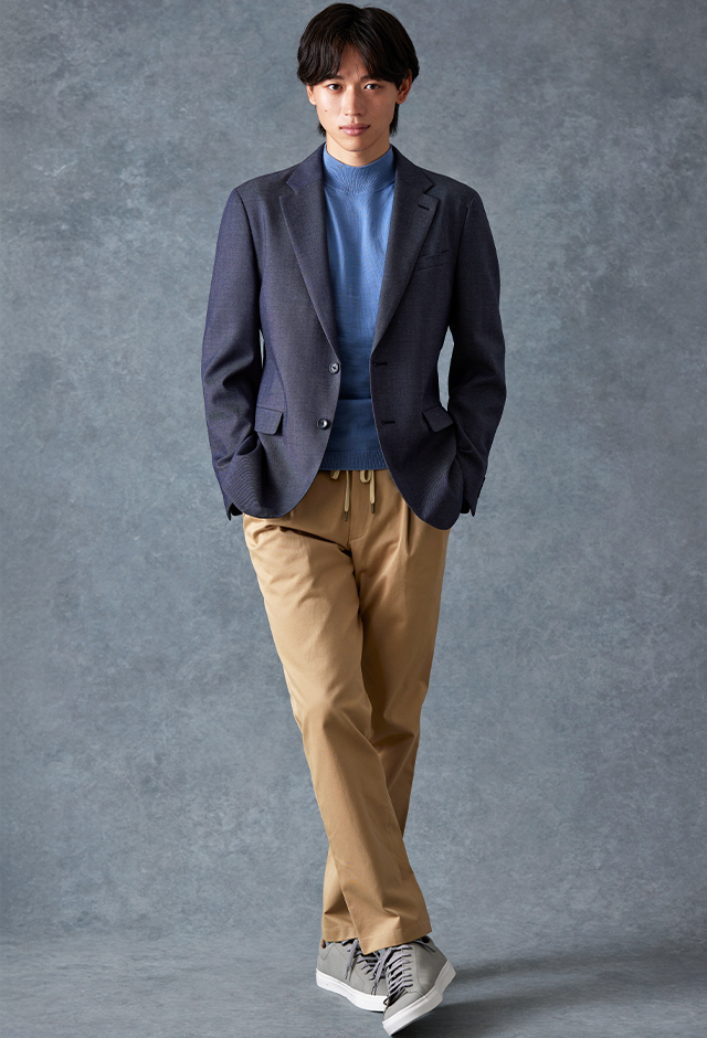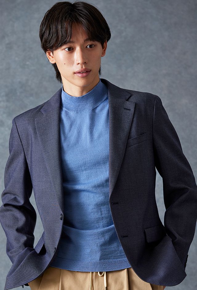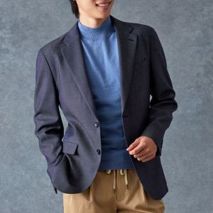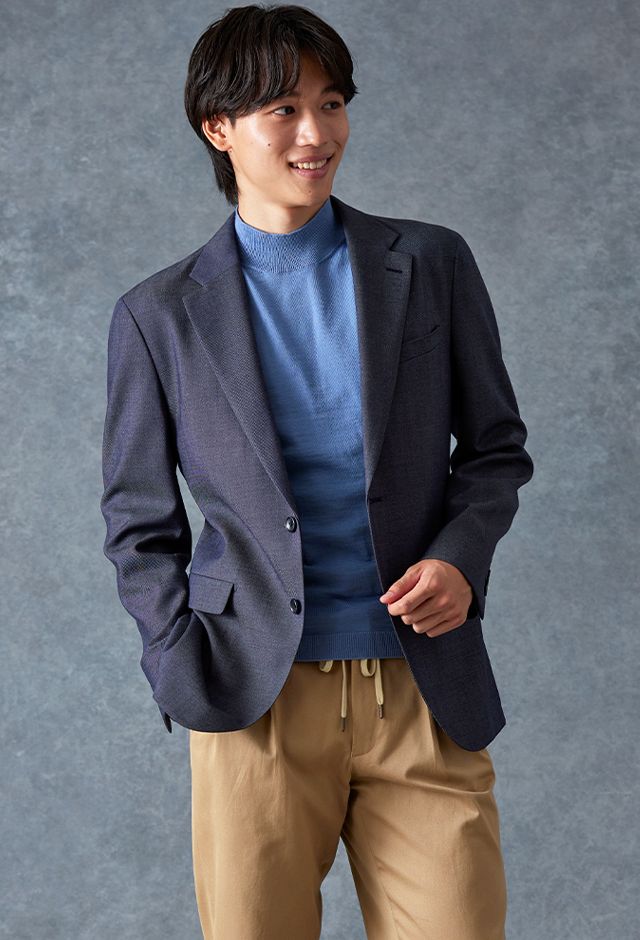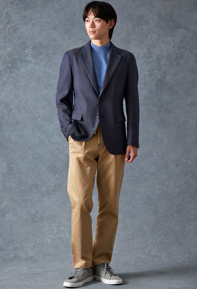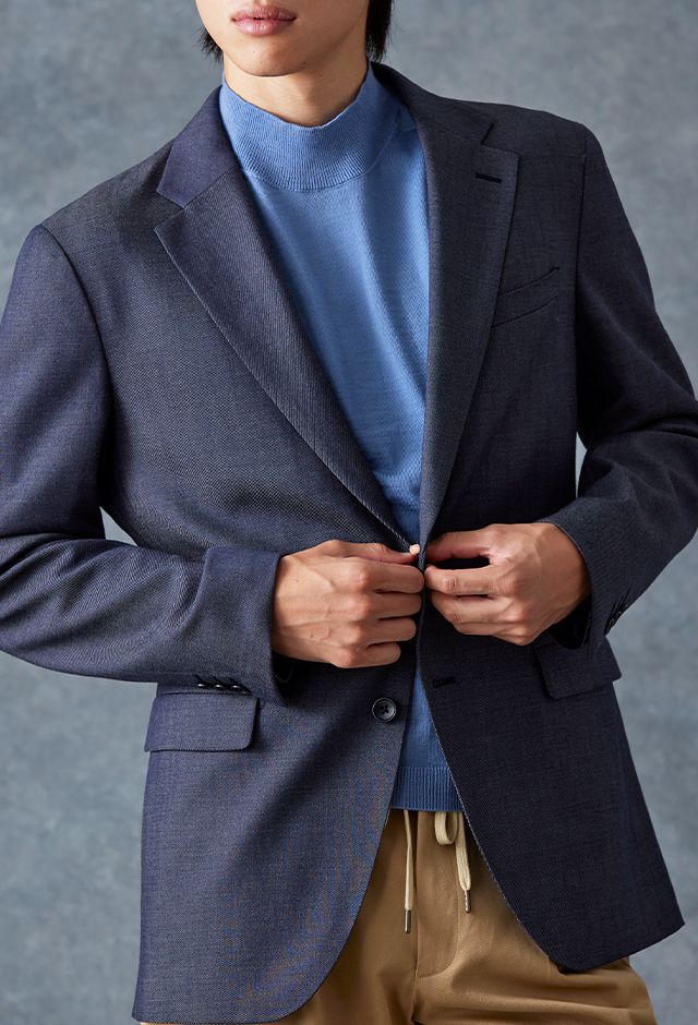 トレンドをふんだんに取り入れたデザイン性が特徴の「マルゾット」で仕立てたスーツです。シーンを選ばず扱いやすいネイビーで、オールシーズン着用していただけます。肩パットや芯地を極力排したアンコンモデルでジャケットを仕立てました。マットな質感のボタンを採用し、3つボタンにすることでミニマルな佇まいに。ブルーのニットシャツとベージュのイージースラックスを組み合わせ、休日にもビジネスにも着まわせるスタイルに仕上がっています。