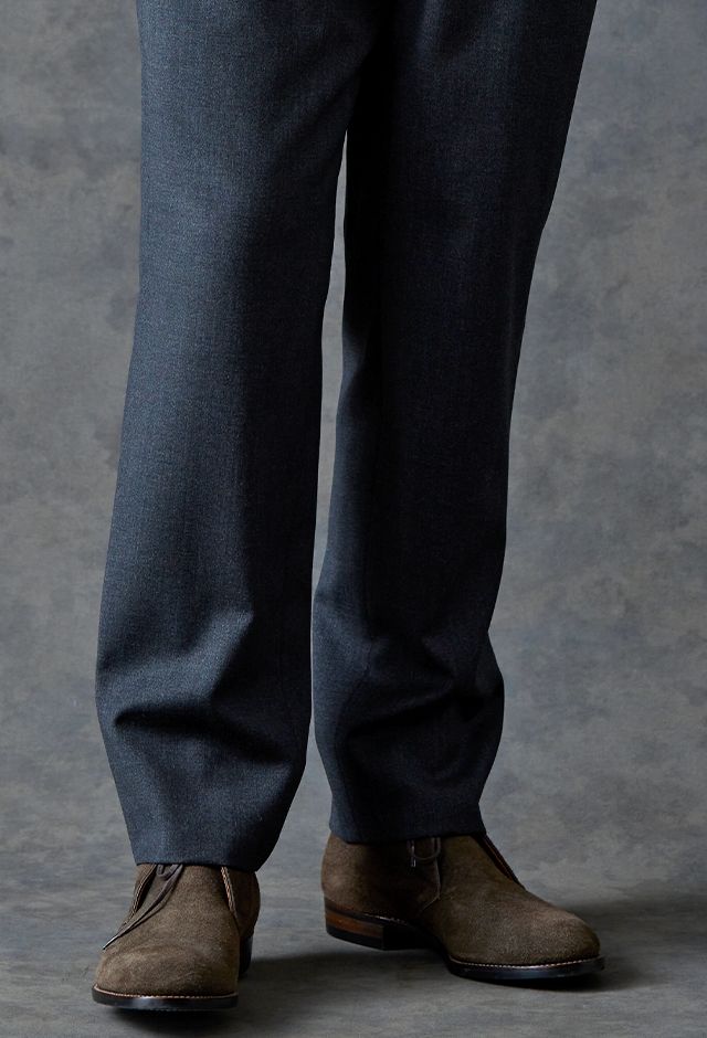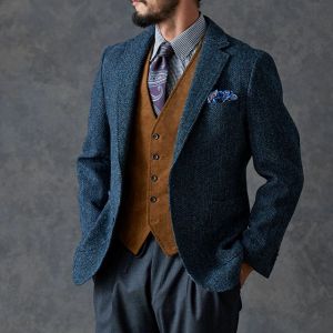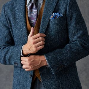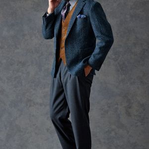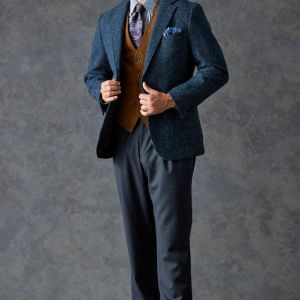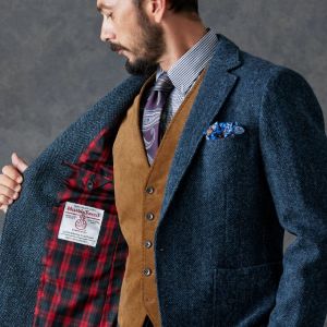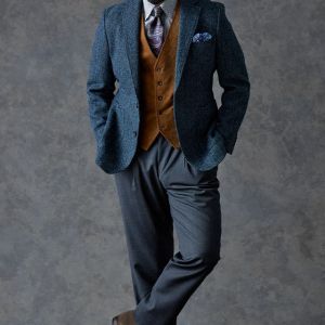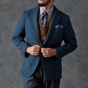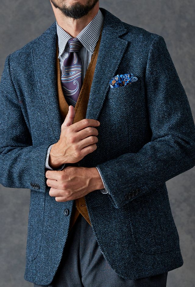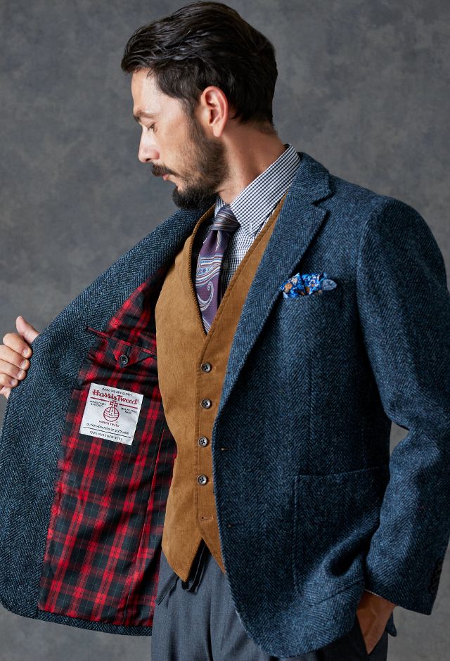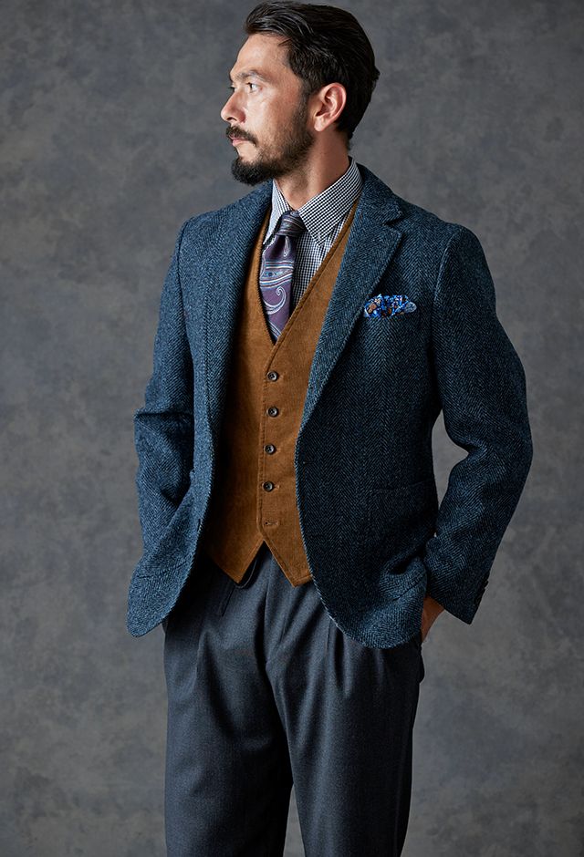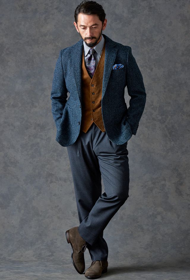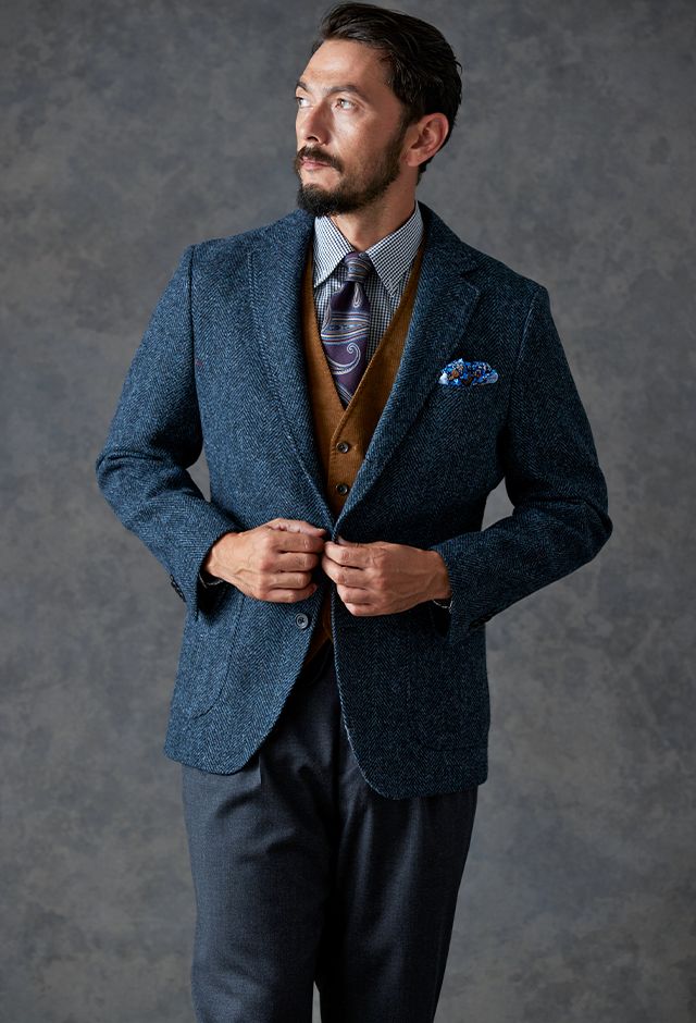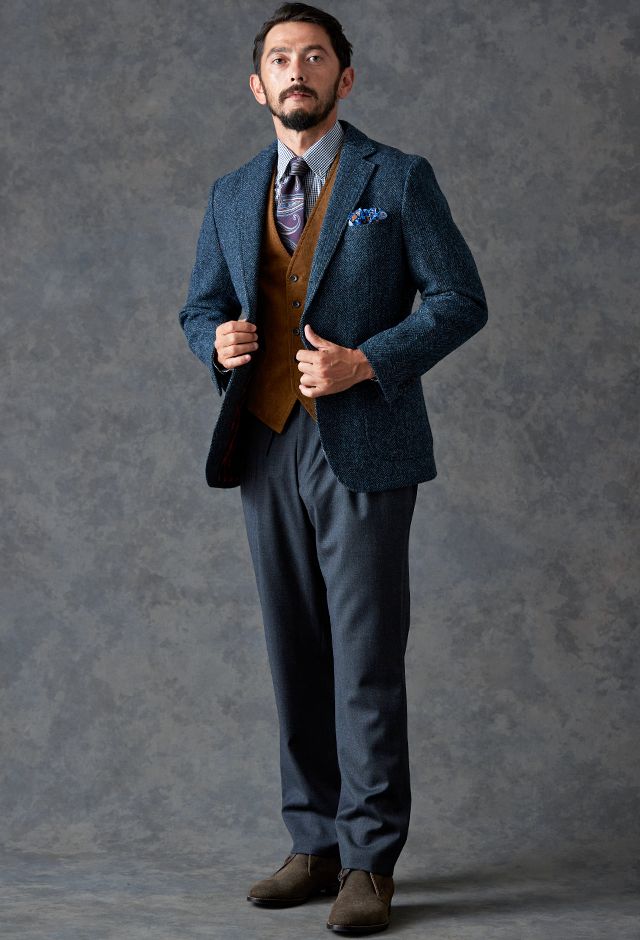 世界で唯一国に保護されている伝統的な生地ブランド「ハリスツイード」で仕立てたスーツです。温かみと素朴さを兼ね備えたネイビー×ヘリンボーンのスタイルで、秋冬シーズンの生地になります。肩パットや芯地を極力排したアンコンモデルでジャケットを仕立てました。ミシンステッチを施し、カジュアルさとすっきりした印象を与えます。ジャケット、ベスト、パンツをあえて異なる素材で組み合わせることで、奥行きのあるスタイルを実現。上質さと遊び心を両立させた大人のコーディネートです。