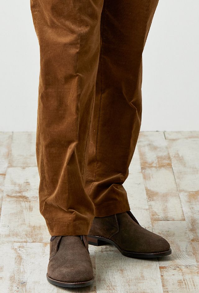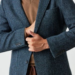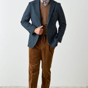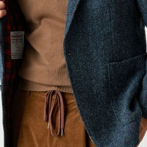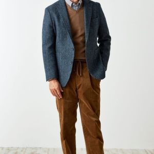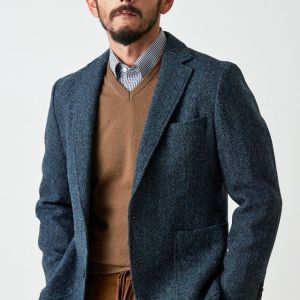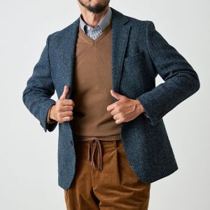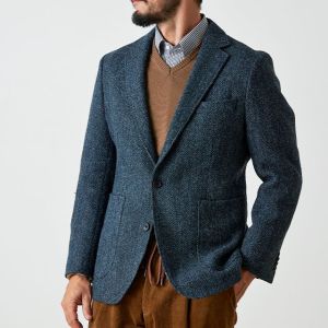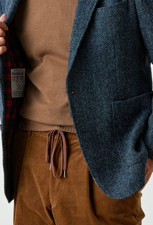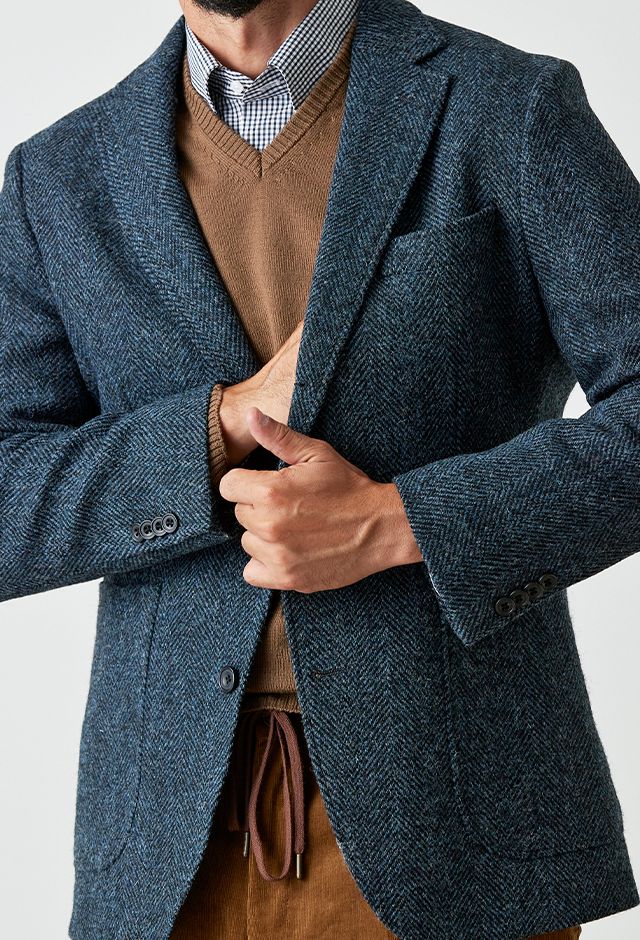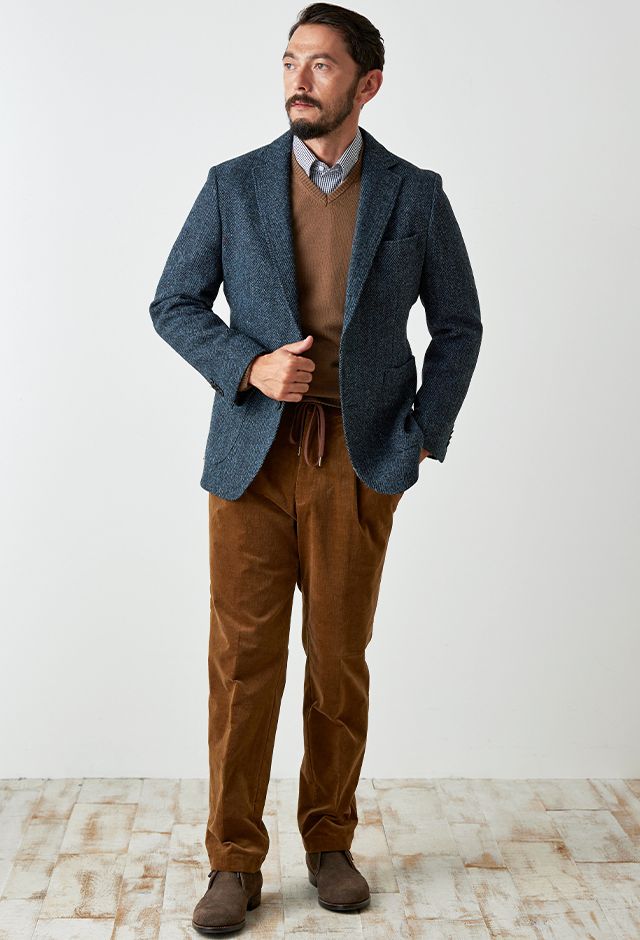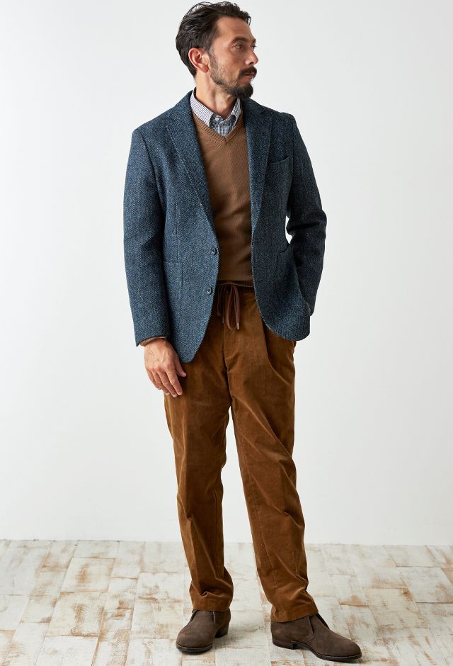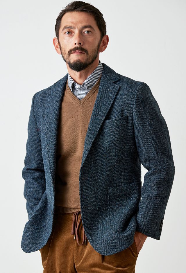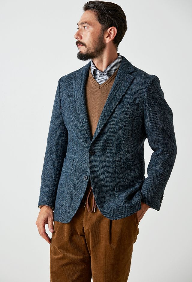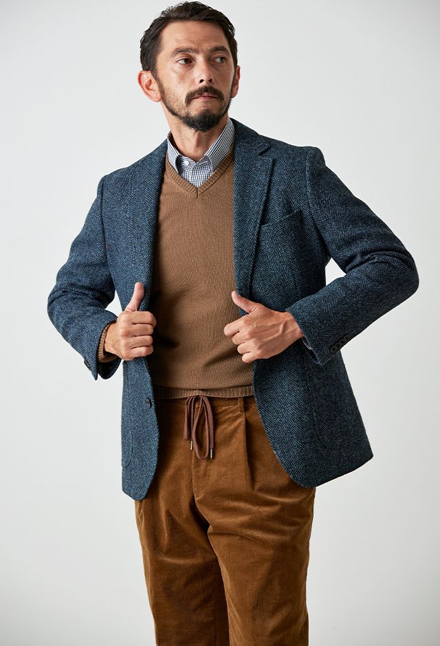 世界で唯一国に保護されている伝統的な生地ブランド「ハリスツイード」で仕立てたスーツです。グリーン寄りネイビー×ヘリンボーンのツイードスタイルで、秋冬シーズンの生地になります。肩パットや芯地を極力排したアンコンモデルでジャケットを仕立てました。袖口のダークトーンのボタンを重ね付けにすることで、さりげない立体感をプラス。ディテールへのこだわりが、ジャケット全体の上質さを引き立てます。カジュアルながら上質感があるコーデュロイパンツで季節感も抜群です。