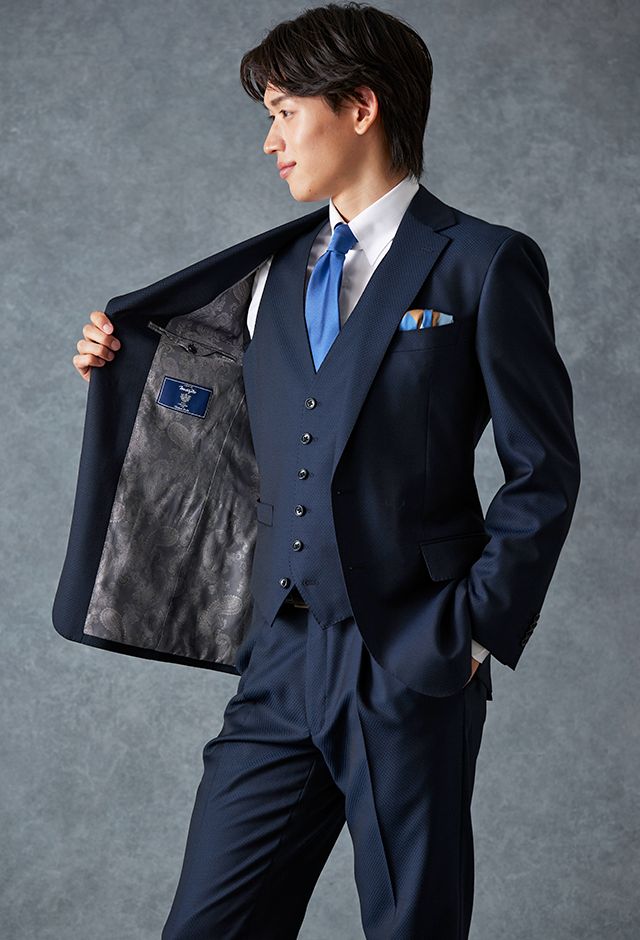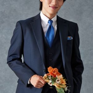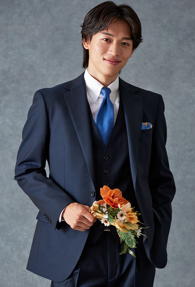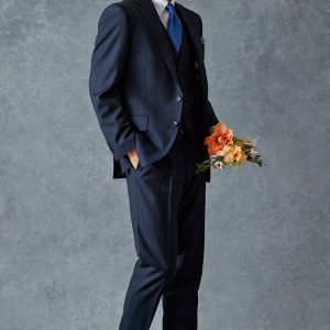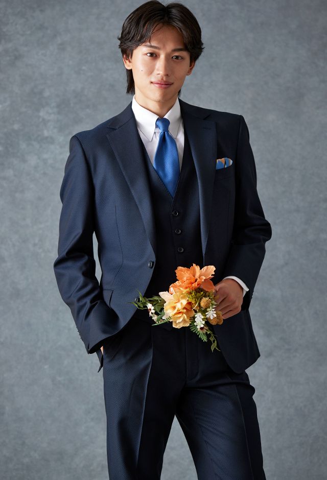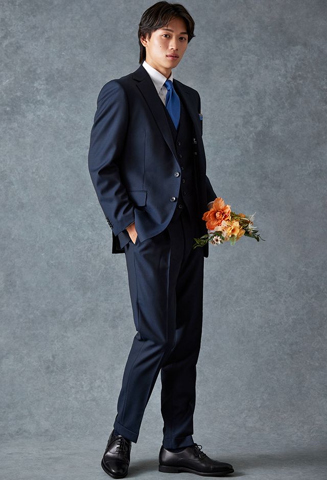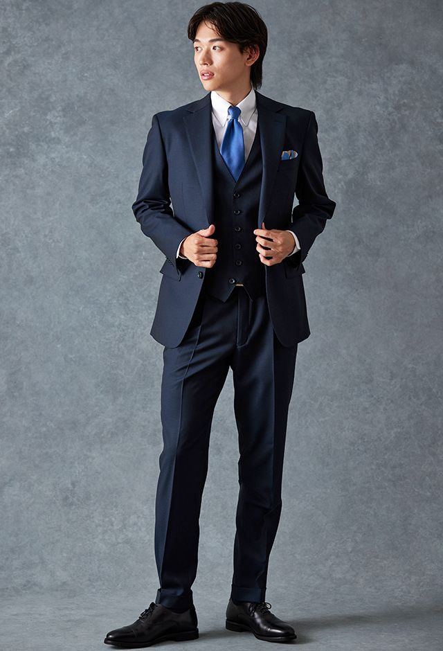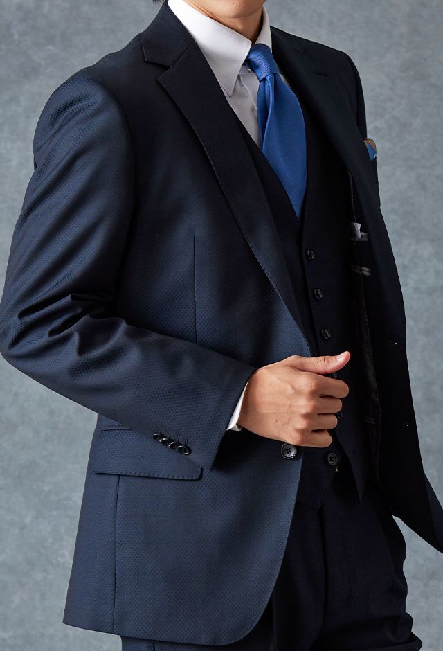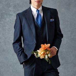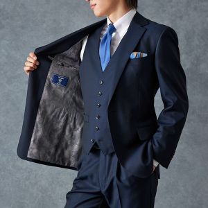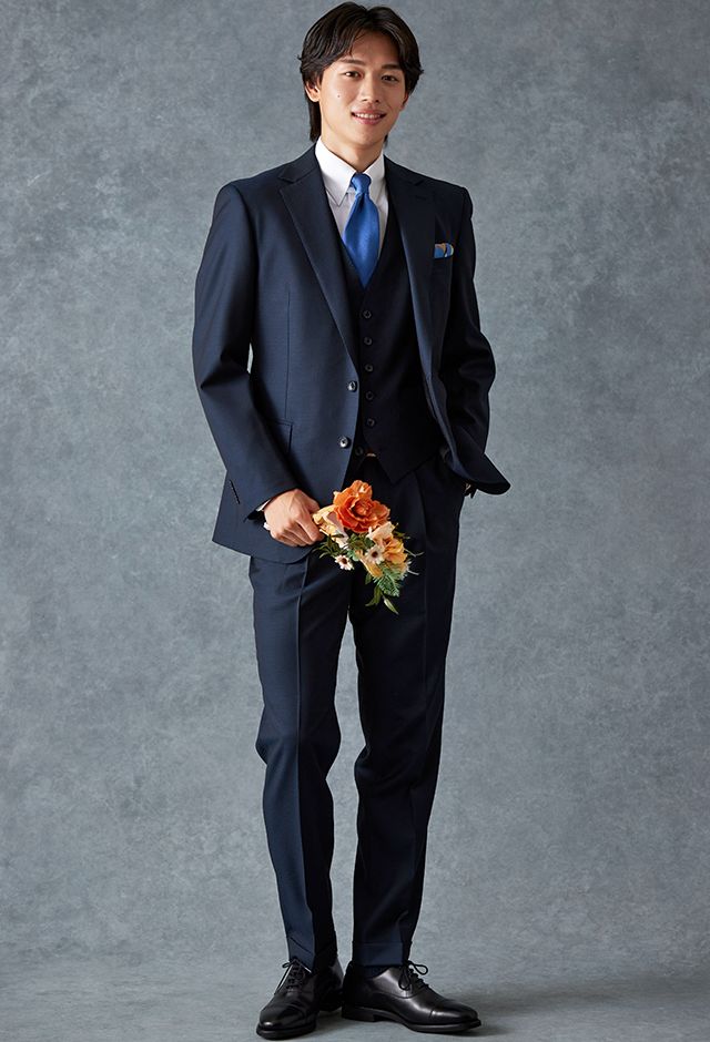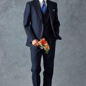 トレンドをふんだんに取り入れたデザイン性が特徴の「マルゾット」で仕立てたスーツです。無地組織柄のブルーグレーで、オールシーズン着用していただけます。クラシックな部分とセクシーさを融合したモダンクラシックモデルで仕立てました。袖口の4つボタンがスマートな表情に。シンプルなシングルベストで仕立てた、時代に左右されないスリーピース。ホワイトシャツにブルー無地のネクタイと黒の革靴というオーソドックスながら、ビジネスにも結婚式参列にも使いやすいコーデです。▶ボトムス生地のスーツスタイルを見る