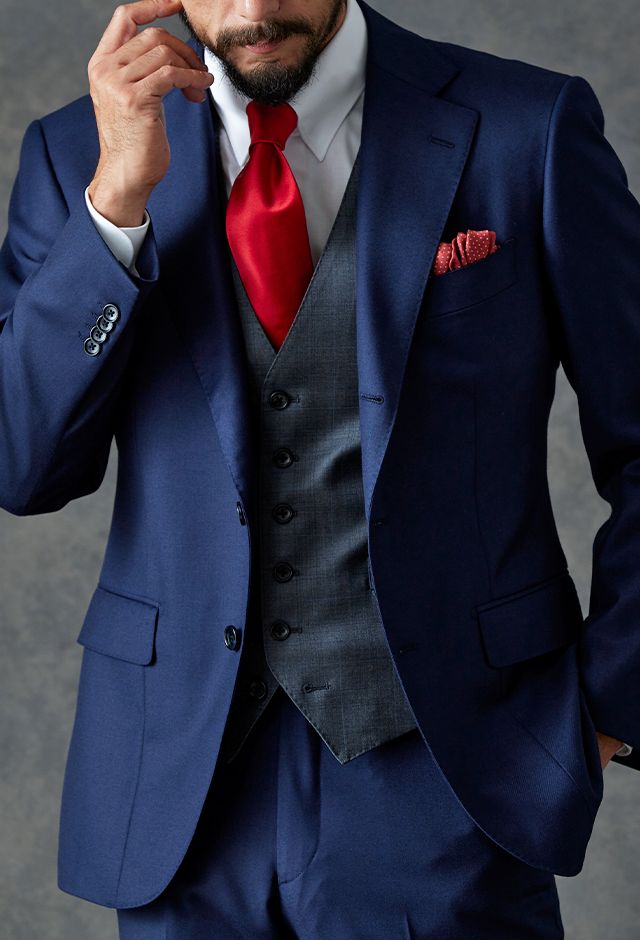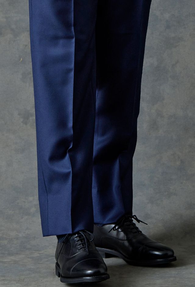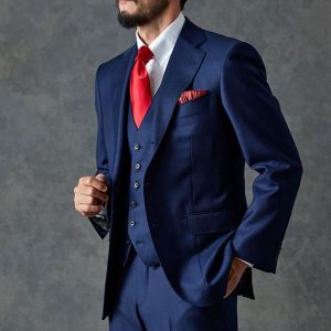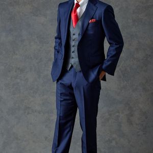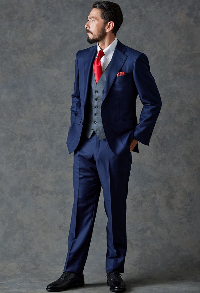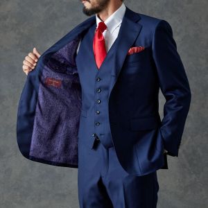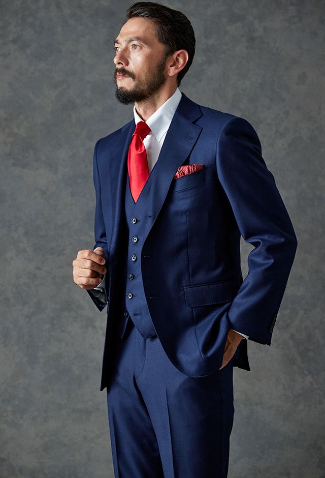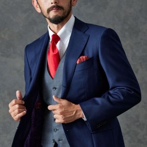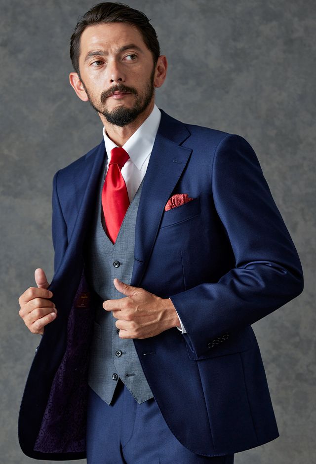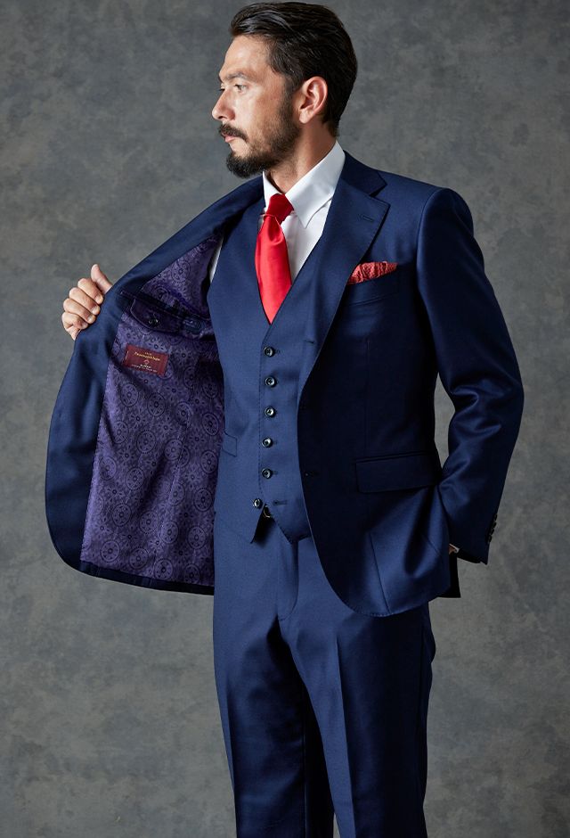 イタリアの高級生地ブランド「クロス エルメネジルド ゼニア」で仕立てたスーツです。上品な艶感が特徴のネイビー無地で、オールシーズン着用していただけます。最高峰グレードの「カイザーモデル」で極上の着心地を味わうことが出来ます。裏地にはパープルのオリエンタル柄を採用し、エレガントな華やかさを演出。ビジネスシーンにはスリーピーススーツ、フォーマシーンでは色違いのベストを用いたオッドベストスタイルで幅広いシーンに重宝します。