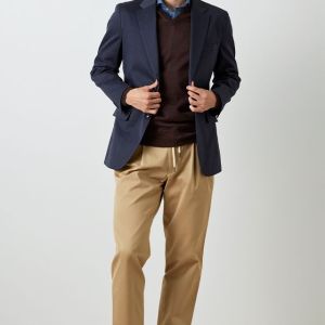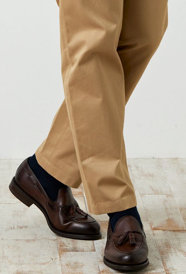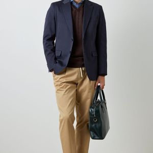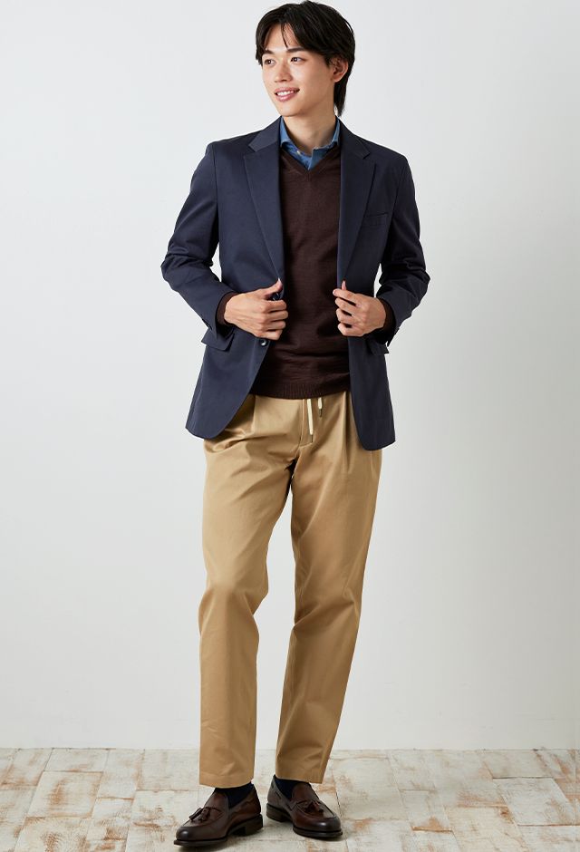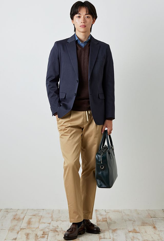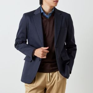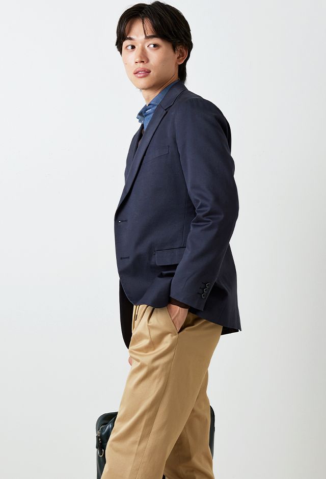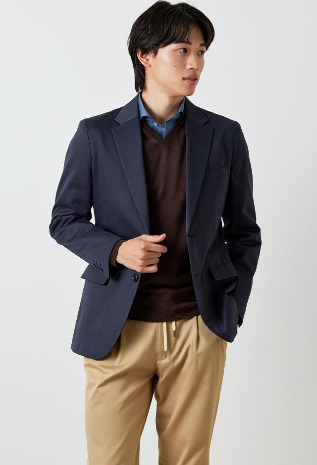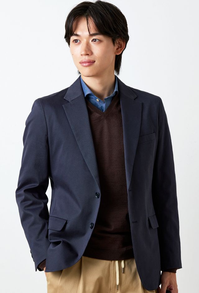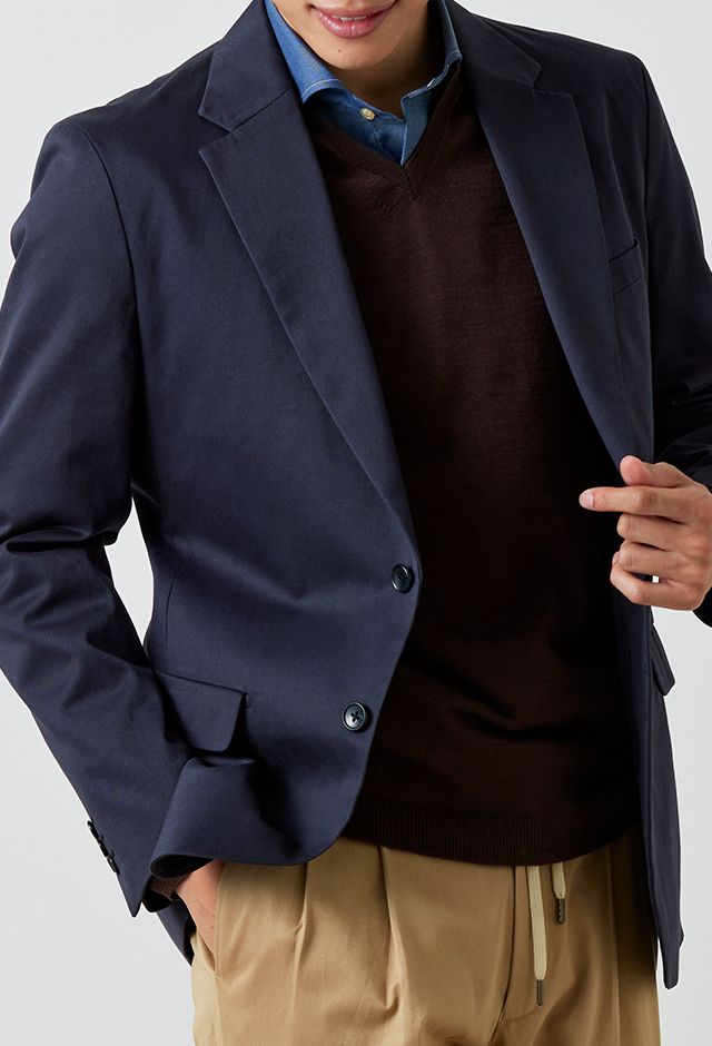 老舗英国ブランドならではの柔らかな肌触りと重厚感が特徴の「ブリスベンモス」で仕立てたスーツです。表情のあるコットンのネイビーでオールシーズン着用していただけます。空気を纏うような着心地を楽しむアンコンモデルでジャケットを仕立てました。ステッチをあえて入れないことで、どんなアイテムとも合わせやすい仕様に。ナチュラルな印象の青シャツに、ネイビー、ブラウン、ベージュをバランス良く組み合わせたビジカジとして重宝するコーデです。