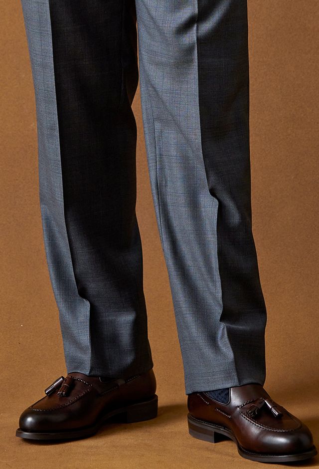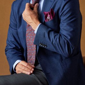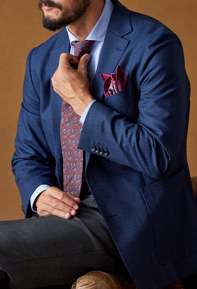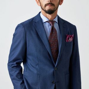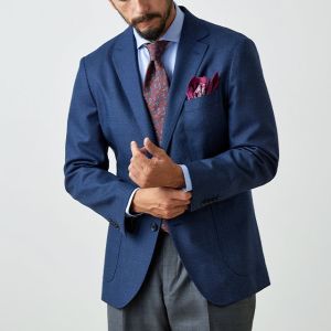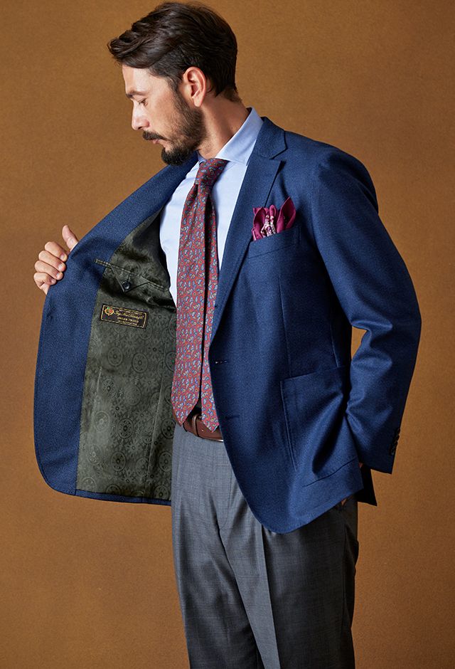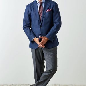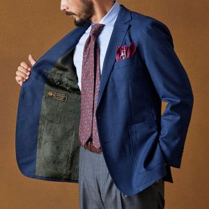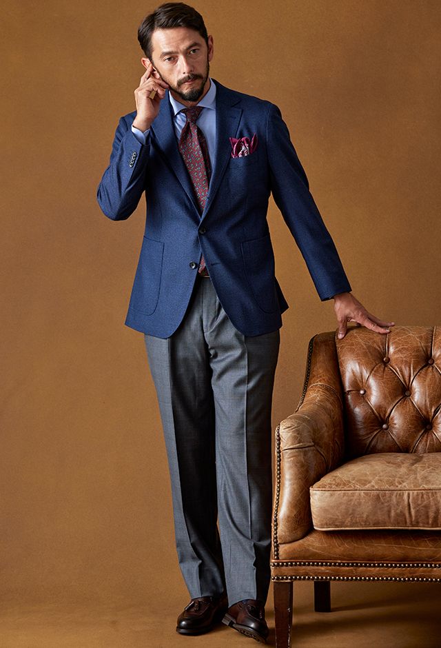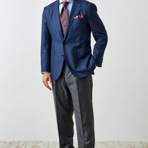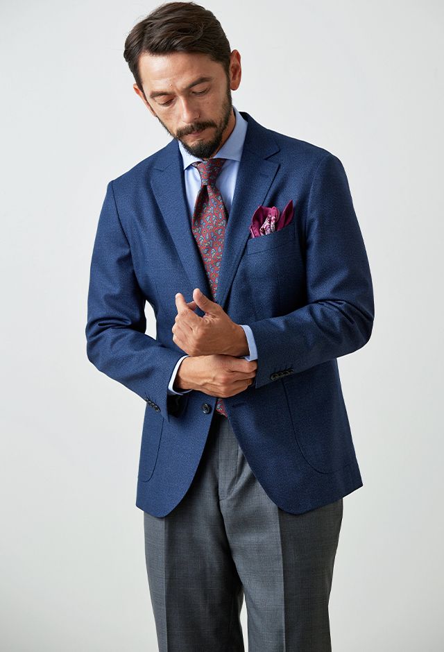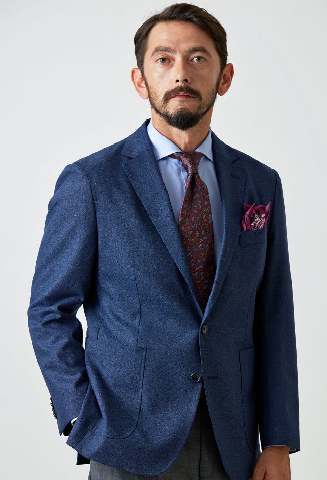 世界中のセレブリティから支持を得ているラグジュアリーブランド「ロロ・ピアーナ」で仕立てたスーツです。ビジネスシーンにぴったりの、シンプルなブルー無地で、オールシーズン着用していただけます。肩パットや芯地を極力排したアンコンモデルでジャケットを仕立てました。ジャケットにはアウトポケット・ハコポケットで全体的に扱いやすく程良いカジュアルな印象に。スーツと同系色のブルーシャツに、暖色のペイズリー柄ネクタイとチーフを合わせることで、上品でまとまりのあるスタイルに仕上げています。
