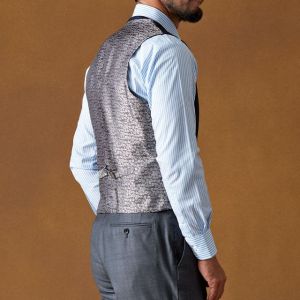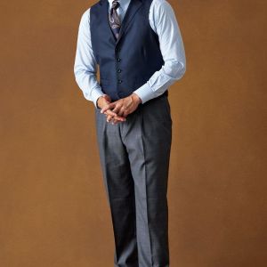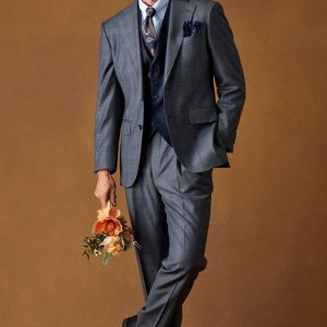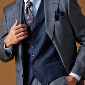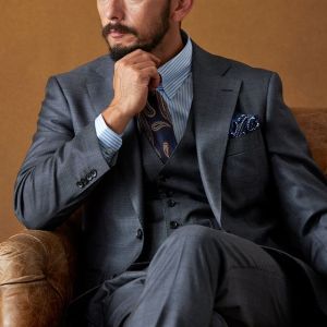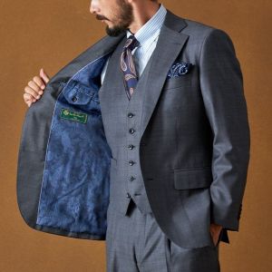 世界中のセレブリティから支持を得ているラグジュアリーブランド「ロロ・ピアーナ」で仕立てたスーツです。艶感のあるグレーにグレンチェックが入ったスタイルで、オールシーズン着用していただけます。カイザーレジェロモデルで、一度羽織ると手放せなくなる軽い着心地を感じていただけます。ジャケットはスタンダードなノッチドラペルを採用し、ビジネスシーンにも適した端正なデザインに。さらにベストをジャケットと異なるカラーにすることで、奥行きのあるスタイルが実現。大人の遊び心が感じられるコーディネートです。