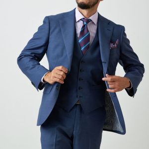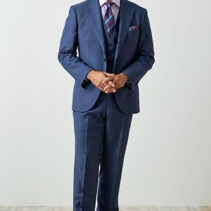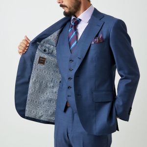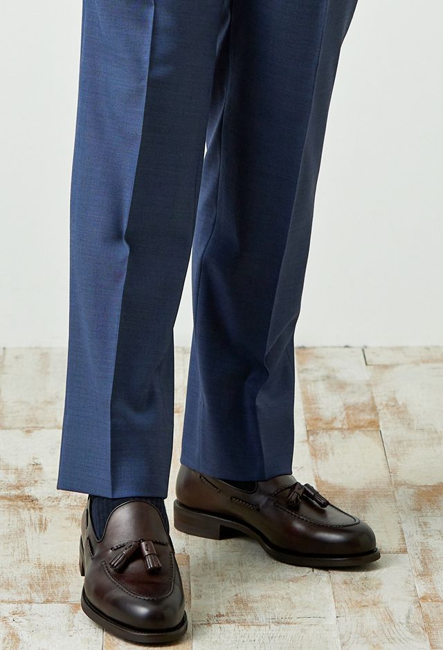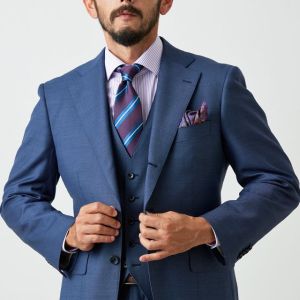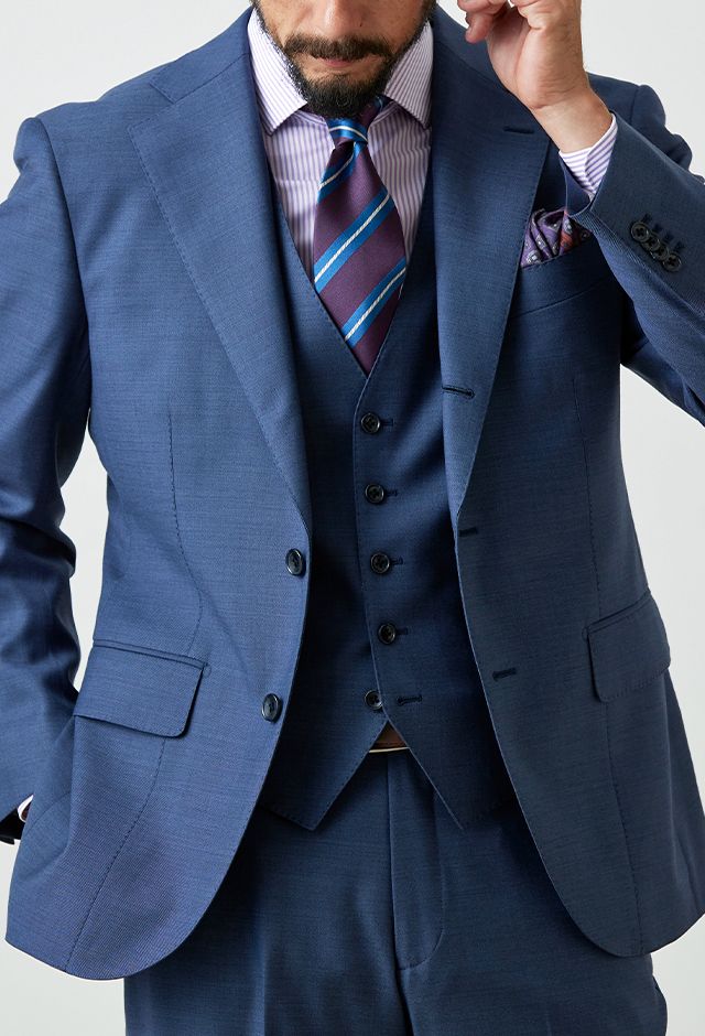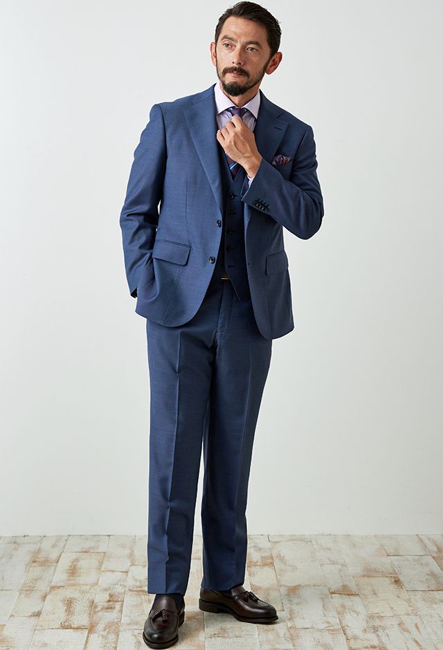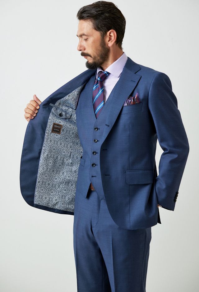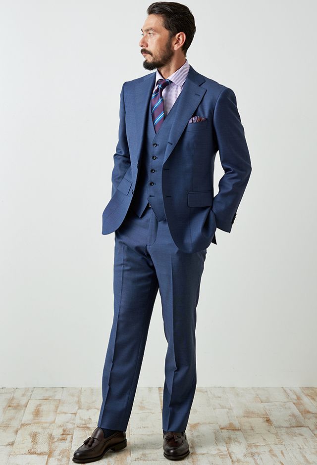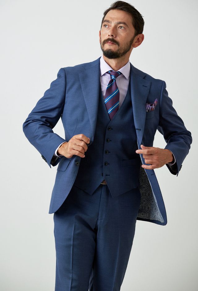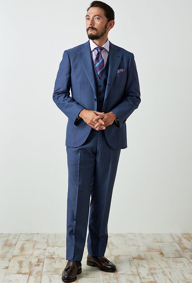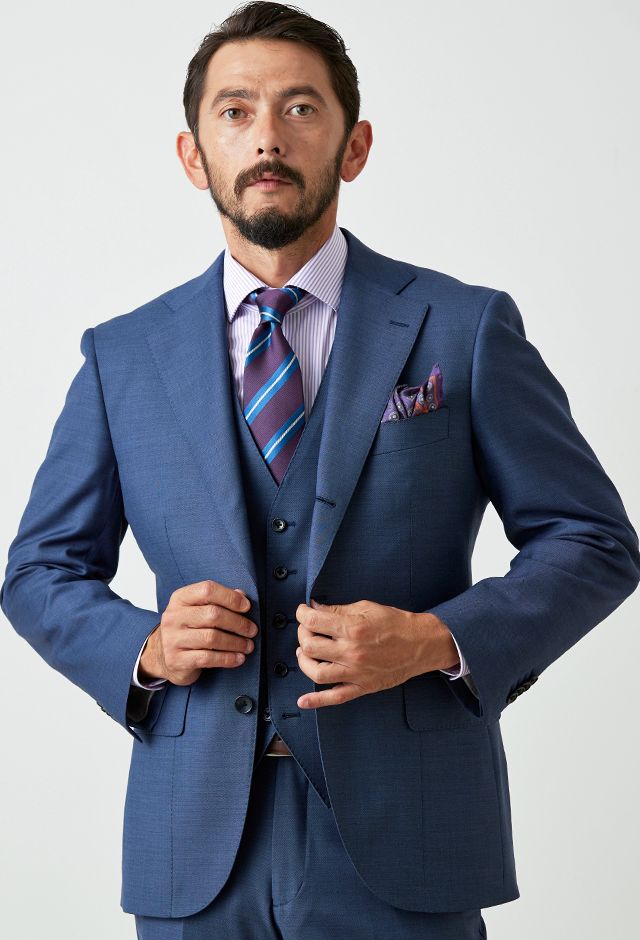 雨が多く多湿な気候を有する市場においても絶大な評価を獲得している「ドラゴ」で仕立てたスーツです。鮮やかなブルーグレーに艶感のあるシャークスキンを合わせたスタイルで、オールシーズン着用していただけます。カイザーレジェロモデルで、一度羽織ると手放せなくなる軽い着心地を感じていただけます。ジャケットにはAMF(手縫い風のステッチ)で程よいカジュアルさをプラス。パープルのストライプシャツと合わせることで上品な華やかさをプラスし、色気のあるコーデに仕上げました。