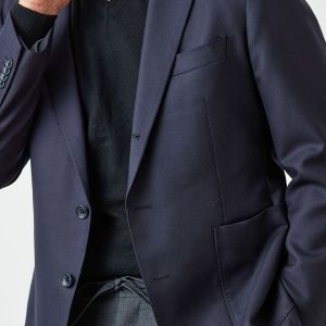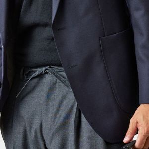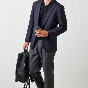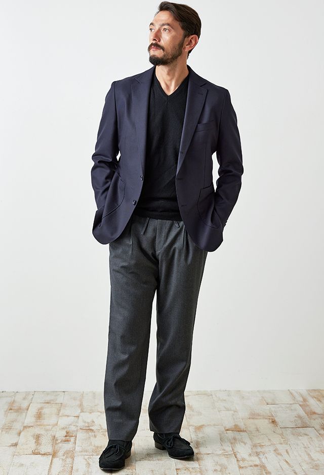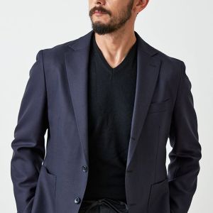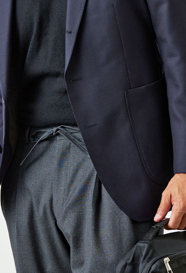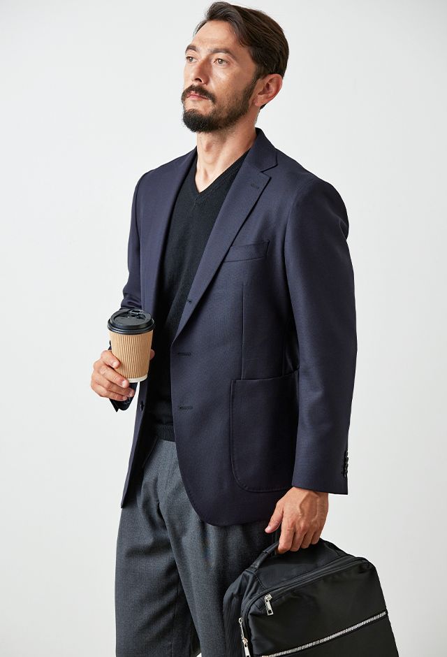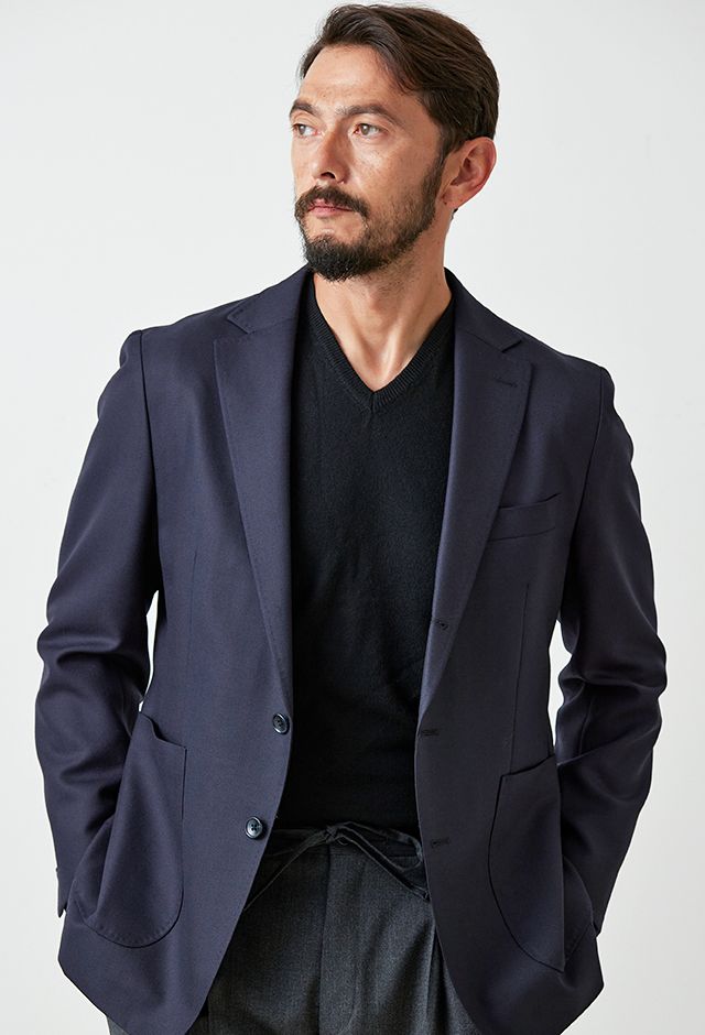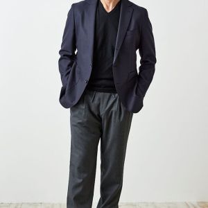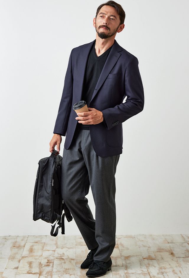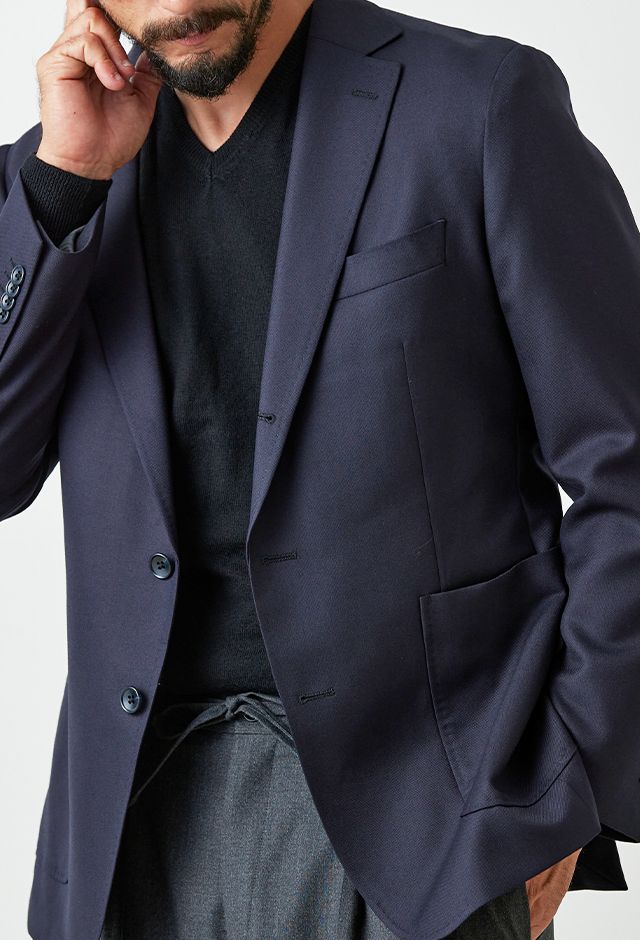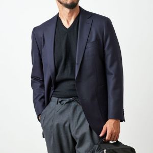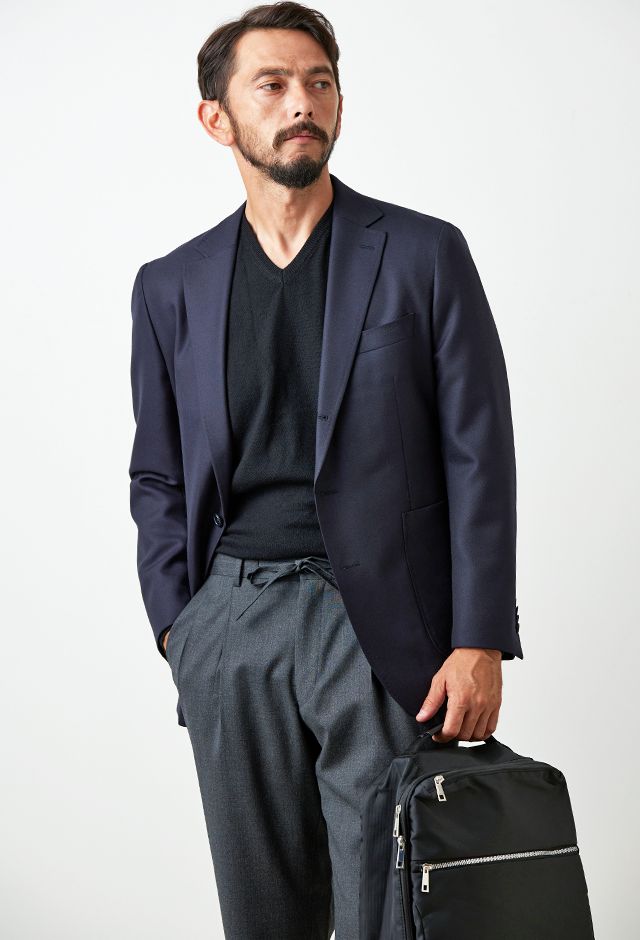 高品質でコストパフォーマンスに優れたイタリアブランド「カノニコ」で仕立てたスーツです。使いやすく人気のネイビー無地のスタイルで、オールシーズン着用していただけます。肩パットや芯地を極力排したアンコンモデルでジャケットを仕立てました。アウトポケットを採用し、堅すぎず程よい軽やかさをプラス。濃いグレーのスラックスにブラックのVネックニットを合わせることで、ビジネスにもオフにも使える万能なコーディネートに仕上げました。