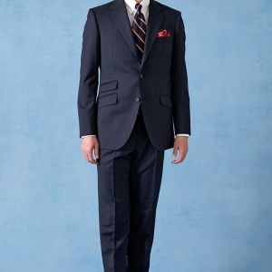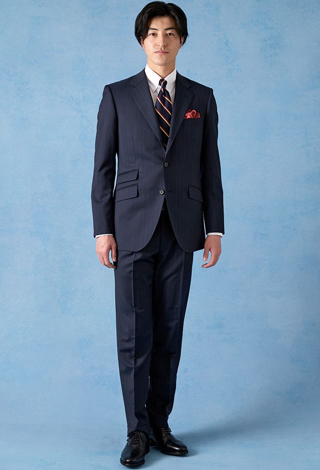 トレンドをふんだんに取り入れたデザイン性が特徴の「マルゾット」で仕立てたスーツです。ブルーグレーの生地にすっきりとしたストライプが走り、スマートで誠実な印象を与えるスタイルで、オールシーズン着用していただけます。人気の英国系デザイン・モダンブリティッシュデザインで仕立てました。表地の落ち着いたトーンに対し、裏地には鮮やかなスカイブルーをセレクト。ホワイトシャツにレジメンタルタイを合わせた王道スタイルで、日常の装いを格上げし、どんな場面でも品良く馴染むコーディネートです。プレゼンテーションや来客対応といった、誠実さと親しみやすさを両立させたいビジネスシーンに最適です。