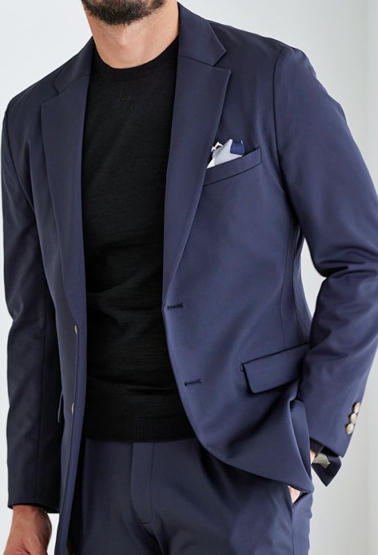オーダースーツ専門店が仕立てる、「Y.E」デザインで仕立てました。軽やかさと上品さを両立した、程よい光沢感のあるネイビーカラーの生地で、オールシーズン着用していただけます。軽くて着心地の良い、サラリとした肌触りのセットアップスーツ専用生地で仕立てたセットアップです。袖口は軽快さを感じさせる3つボタン仕様。セットアップの軽やかなラインと相まって、リラックス感のある印象を演出します。ニットと革靴を同色で揃えることで、カジュアルながら統一感のある印象に仕上がります。