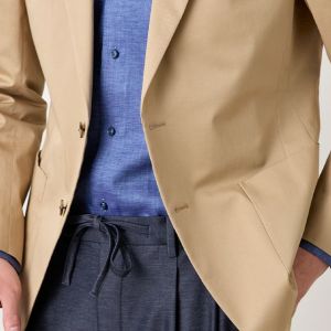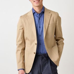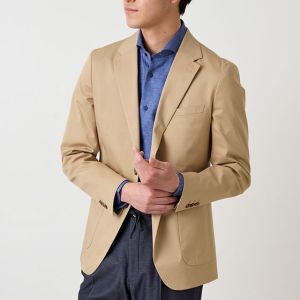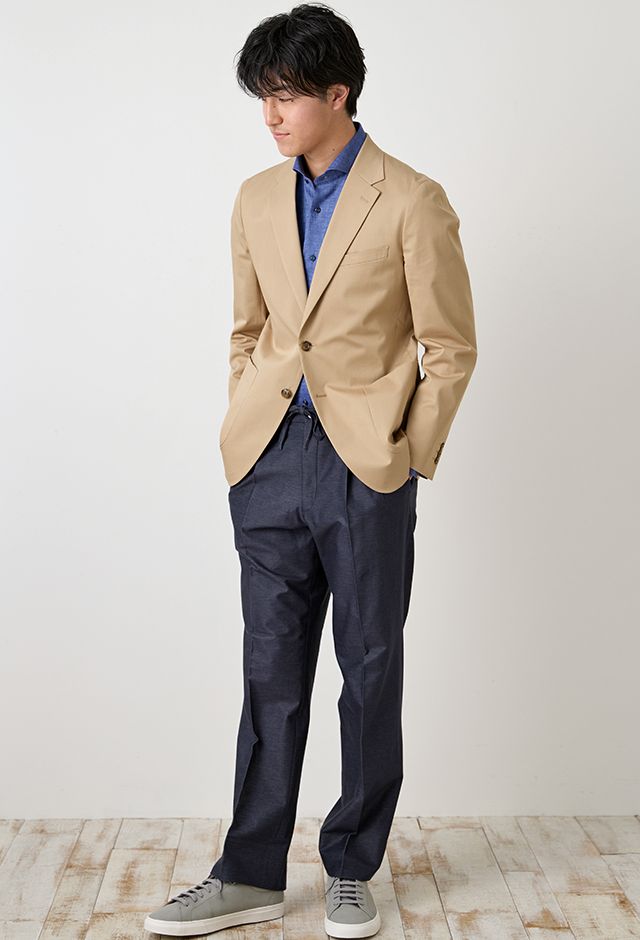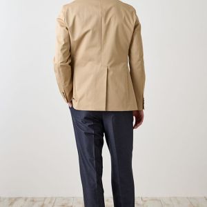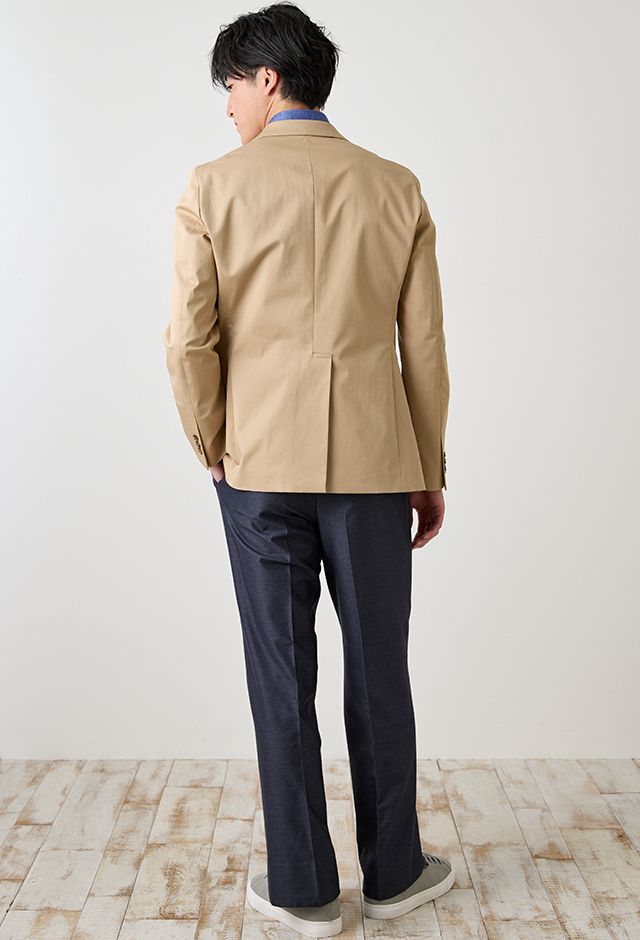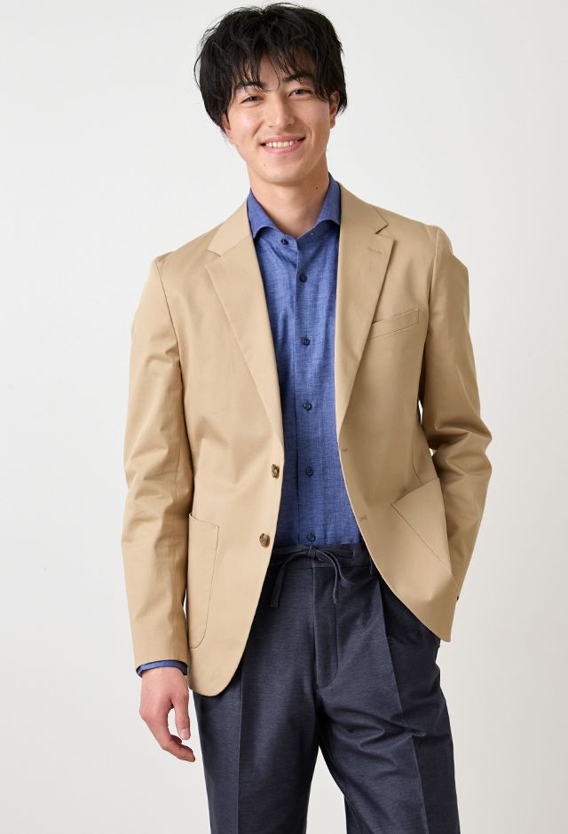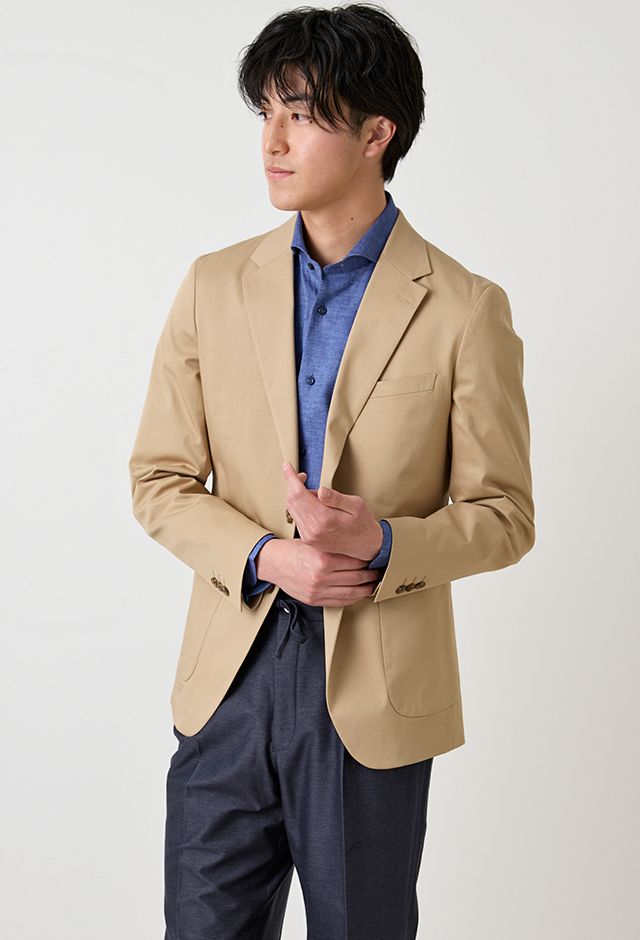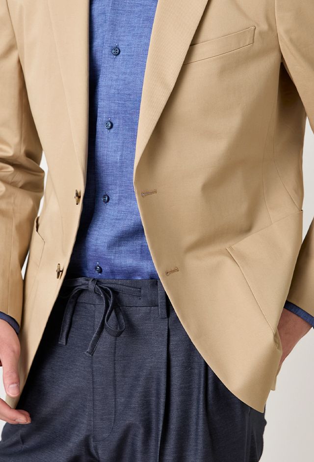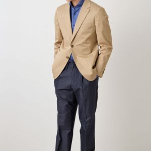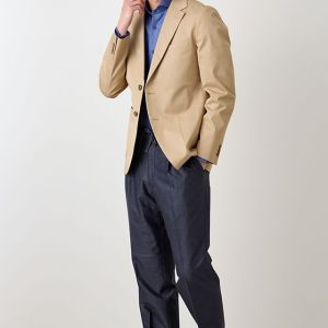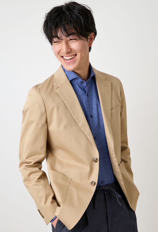 コットン系素材のバリエーションが豊富で、ファンシーなものや特徴的な柄ものを得意とする「ソンドリオ」で仕立てたスーツです。柔らかな印象で、季節を選ばずに着用できるベージュカラーのスタイルで、オールシーズン着用していただけます。肩パットや芯地を極力排したアンコンデザインでジャケットを仕立てました。バックスタイルには、動きやすさと軽快さを演出するセンターベントを採用。ライトカラーのジャケットにデニム風のスラックスを合わせた、カフェやレストランなどのプライベートな時間にもふさわしい一着です。