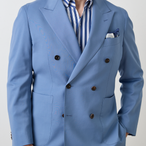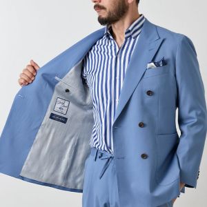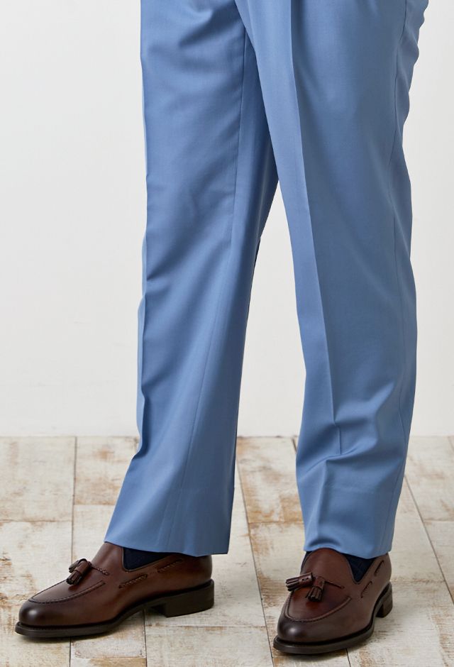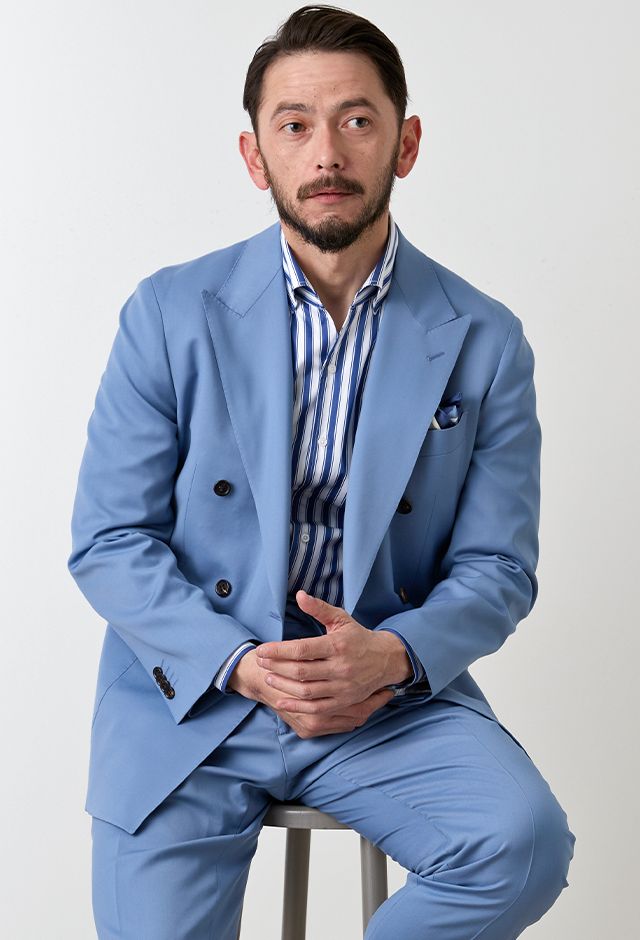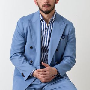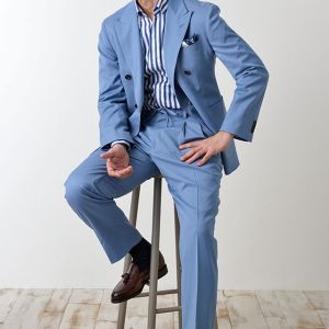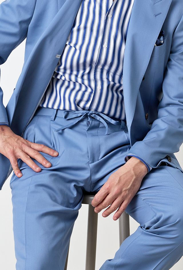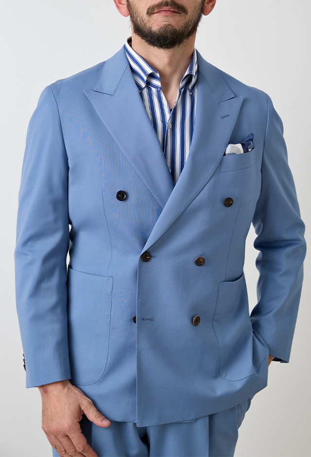 ストレッチ性の高い生地が大好評のイタリアブランド「トラバルド・トーニャ」で仕立てたスーツです。清涼感あふれる鮮やかなブルーのスタイルで、春夏シーズンの生地になります。空気を纏うような着心地を楽しむアンコンデザイン(ダブル)でジャケットを仕立てました。スーツカラーに合わせたアイテムで統一感を持たせ、軽やかな印象と快適な穿き心地を両立した、楽なのにきちんと見えるイージースラックスを採用。開放感のあるライトブルーが、リゾートや旅行など特別感のあるプライベートな時間に映える一着です。